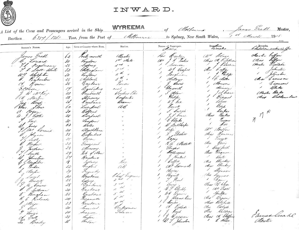 WYREEMAOF MELBOURNE, JAMES GRAHL, MASTER, BURTHEN 6337/3361 TONS FROM THE PORT OF MELBOURNE TO SYDNEY, NEW SOUTH WALES 1ST MARCH 1915 |