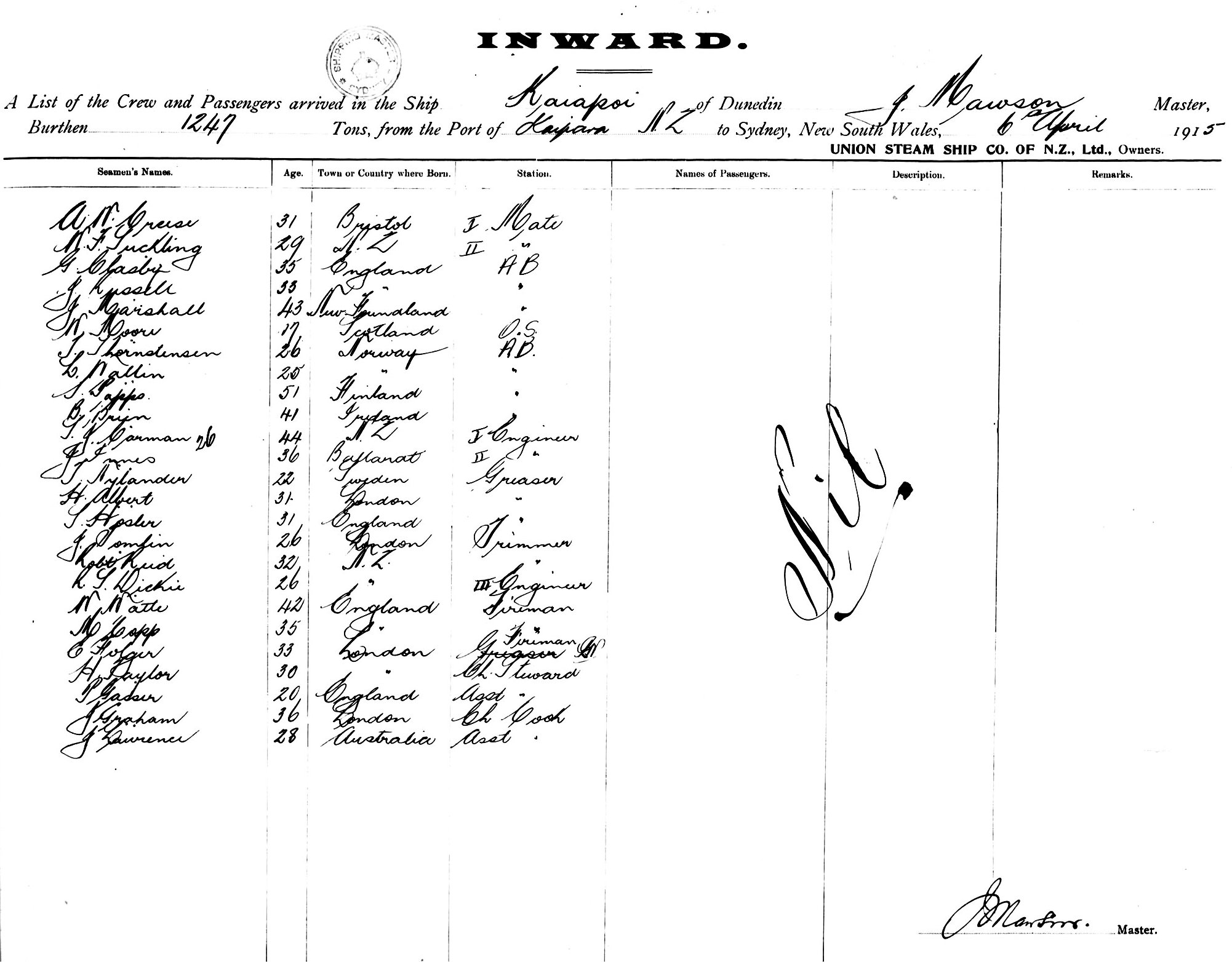 KAIAPOIOF DUNEDIN, J. MAWSON, MASTER, BURTHEN 1247 TONS FROM THE PORT OF KAIPARA, N.Z. TO SYDNEY, NEW SOUTH WALES, 6TH APRIL 1915 |