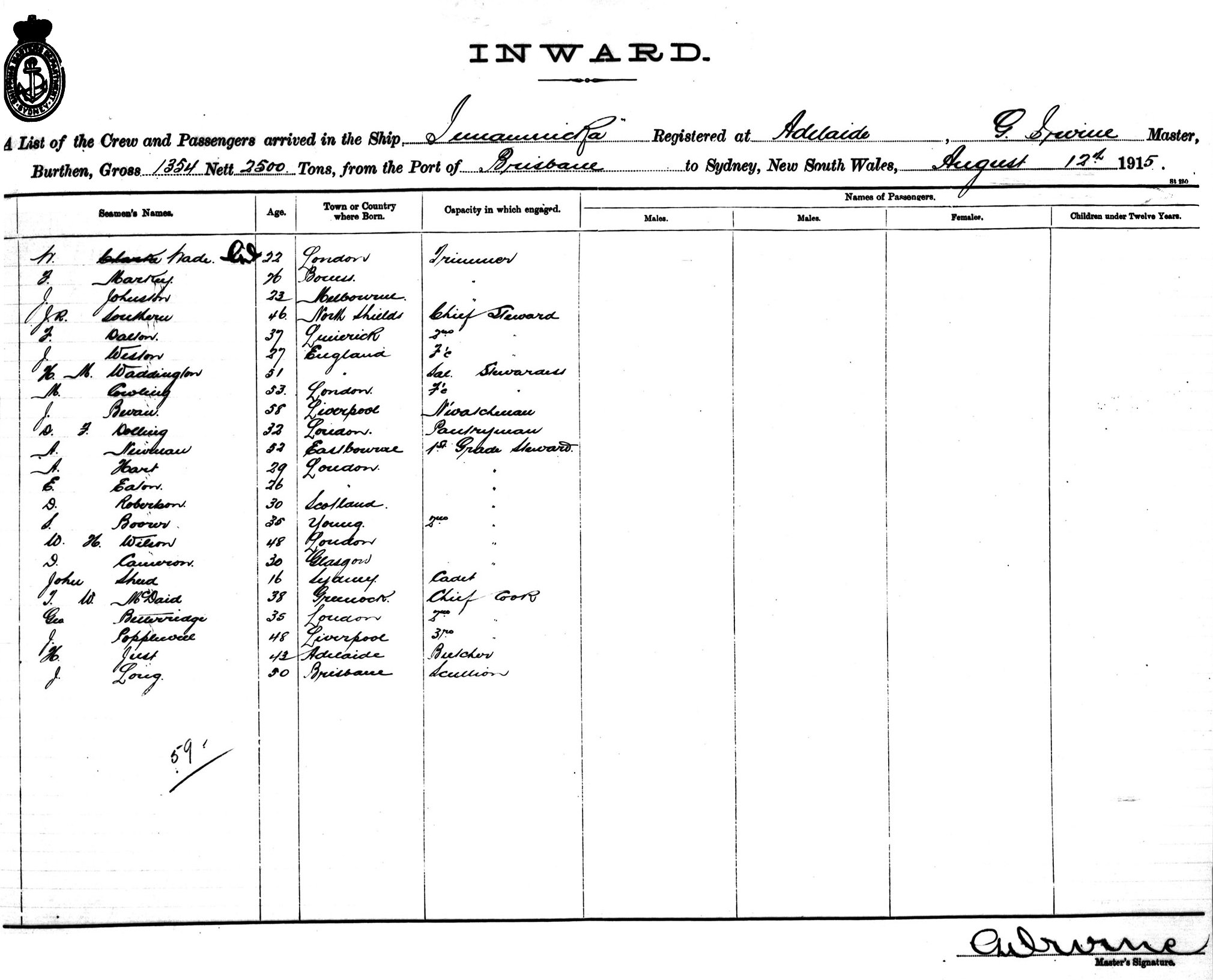 INNAMINCKAOF ADELAIDE, G. IRVINE, MASTER, BURTHEN 1354/2500 TONS FROM THE PORT OF BRISBANE TO SYDNEY, NEW SOUTH WALES, 12TH AUGUST 1915 |