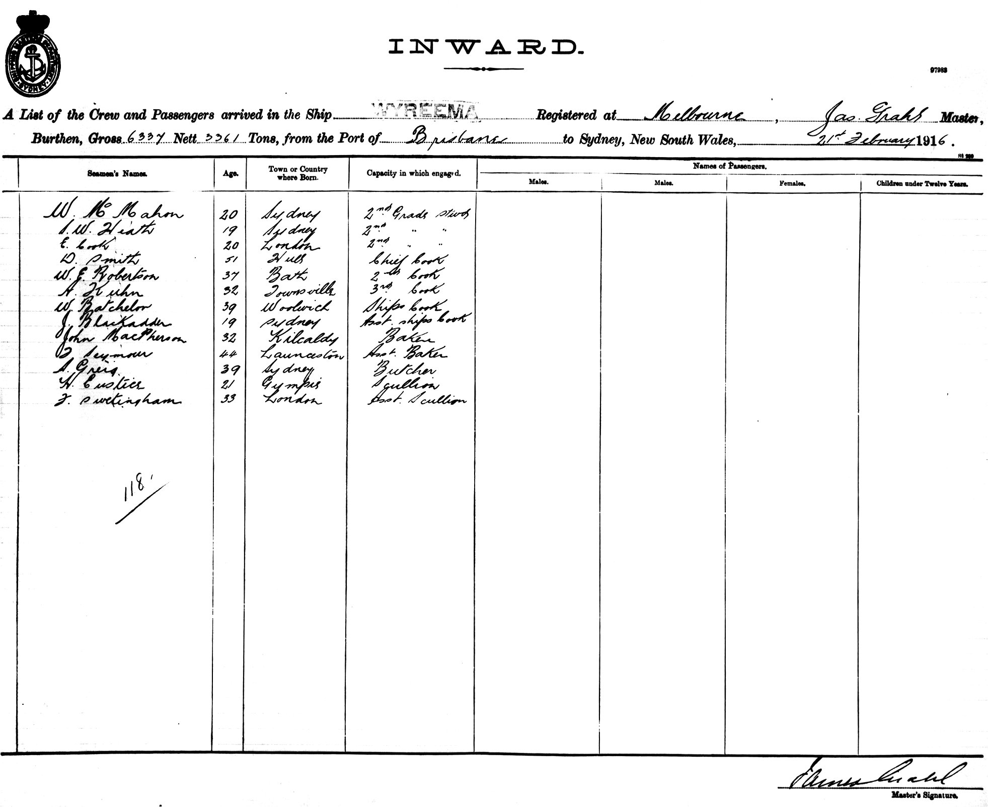 WYREEMAOF MELBOURNE, JAS. GRAHL, MASTER, BURTHEN 3361 TONS FROM THE PORT OF BRISBANE TO SYDNEY, NEW SOUTH WALES, 21 FEBRUARY 1916 |