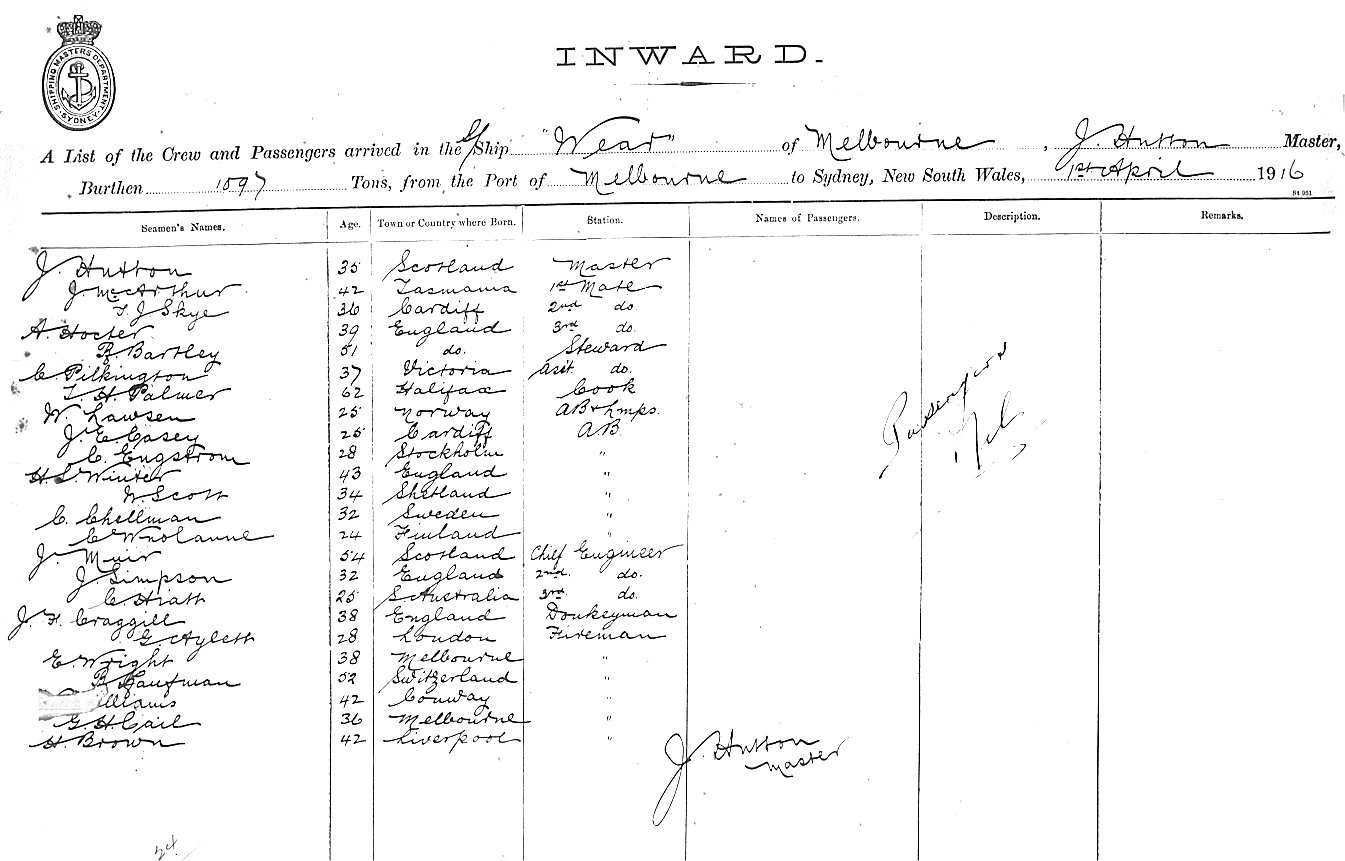 WEAROF MELBOURNE, J. HUTTON, MASTER, BURTHEN 1097 TONS FROM THE PORT OF MELBOURNE TO SYDNEY, NEW SOUTH WALES, 1ST APRIL 1916 |