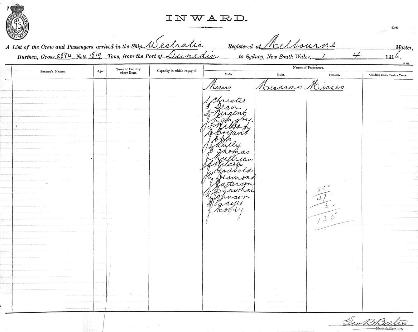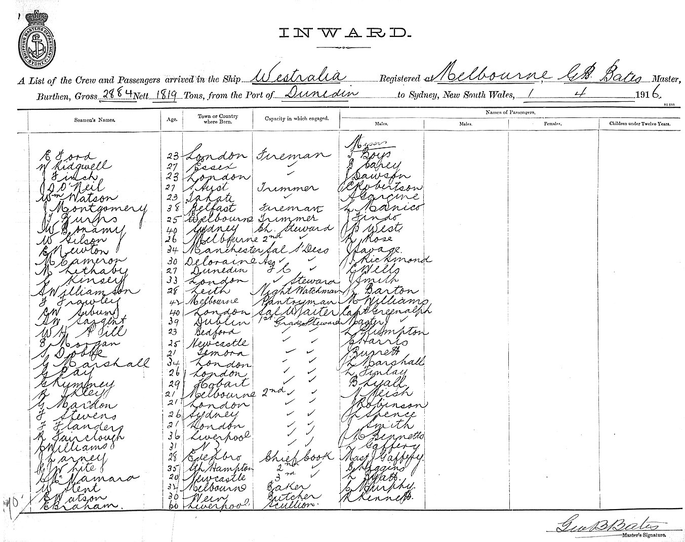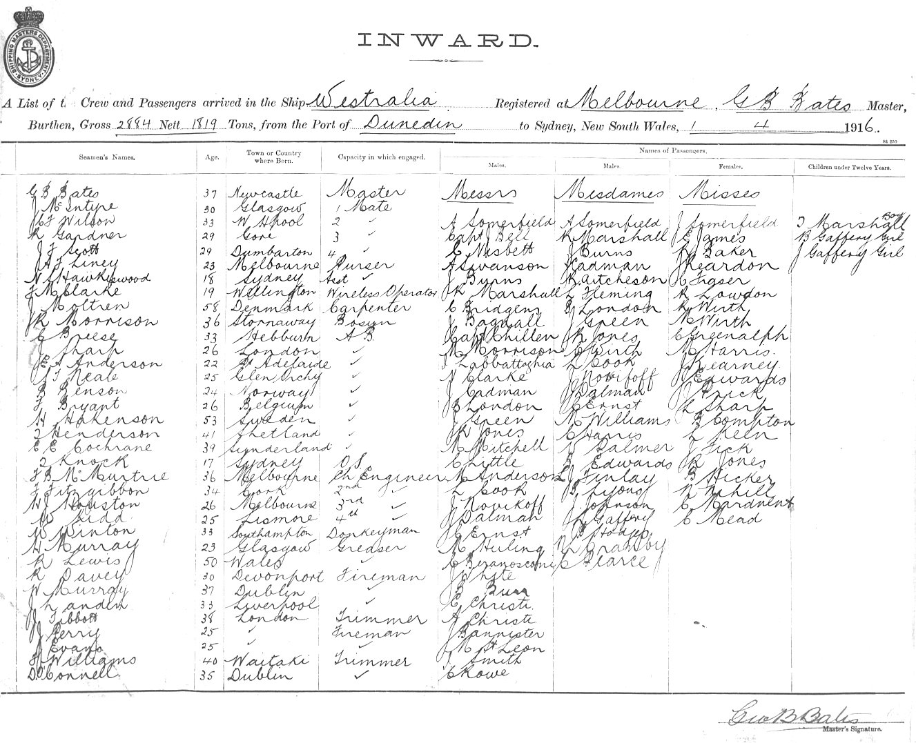 WESTRALIAOF MELBOURNE, G. B. BATES, MASTER, BURTHEN 2884/1819 TONS FROM THE PORT OF DUNEDIN TO SYDNEY, NEW SOUTH WALES, 1ST APRIL 1916 |