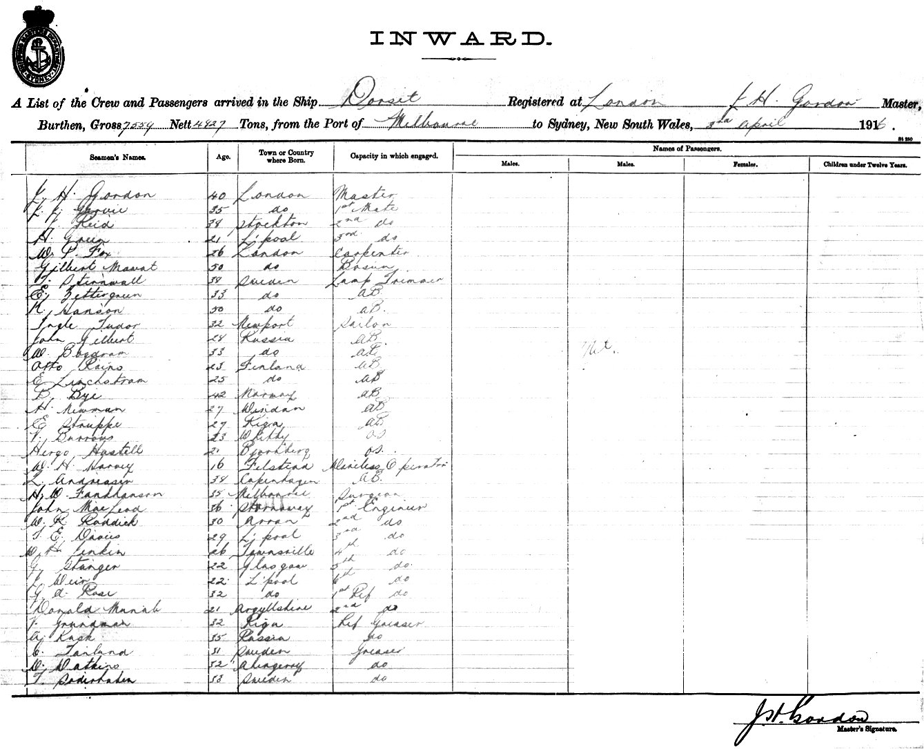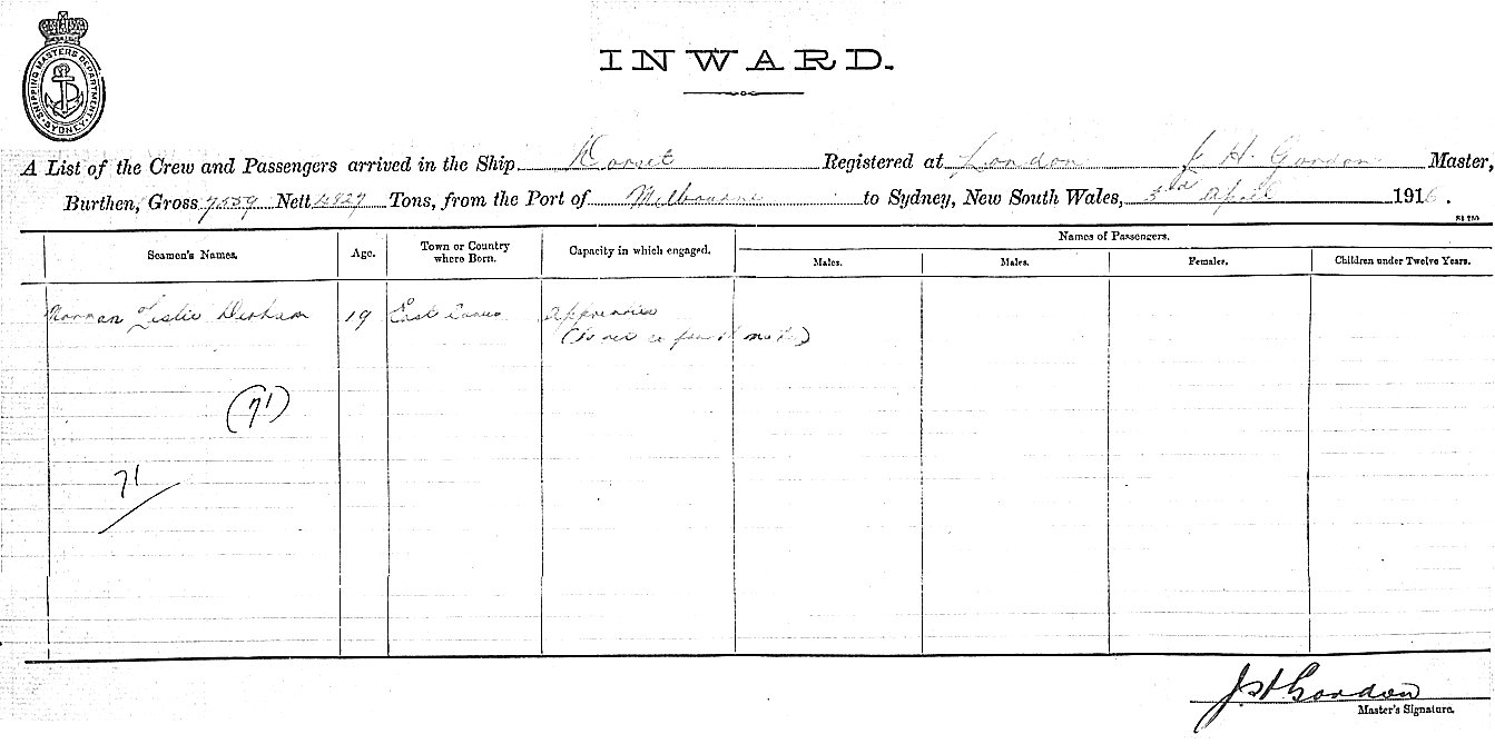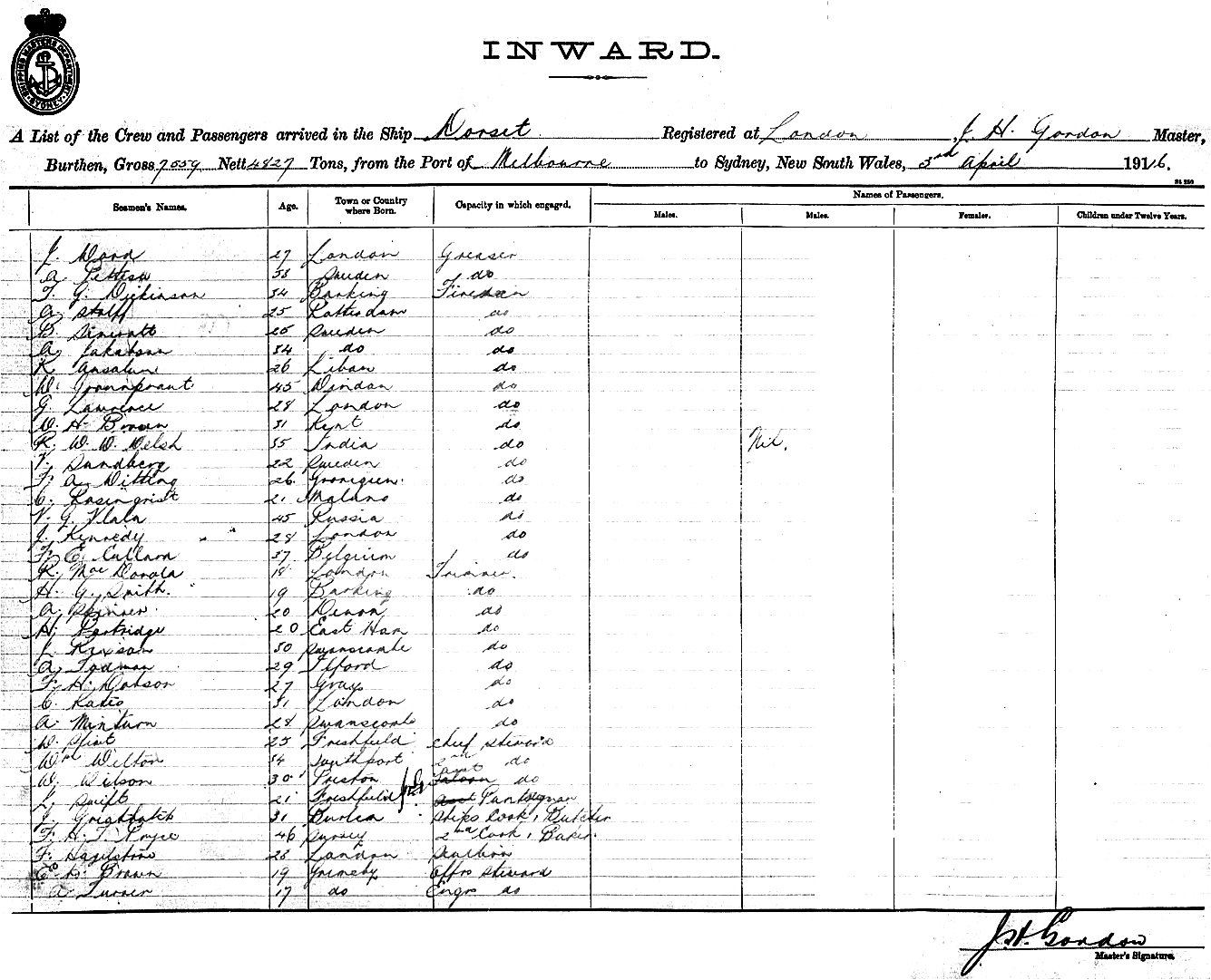 DORSETOF LONDON, J. H. GORDON, MASTER, BURTHEN 7559/4827 TONS FROM THE PORT OF MELBOURNE TO SYDNEY, NEW SOUTH WALES, 3RD APRIL 1916 |