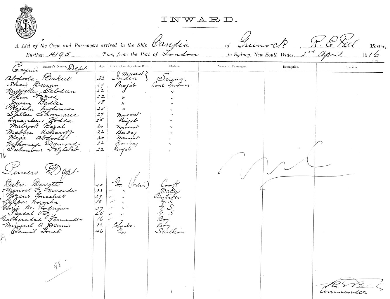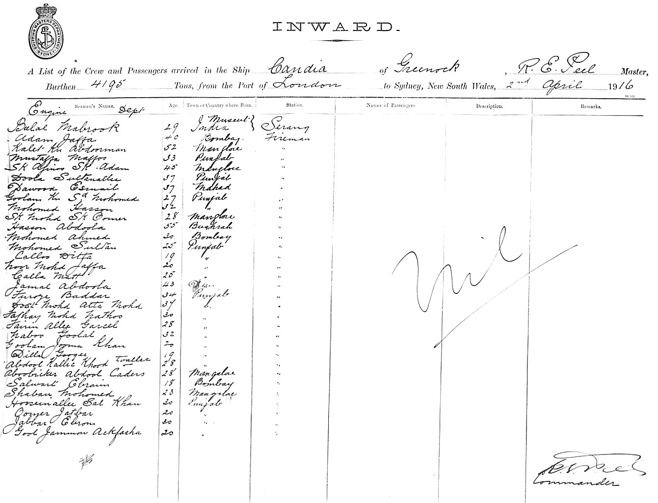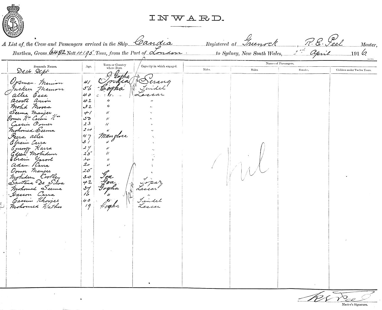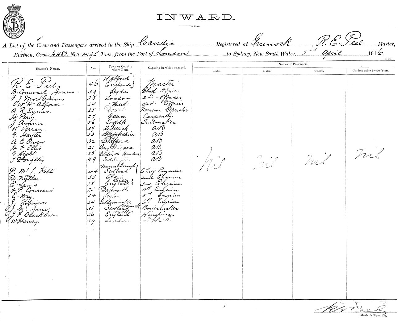 Mariners and ships in Australian Waters | CANDIAOF GREENOCK, R. E. PEEL, MASTER, BURTHEN 6482/4195 TONS FROM THE PORT OF LONDON TO SYDNEY, NEW SOUTH WALES, 2ND APRIL 1916 |