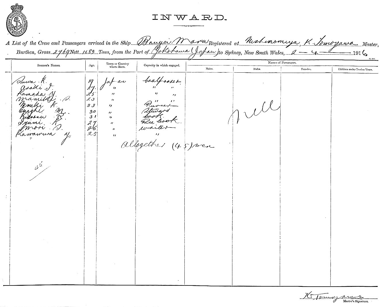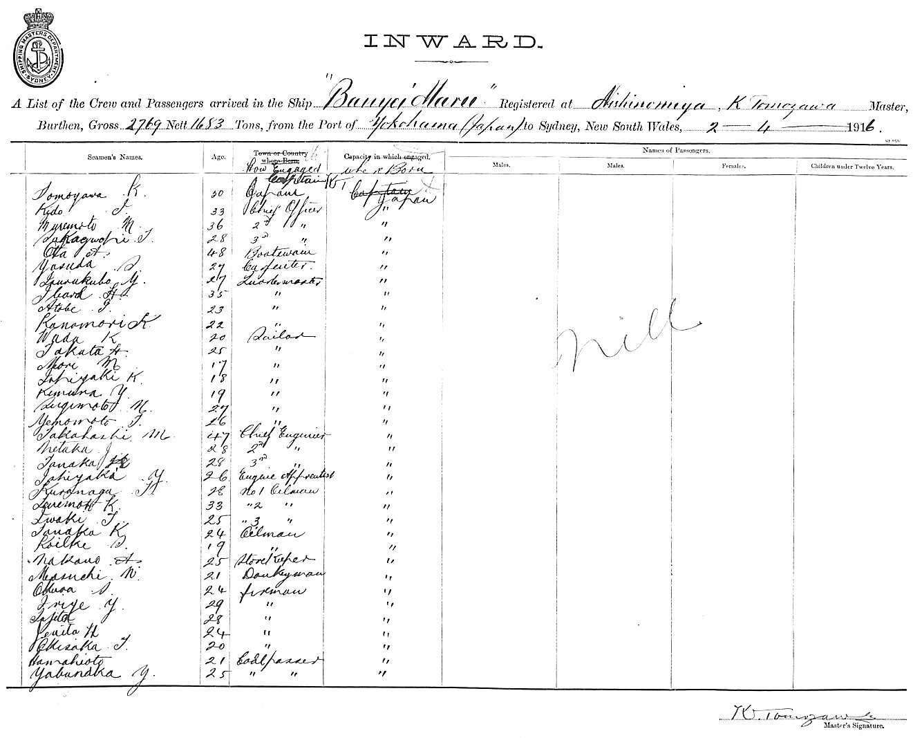 BANYEI MARUOF NISHINOMIYA, K. TOMOZAWA MASTER, BURTHEN 2769/1683 TONS FROM THE PORT OF YOKOHAMA, JAPAN TO SYDNEY, NEW SOUTH WALES, 2ND APRIL 1916 |