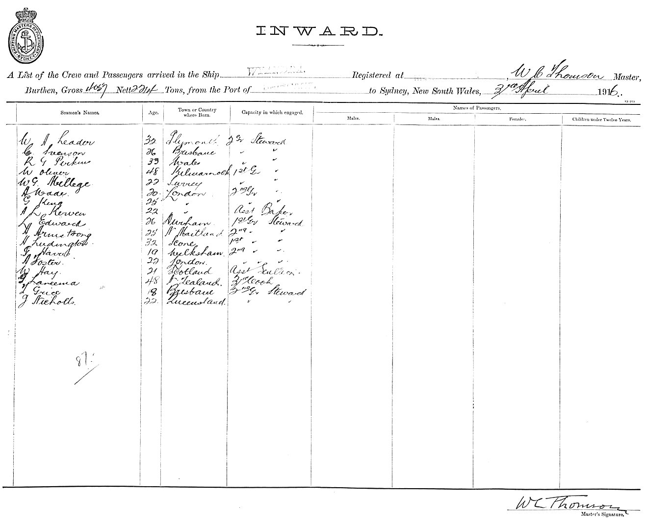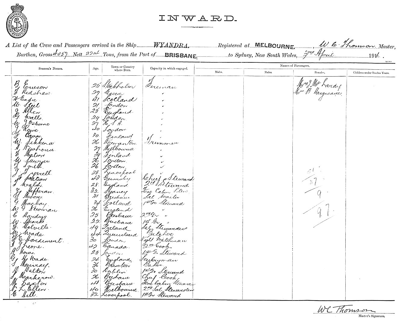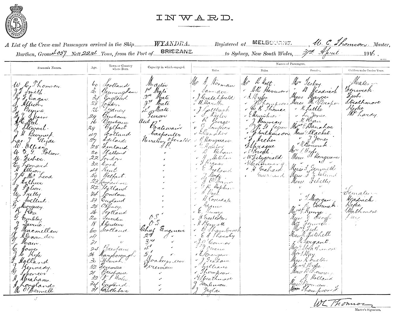 WYANDRAOF MELBOURNE, W. C. THOMSON, MASTER, BURTHEN 4057/2214 TONS FROM THE PORT OF BRISBANE TO SYDNEY, NEW SOUTH WALES, 3RD APRIL 1916 |