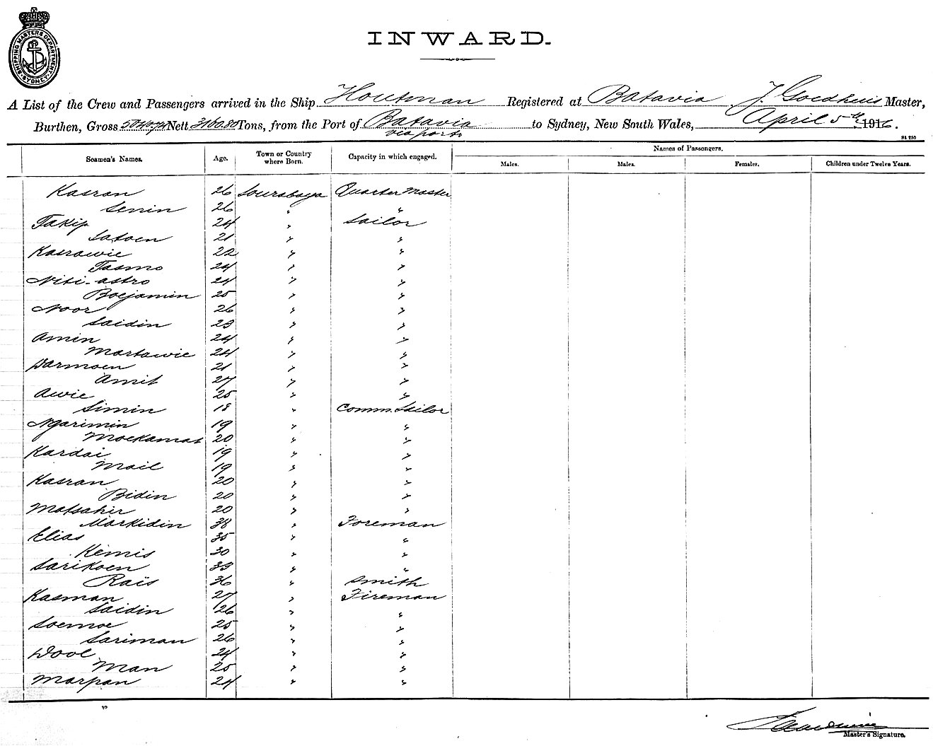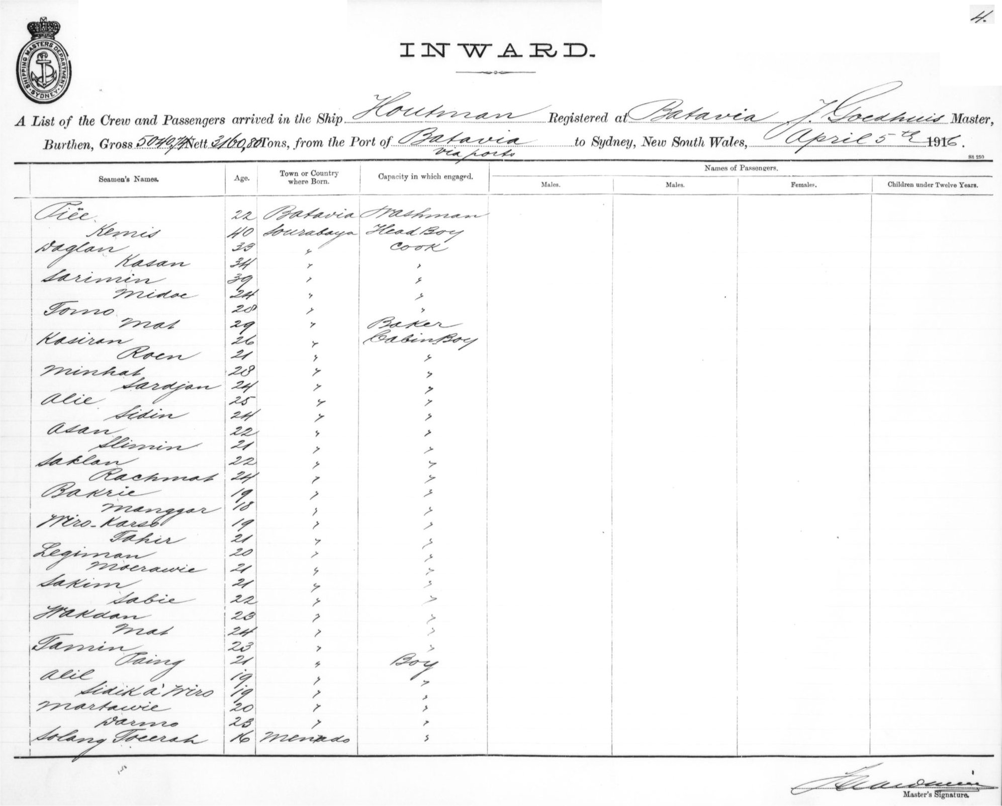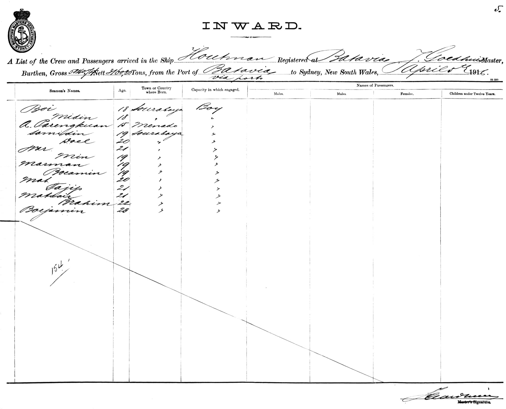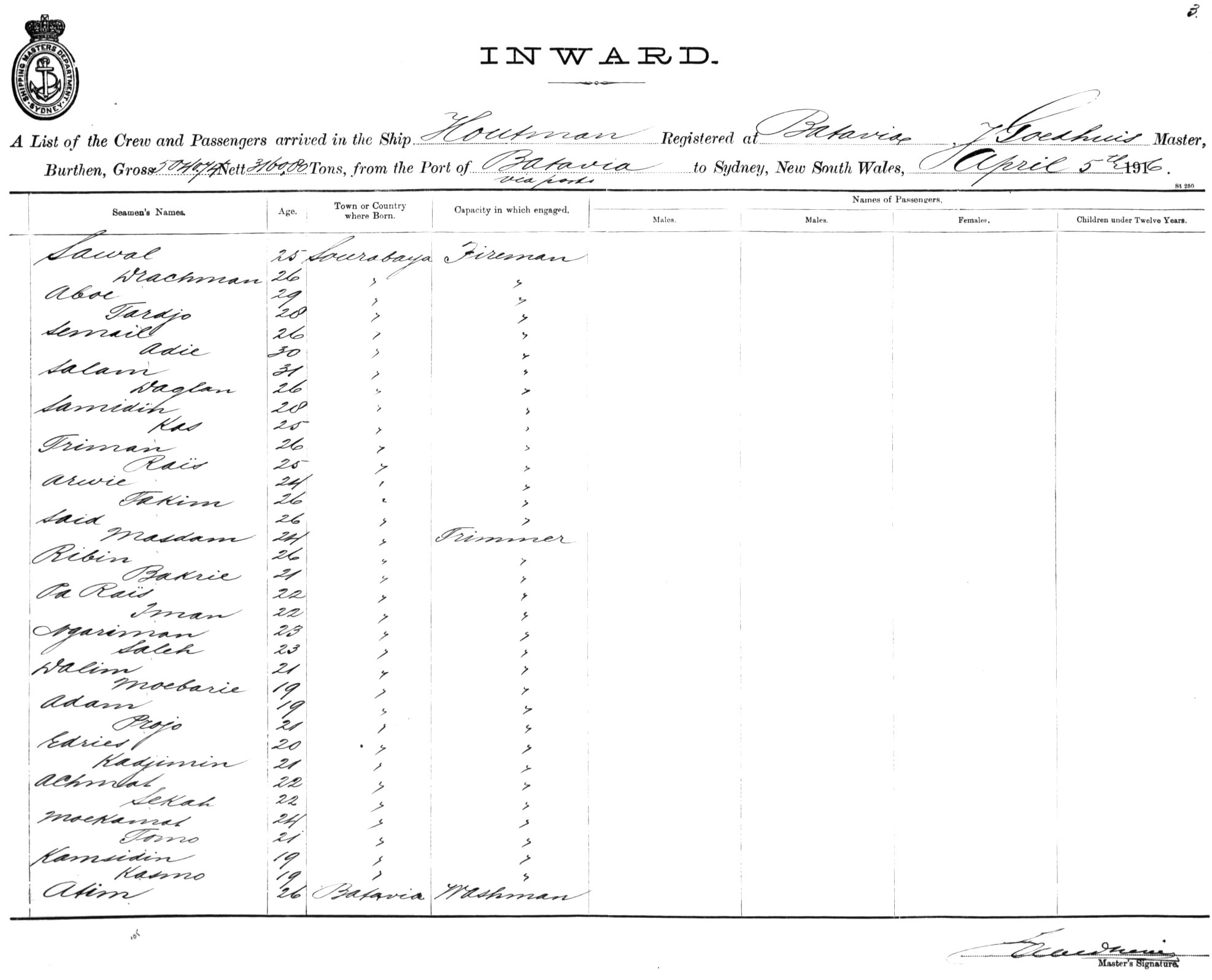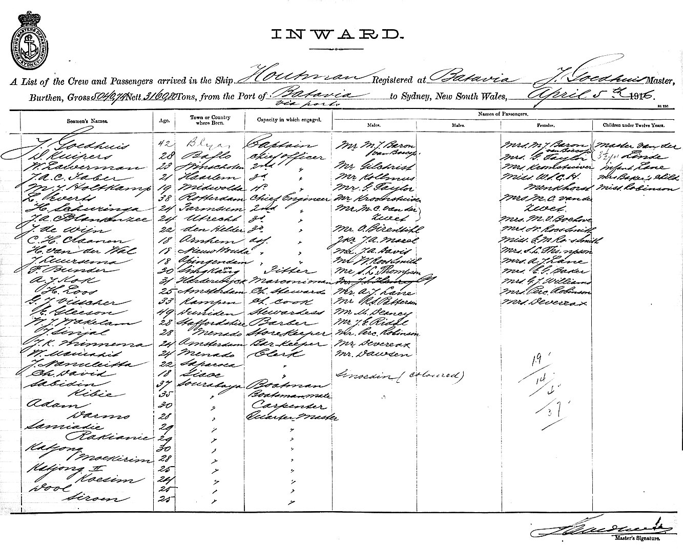 HOUTMANOF BATAVIA, J. GOEDHUIS, MASTER, BURTHEN 5040/3160 TONS FROM THE PORT OF BATAVIA VIA PORTS TO SYDNEY, NEW SOUTH WALES, 5TH APRIL 1916 |