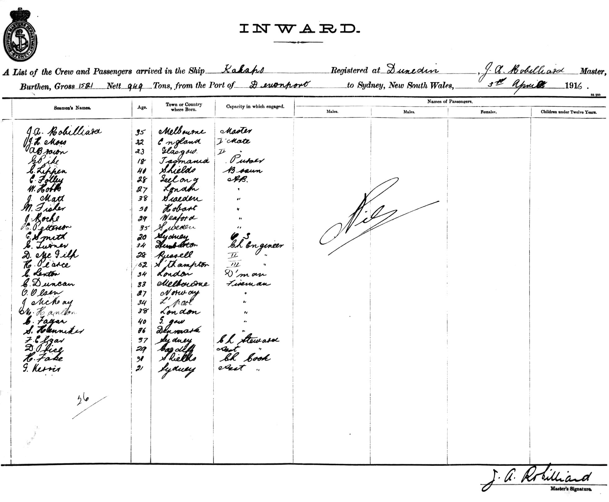 KAKAPOOF DUNEDIN, J. A. ROBILLIARD, MASTER, BURTHEN 1521/949 TONS FROM THE PORT OF DEVONPORT TO SYDNEY, NEW SOUTH WALES, 3RD APRIL 1916 |