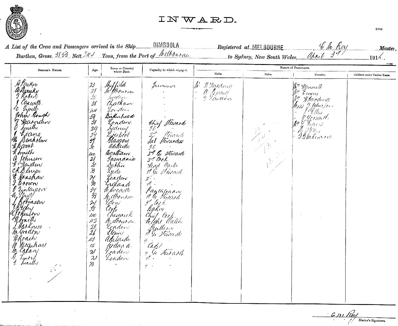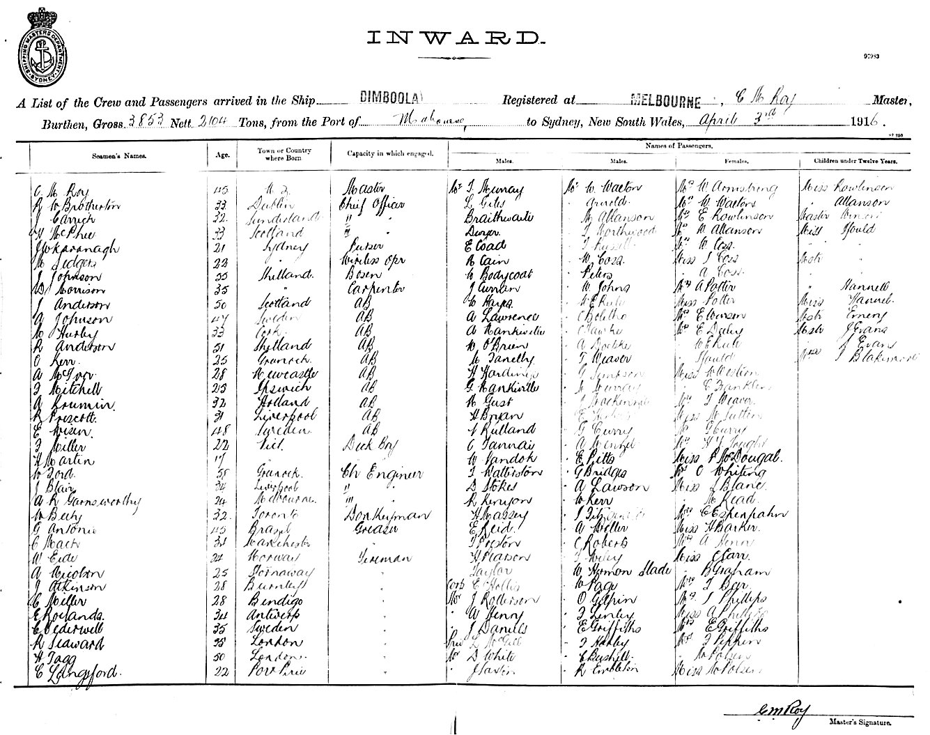 DIMBOOLAOF MELBOURNE, C. M. ROY, MASTER, BURTHEN 3853/2104 TONS FROM THE PORT OF MELBOURNE TO SYDNEY, NEW SOUTH WALES, 3RD APRIL 1916 |