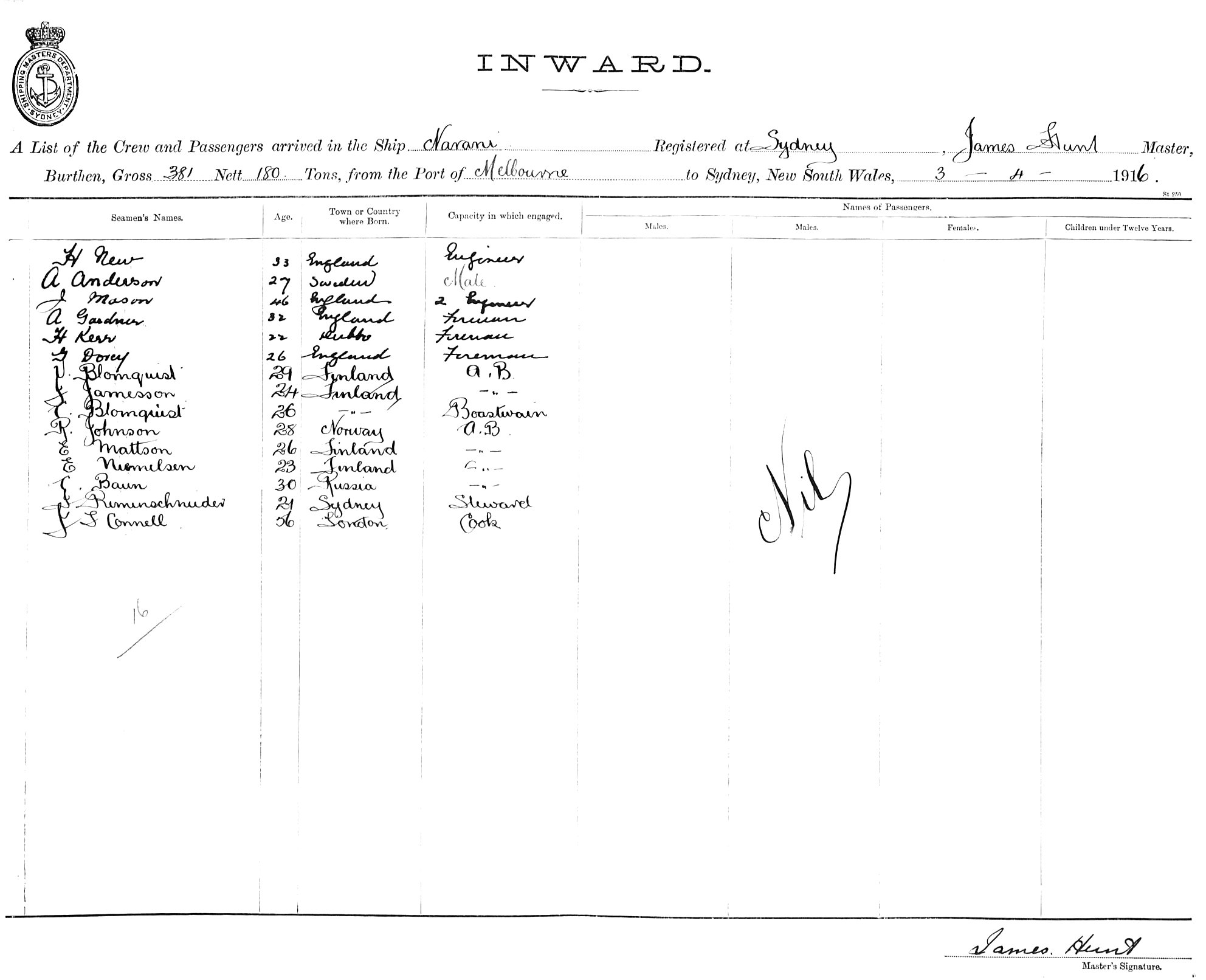 NARANIOF SYDNEY, JAMES HUNT, MASTER, BURTHEN 381/180 TONS FROM THE PORT OF MELBOURNE TO SYDNEY, NEW SOUTH WALES, 3RD APRIL 1916 |