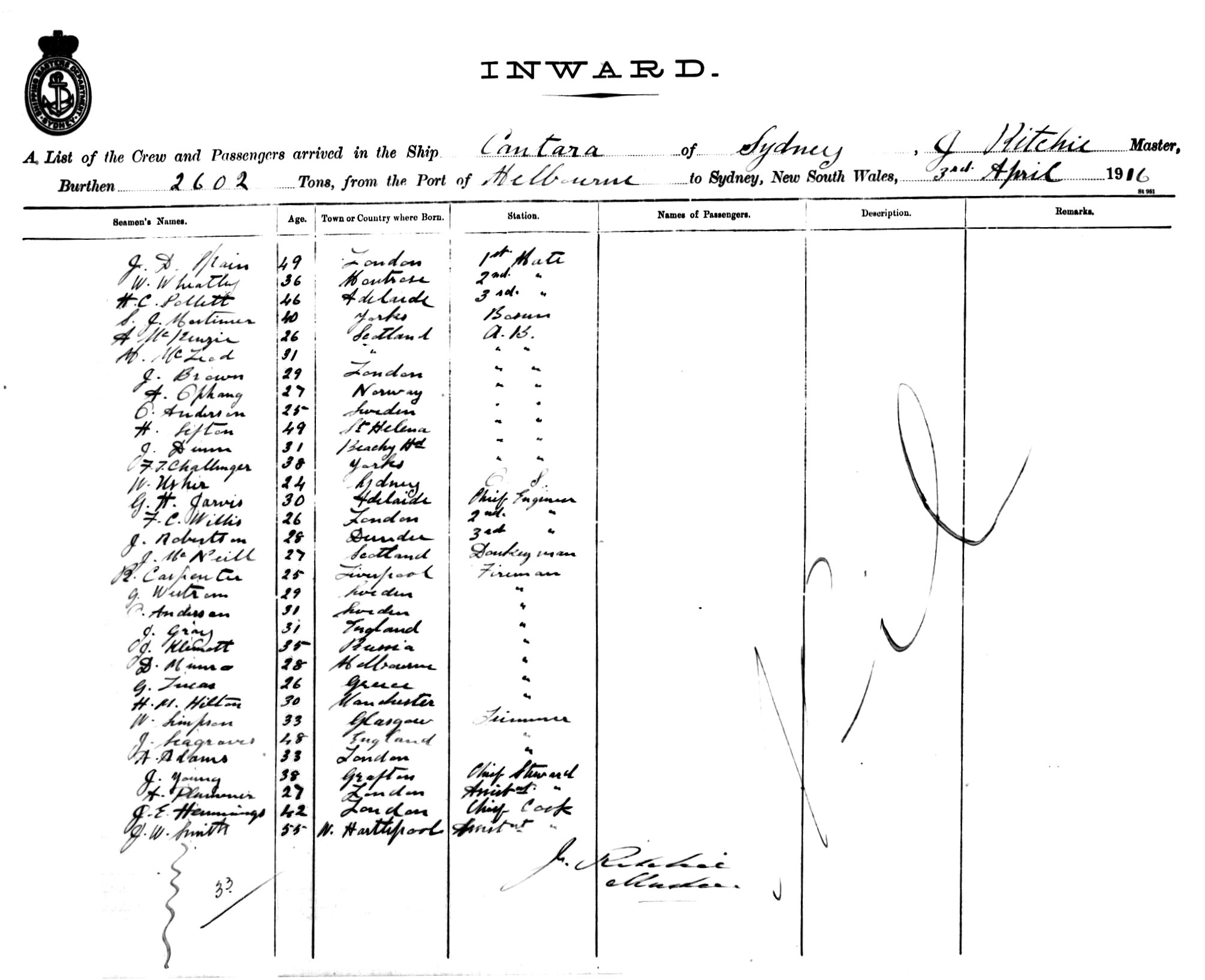CANTARAOF SYDNEY, J. RITCHIE, MASTER, BURTHEN 2602 TONS FROM THE PORT OF MELBOURNE TO SYDNEY, NEW SOUTH WALES, 3RD APRIL 1916 |