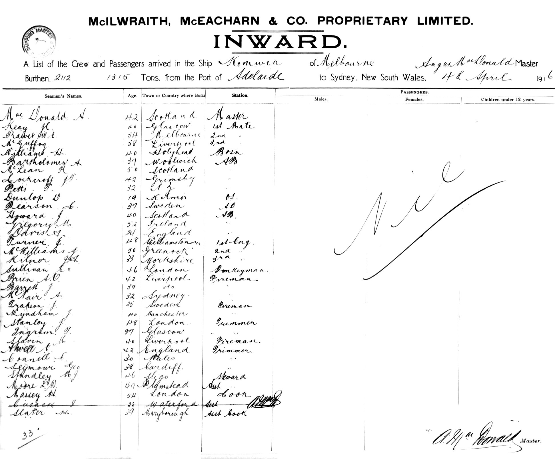 KOMURAOF MELBOURNE, ANGUS MCDONALD, MASTER, BURTHEN 2112/1315 TONS FROM THE PORT OF ADELAIDE TO SYDNEY, NEW SOUTH WALES, 4TH APRIL 1916 |