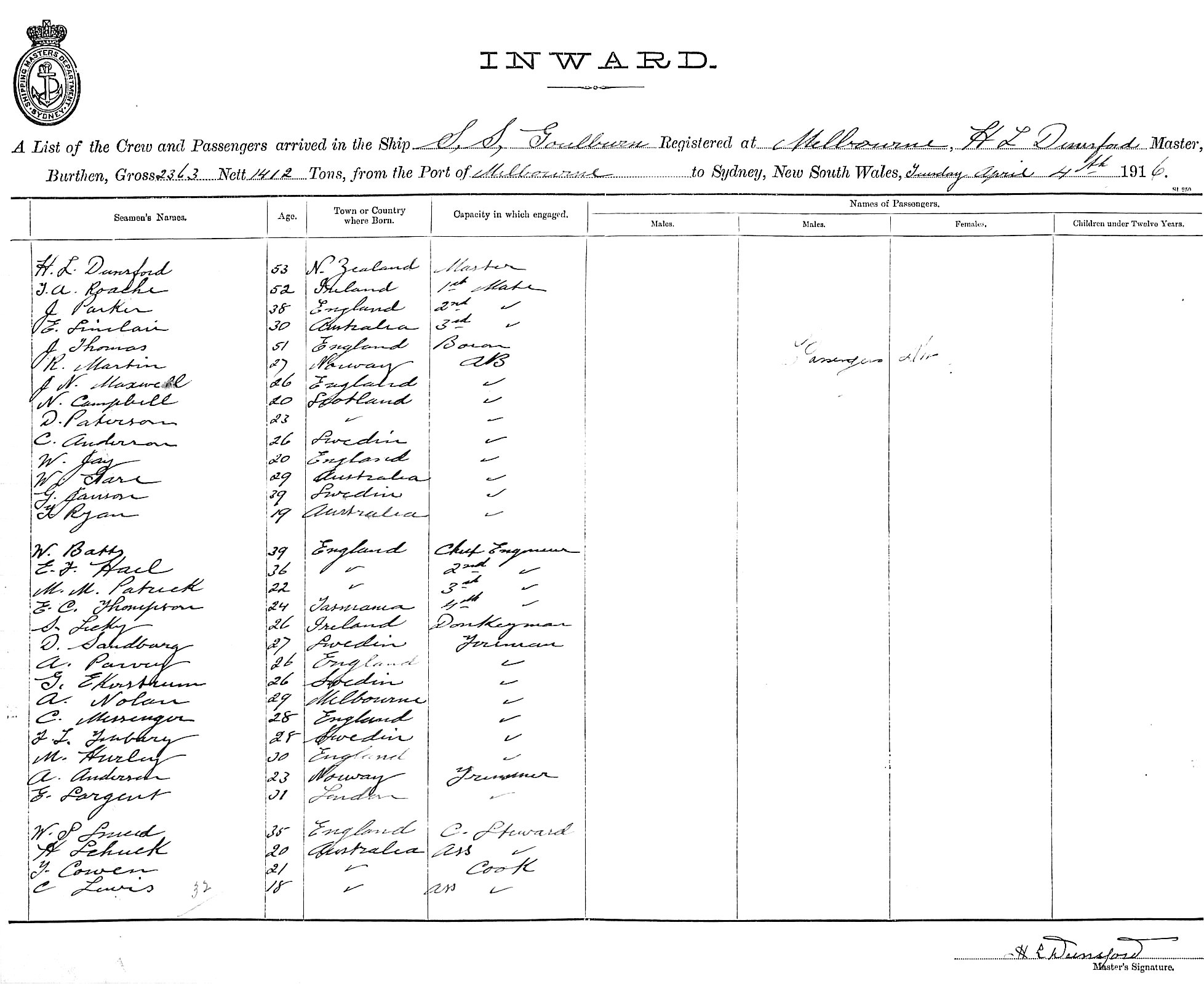 GOULBURNOF MELBOURNE, H. L. DUNSFORD MASTER, BURTHEN 2363/1412 TONS FROM THE PORT OF MELBOURNE TO SYDNEY, NEW SOUTH WALES, 4TH APRIL 1916 |