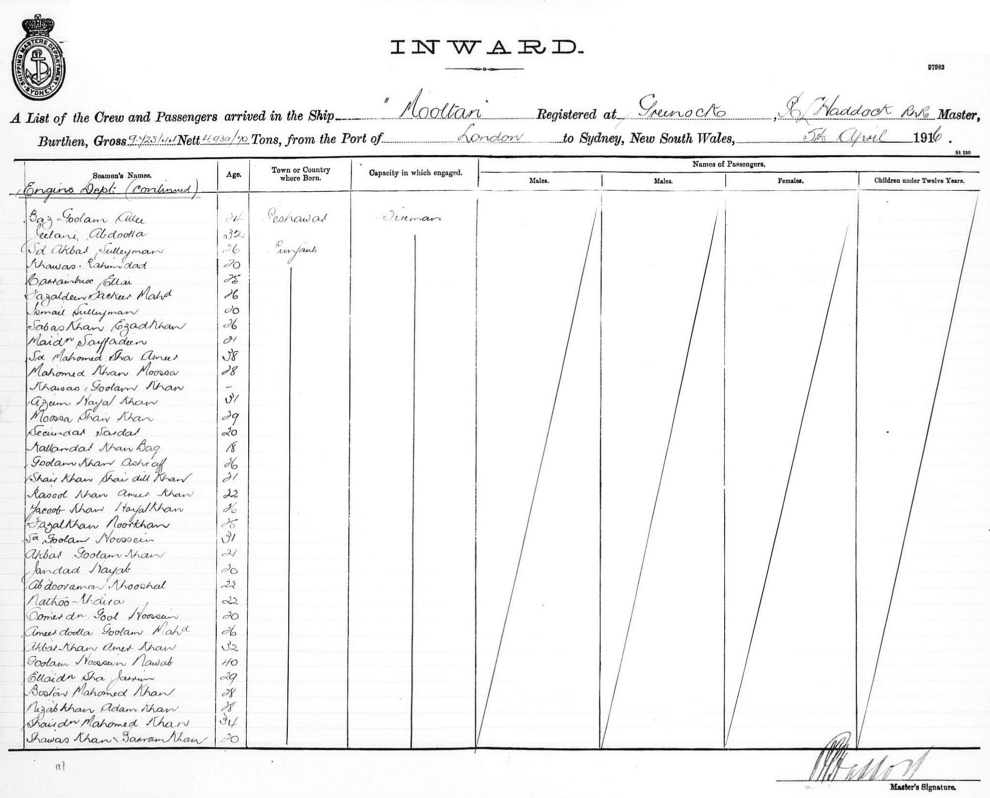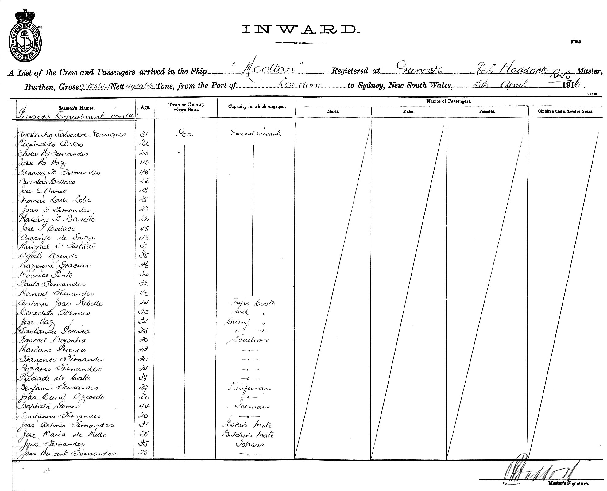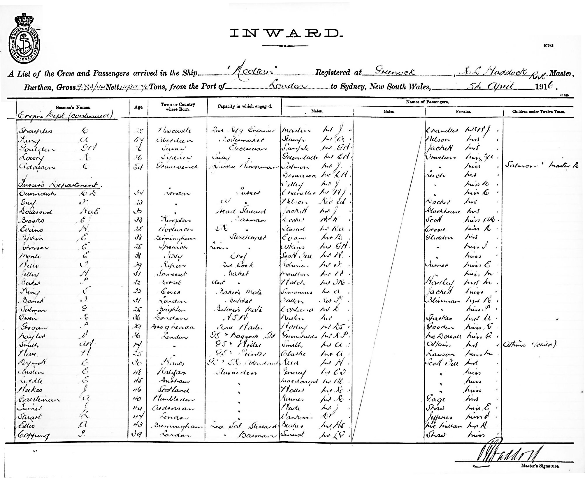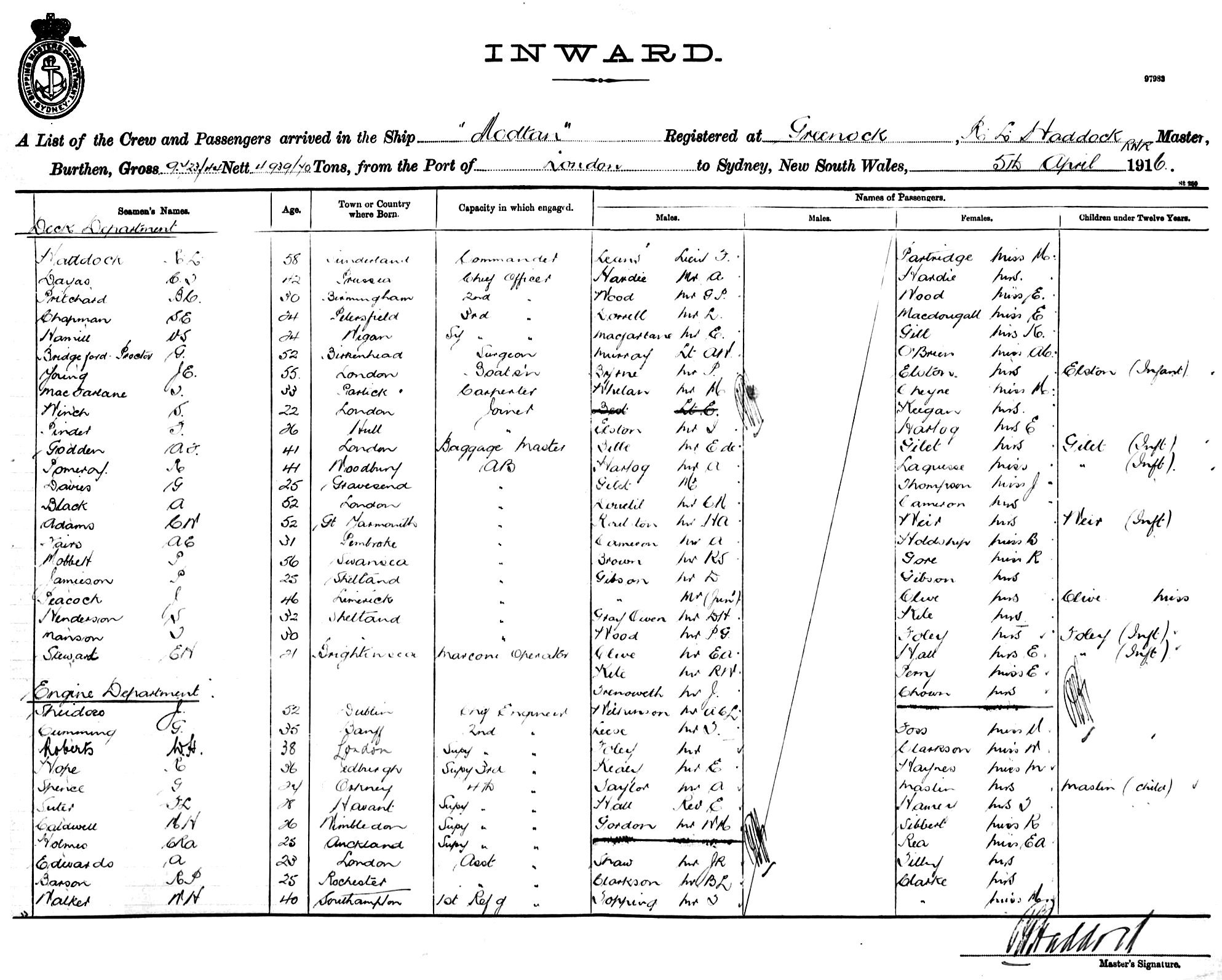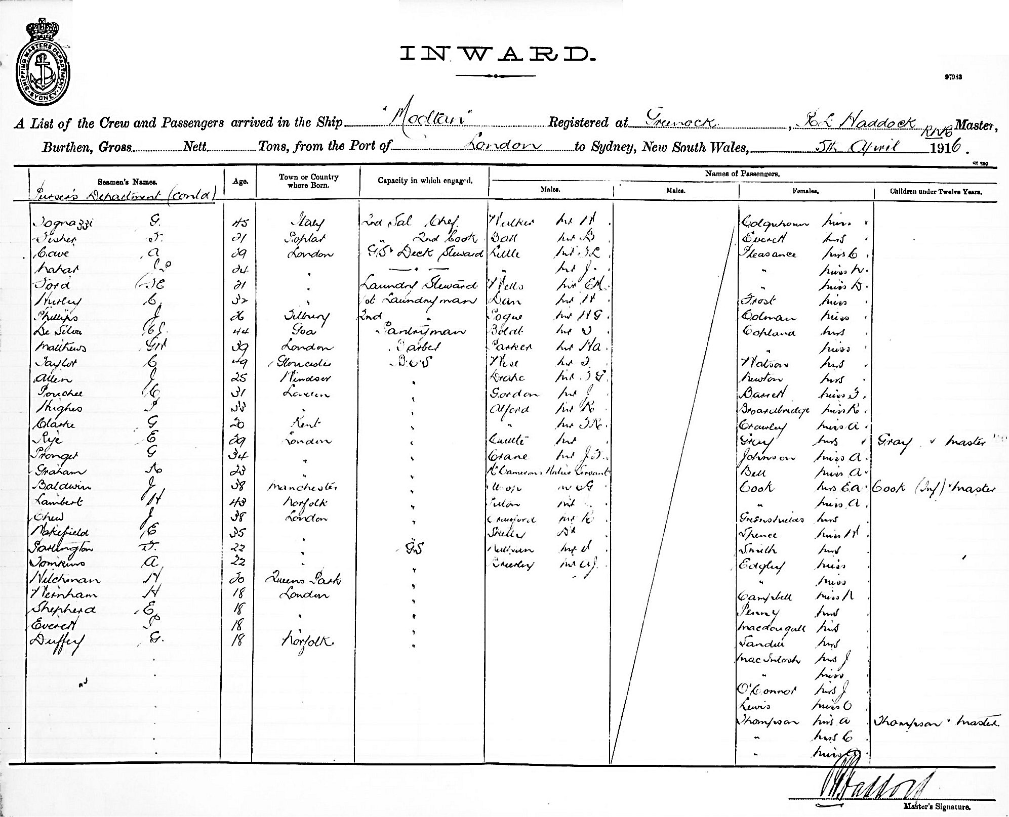 Mariners and ships in Australian Waters | MOOLTANOF GREENOCK, R. L. HADDOCK, MASTER, BURTHEN 9723/4939 TONS FROM THE PORT OF LONDON TO SYDNEY, NEW SOUTH WALES, 5TH APRIL 1916 |