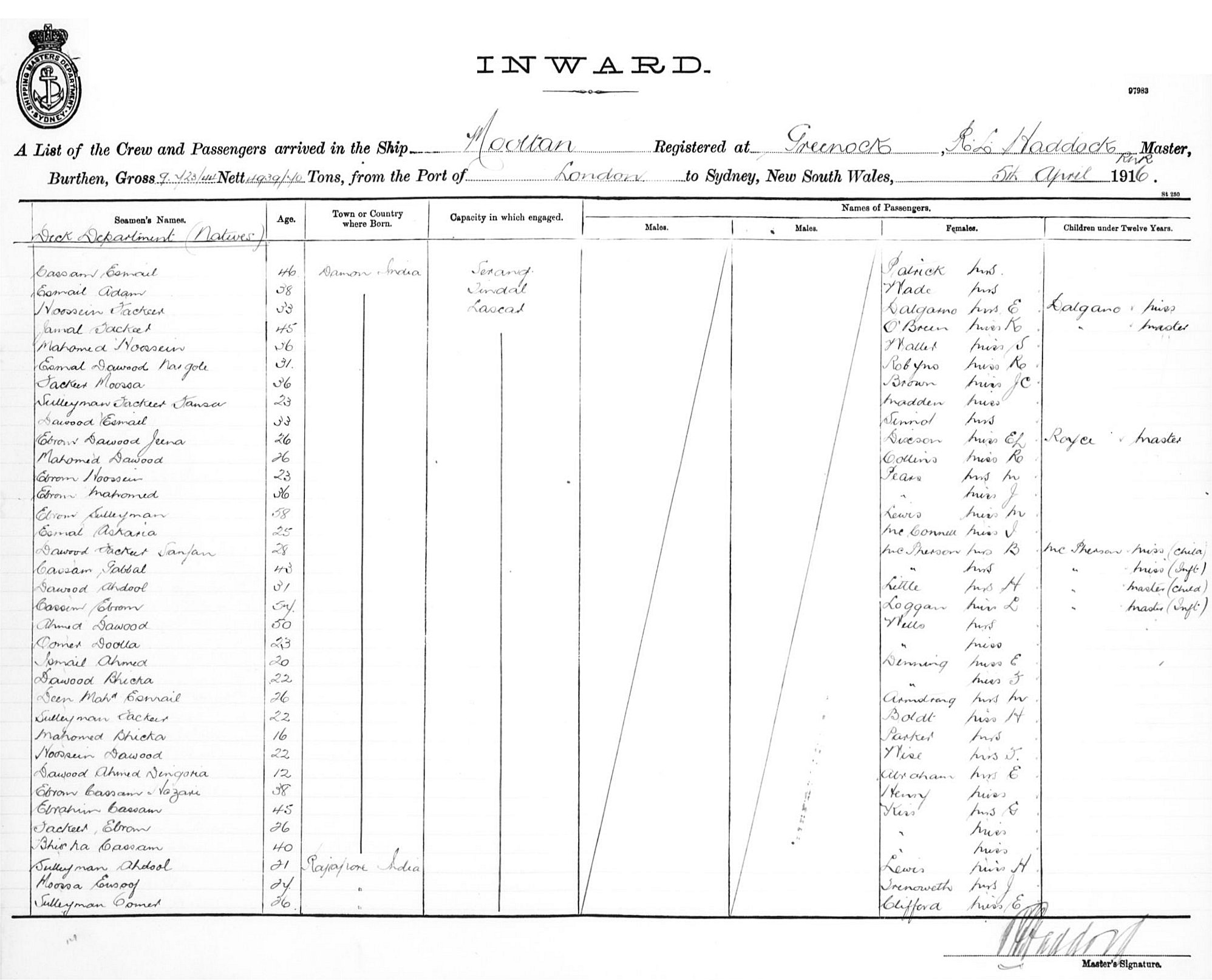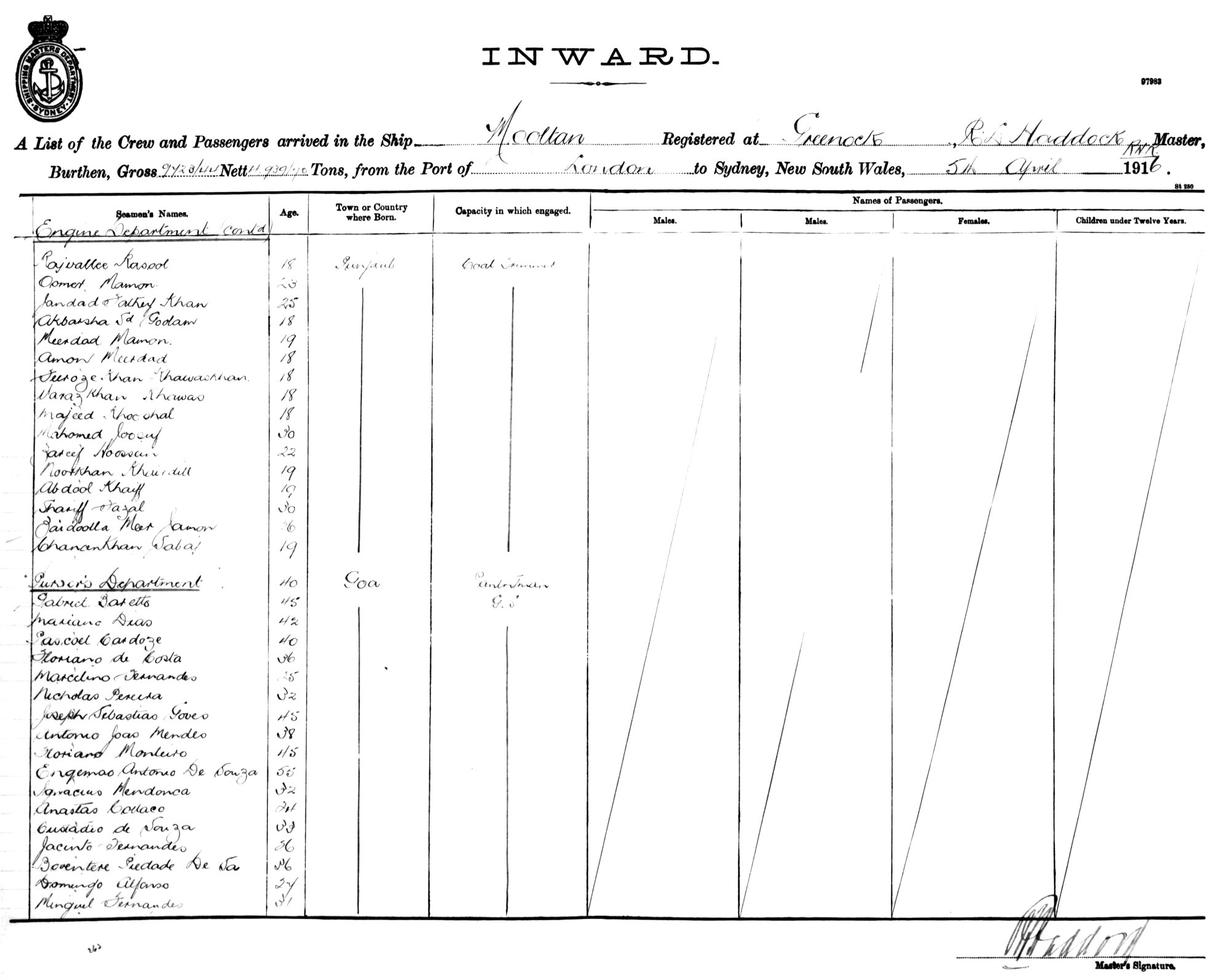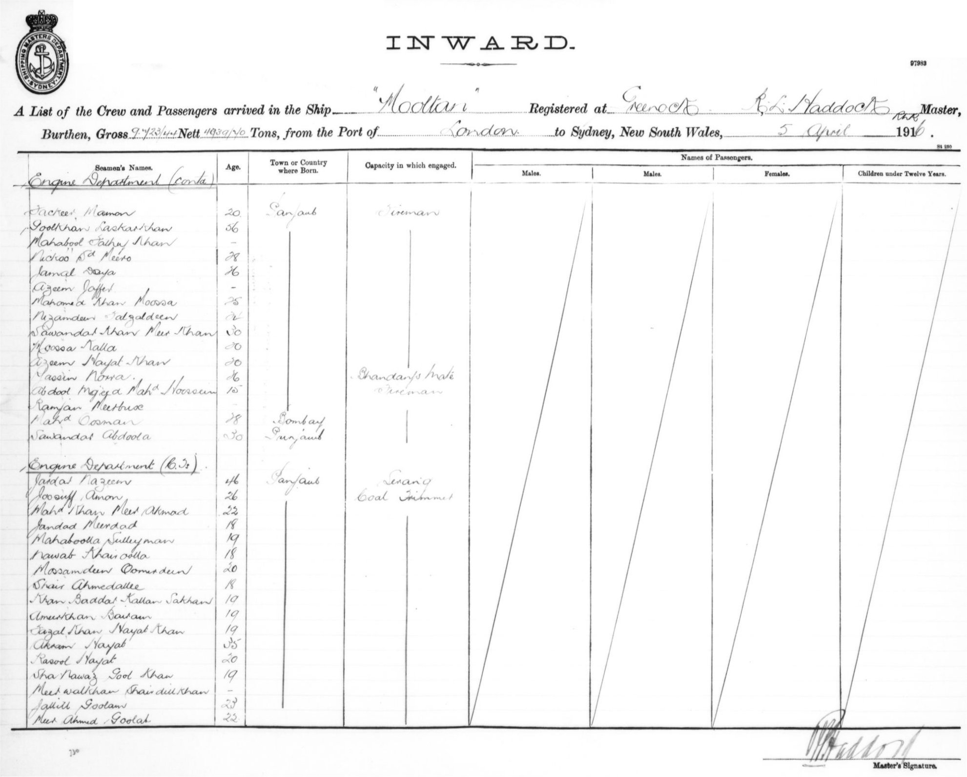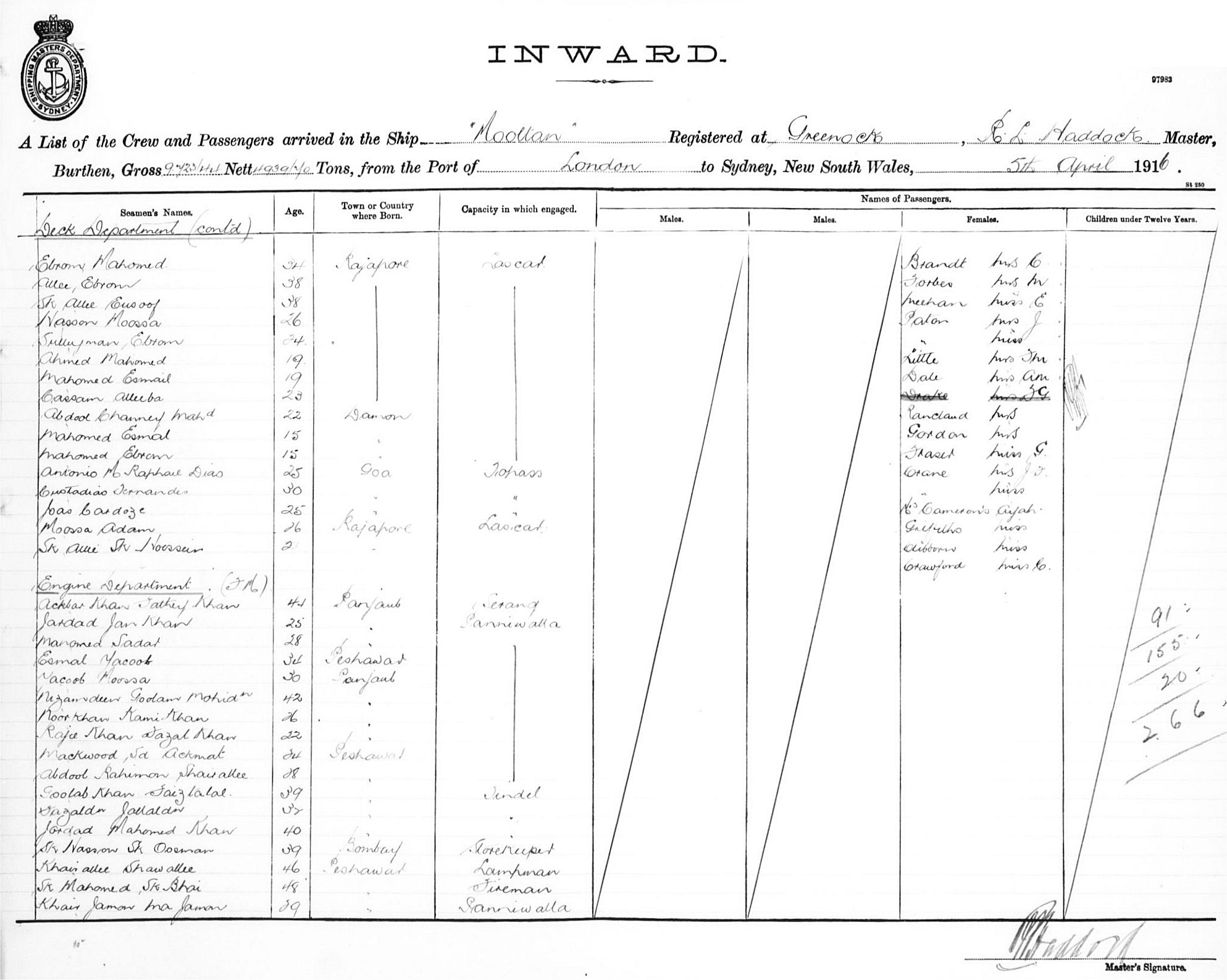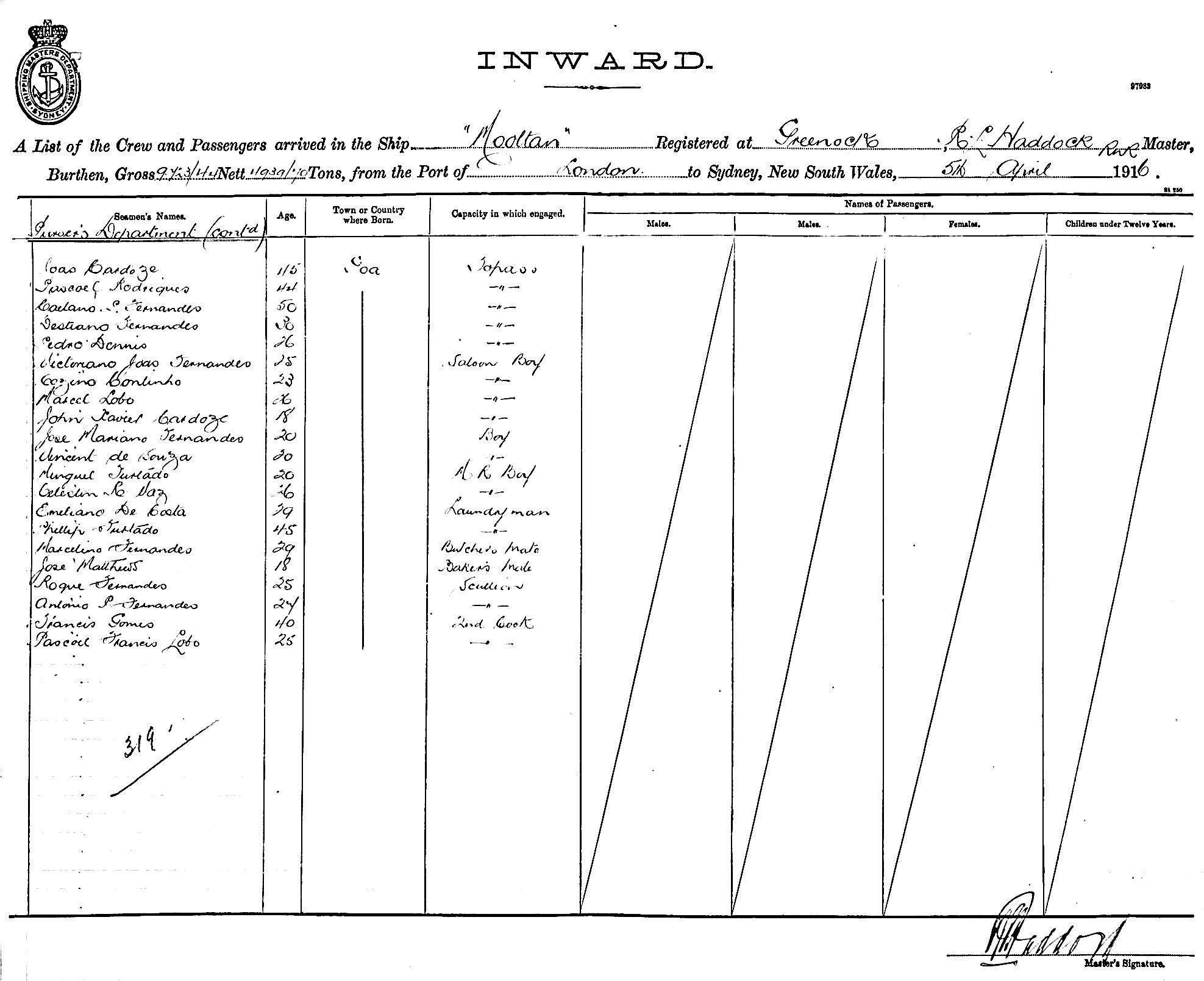 Mariners and ships in Australian Waters | MOOLTANOF GREENOCK, R. L. HADDOCK, MASTER, BURTHEN 9723/4939 TONS FROM THE PORT OF LONDON TO SYDNEY, NEW SOUTH WALES, 5TH APRIL 1916 |