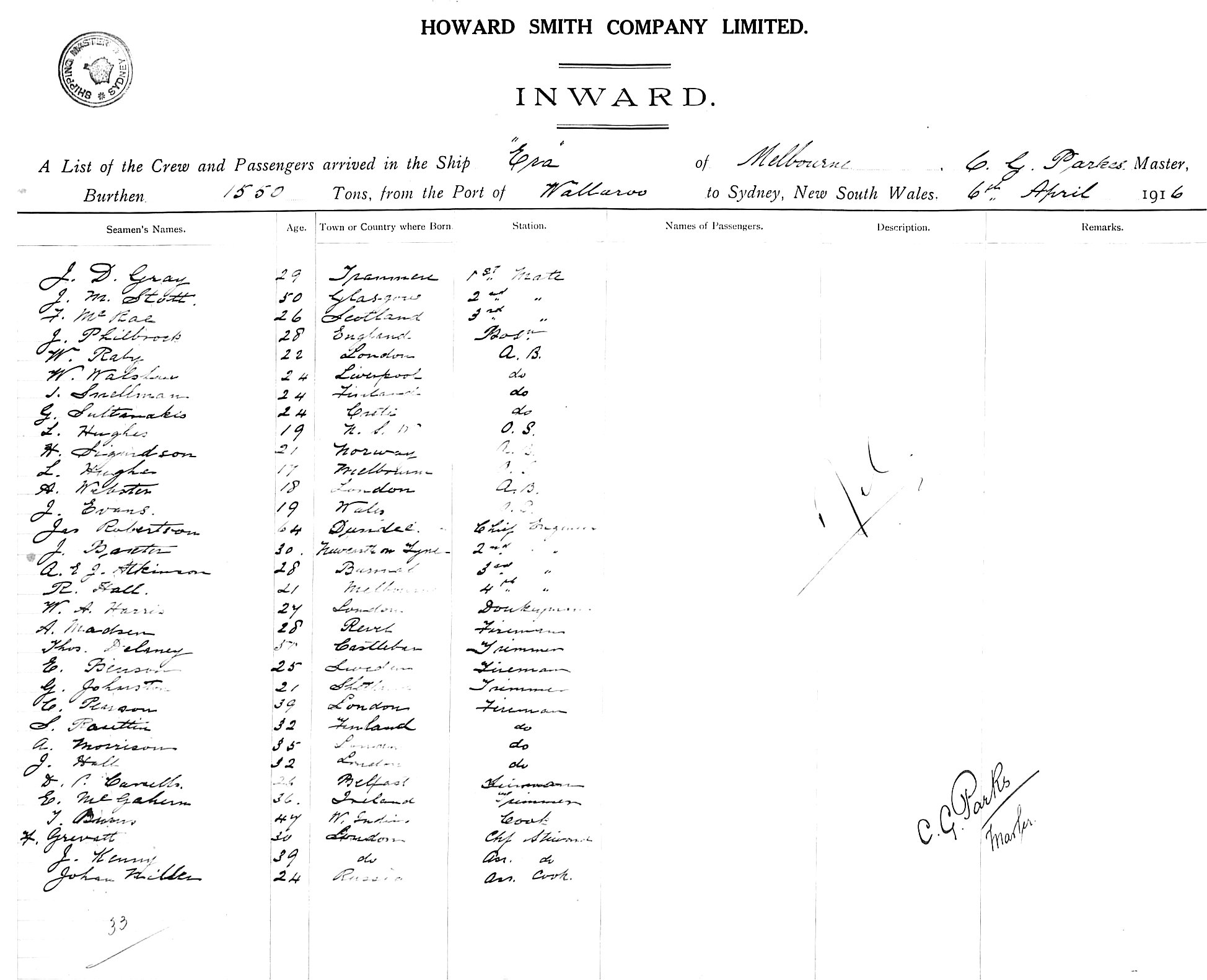 ERAOF MELBOURNE, C. G. PARKS, MASTER, BURTHEN 1550 TONS FROM THE PORT OF WALLAROO TO SYDNEY, NEW SOUTH WALES, 6TH APRIL 1916 |