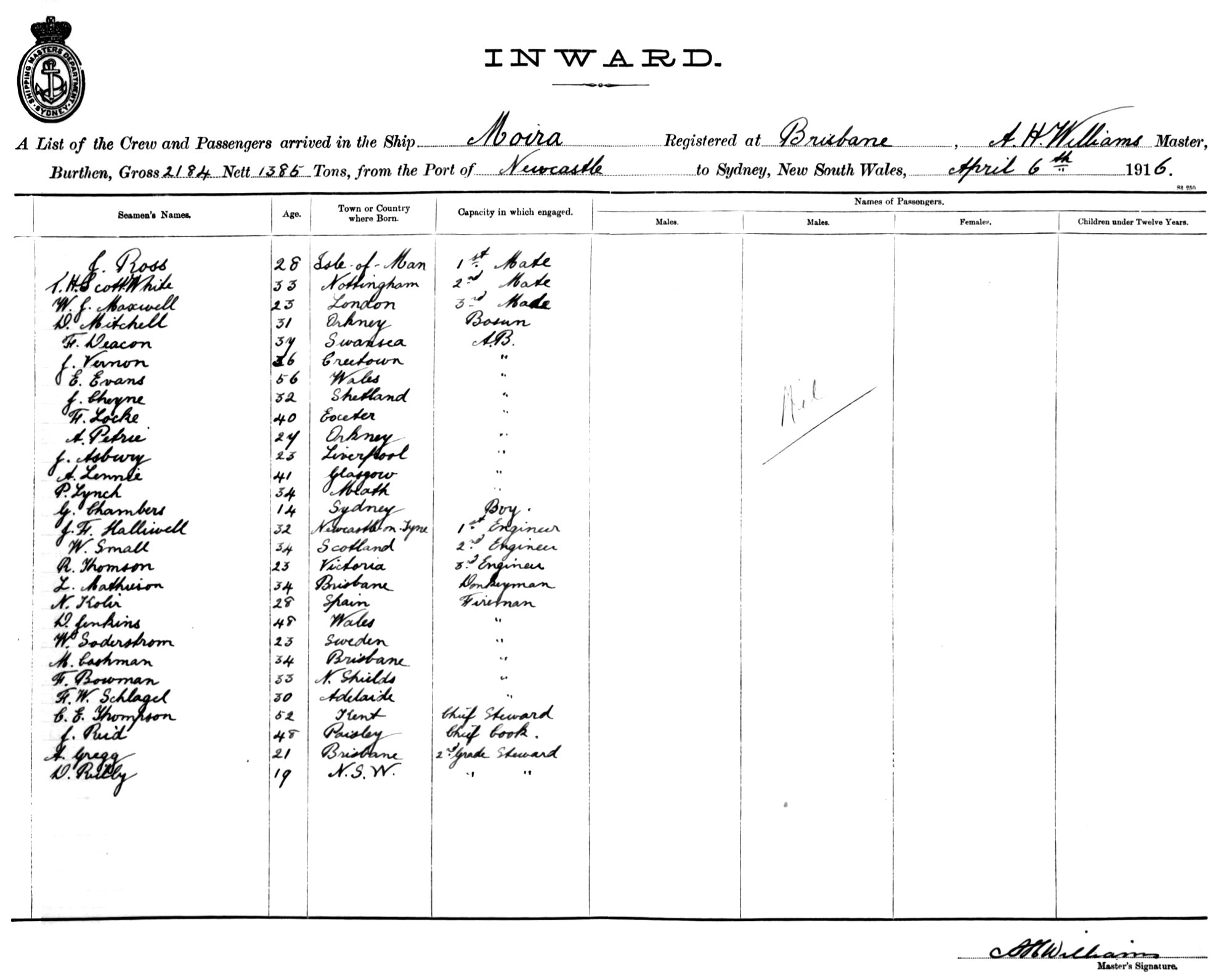 MOIRAOF BRISBANE, A. H. WILLIAMS, MASTER, BURTHEN 2184/1385 TONS FROM THE PORT OF NEWCASTLE TO SYDNEY, NEW SOUTH WALES, 6TH APRIL 1916 |