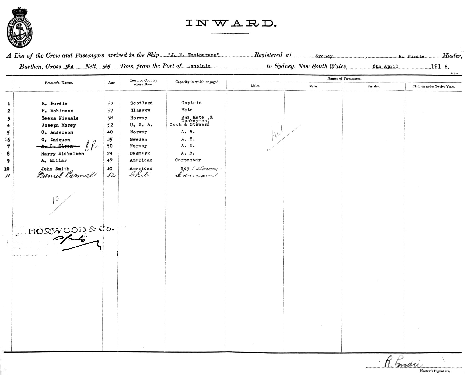 J M WEATHERWAXOF SYDNEY, R. PURDIE, MASTER, BURTHEN 384/365 TONS FROM THE PORT OF HONOLULU TO SYDNEY, NEW SOUTH WALES, 6TH APRIL 1916 |