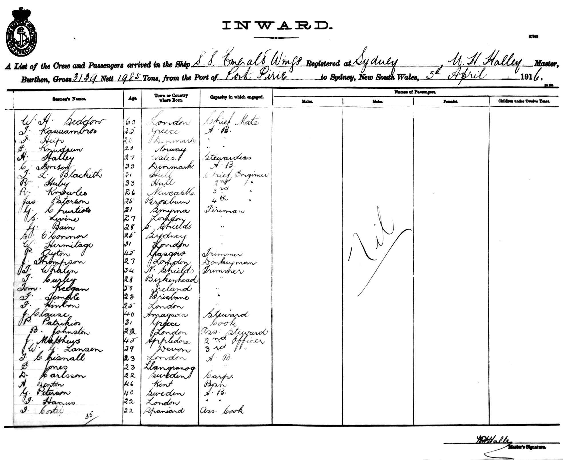 EMERALD WINGSOF SYDNEY, W. H. HALLEY, MASTER, BURTHEN 3139/1985 TONS FROM THE PORT OF PORT PIRIE TO SYDNEY, NEW SOUTH WALES, 57TH APRIL 1916 |