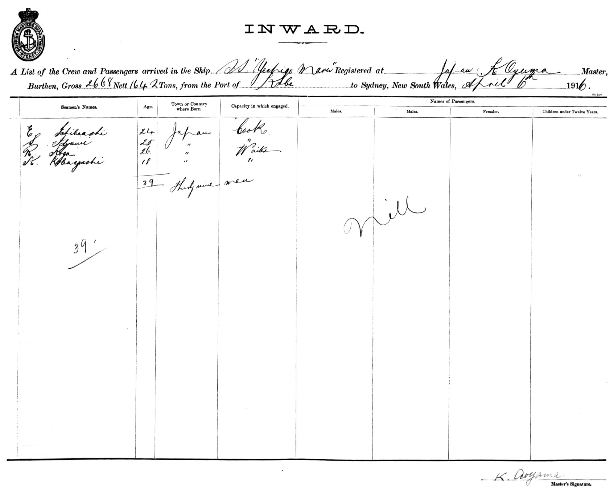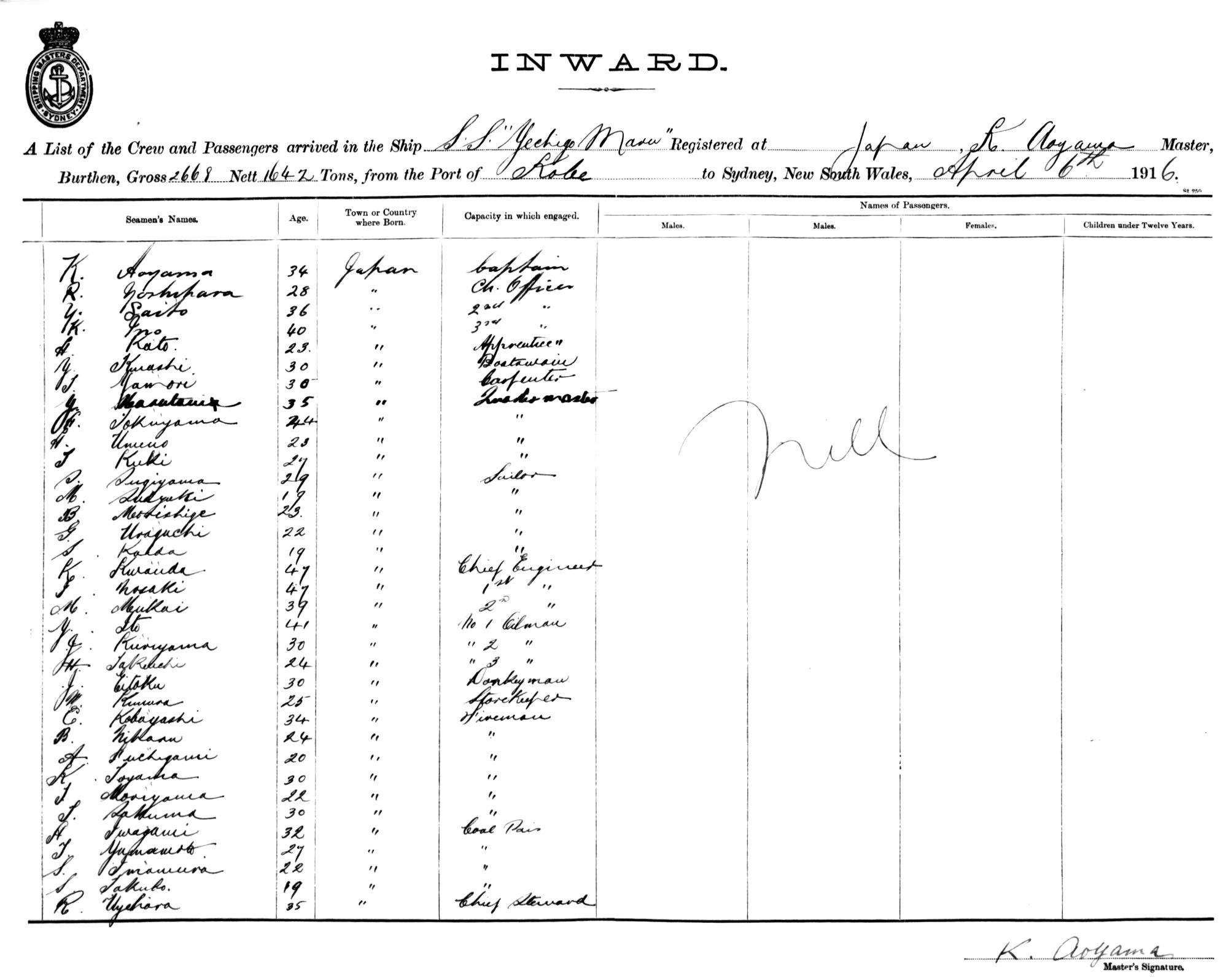YECHIGO MARUOF JAPAN, K. AOYAMA MASTER, BURTHEN 2668/1642 TONS FROM THE PORT OF KOBE TO SYDNEY, NEW SOUTH WALES, 6TH APRIL 1916 |