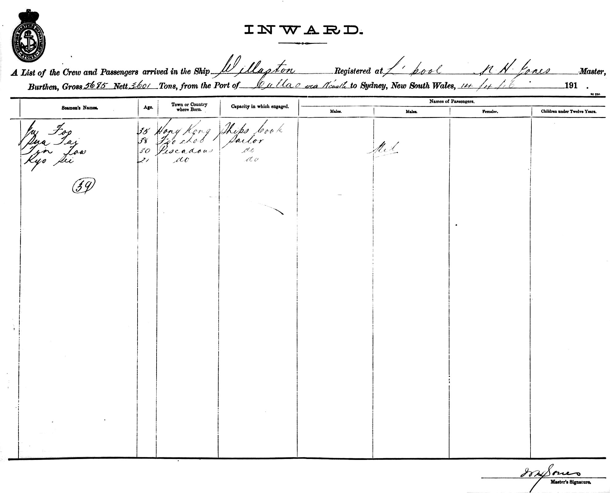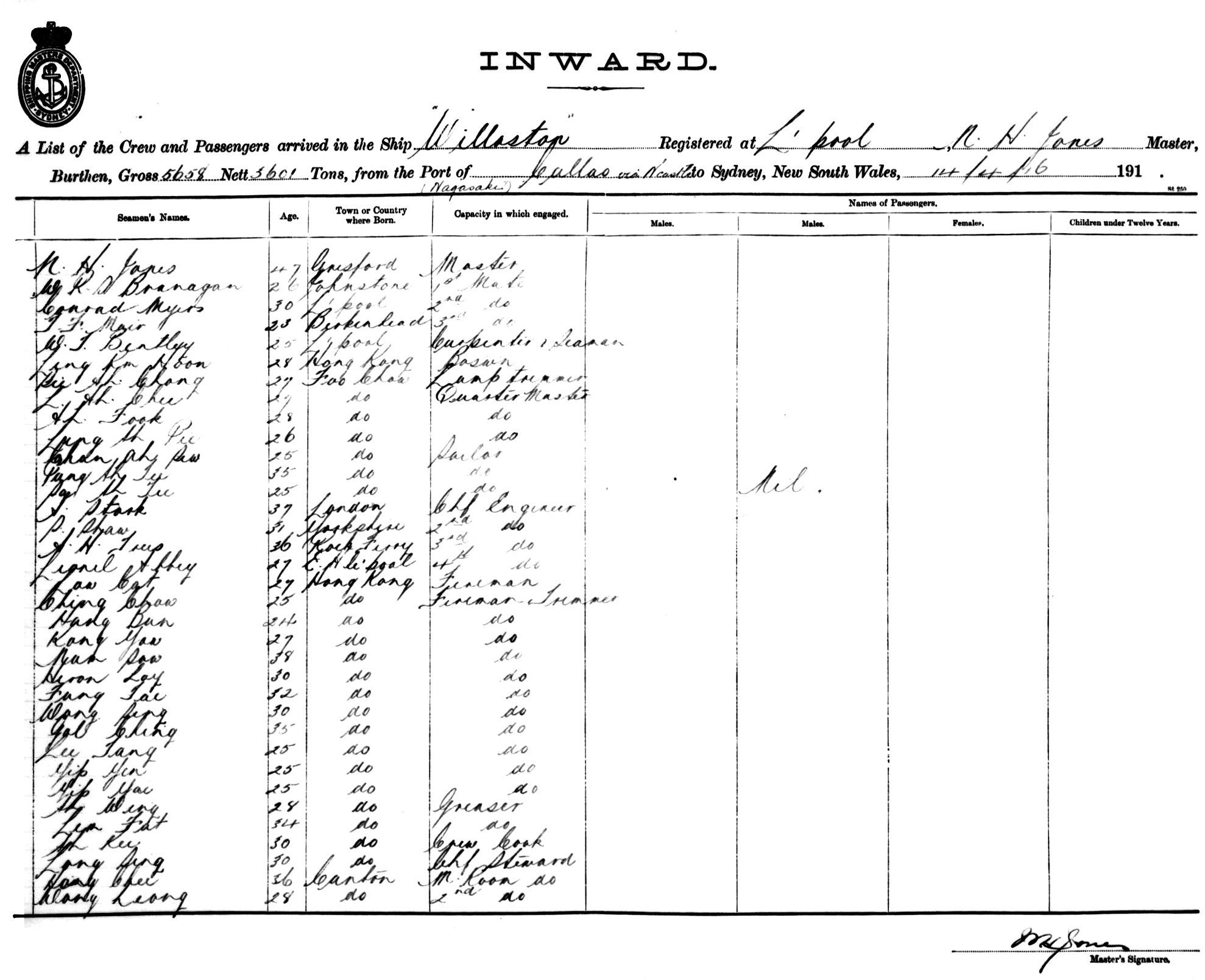 WILLASTONOF LIVERPOOL, N. H. JONES, MASTER, BURTHEN 5658/3601 TONS FROM THE PORT OF CALLAO ? VIA NEWCASTLE TO SYDNEY, NEW SOUTH WALES, 14TH APRIL 1916 |