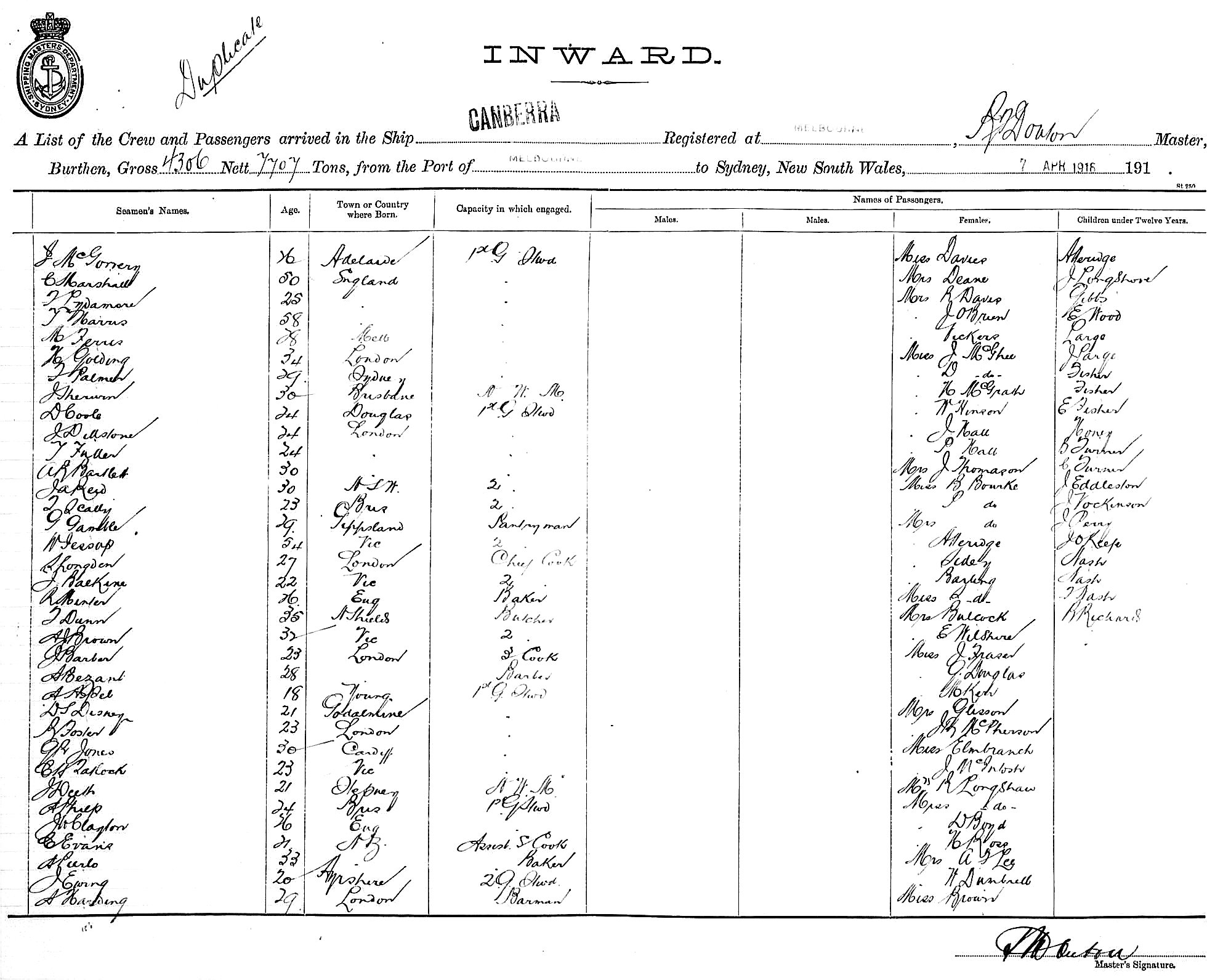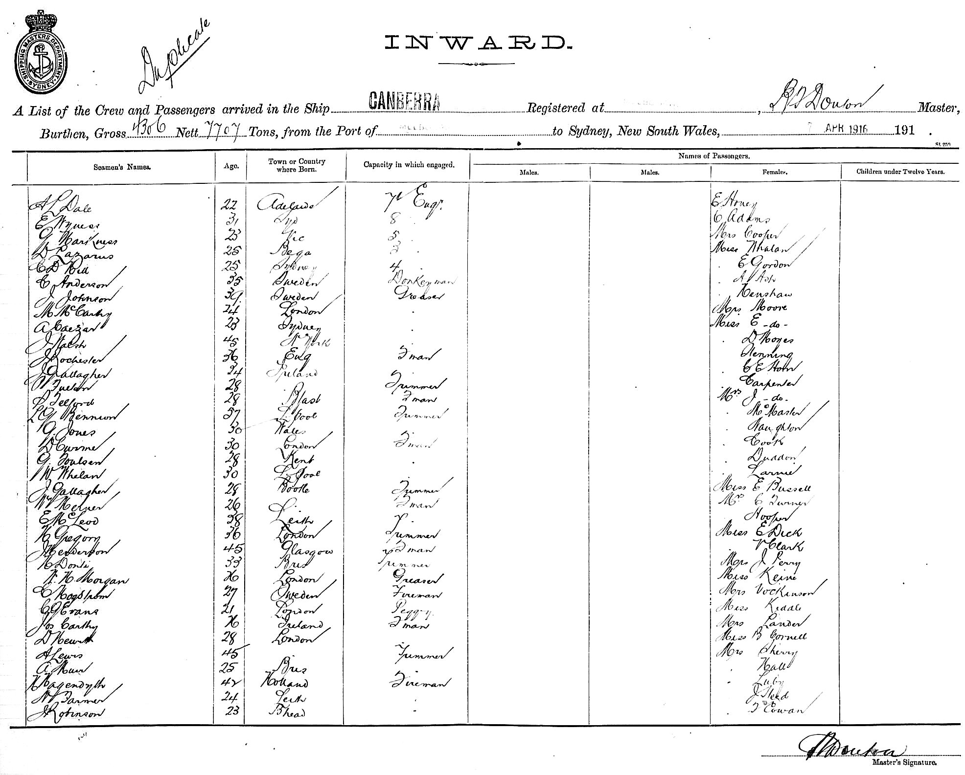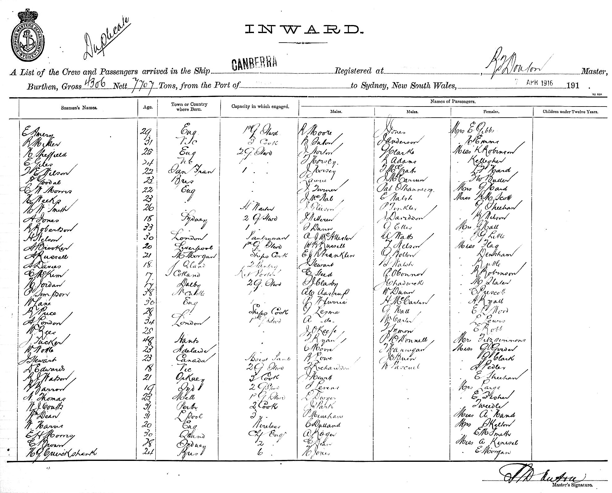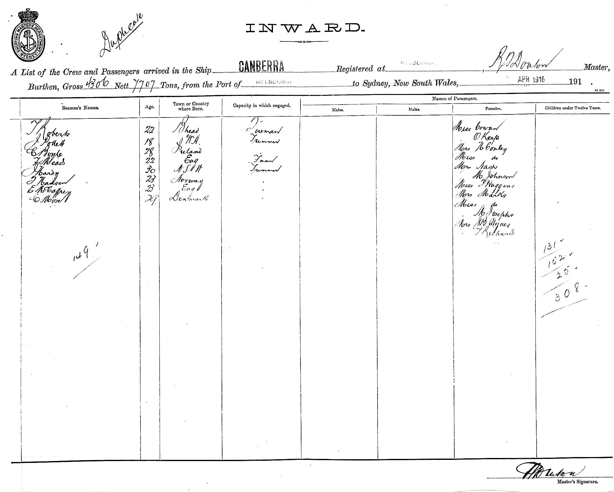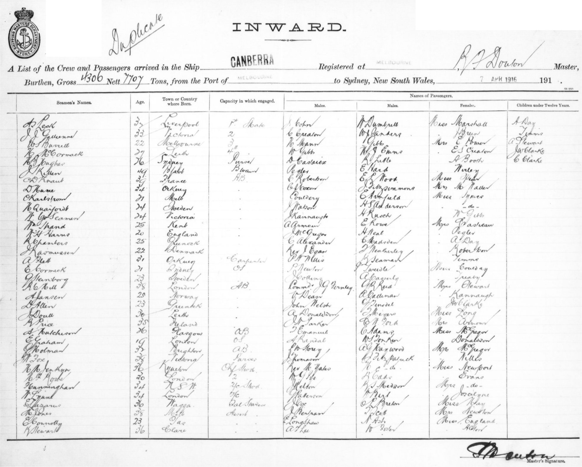 CANBERRAOF MELBOURNE, R. F. DOUTON, MASTER, BURTHEN 7707/4306 TONS FROM THE PORT OF MELBOURNE TO SYDNEY, NEW SOUTH WALES, 7TH APRIL 1916 |