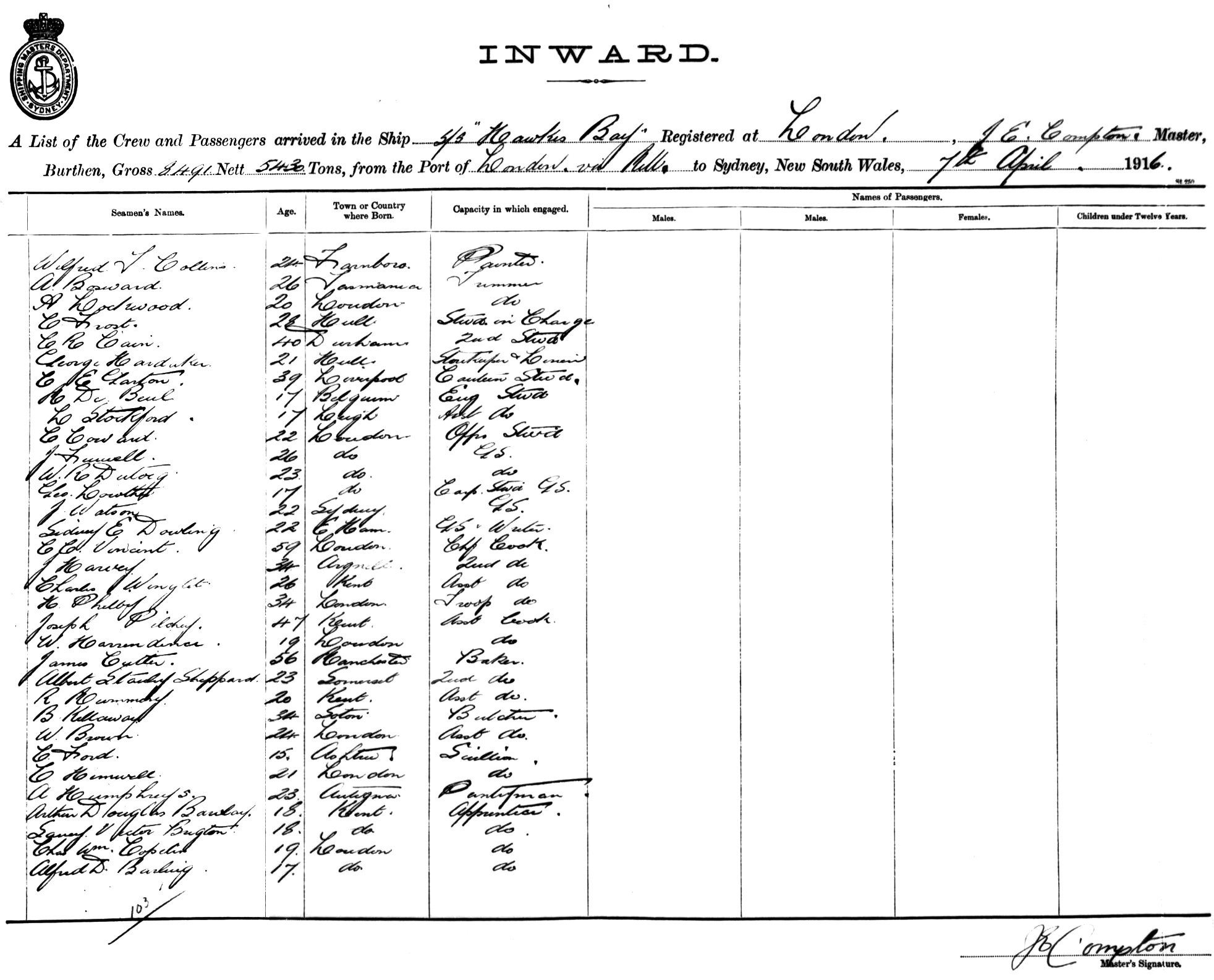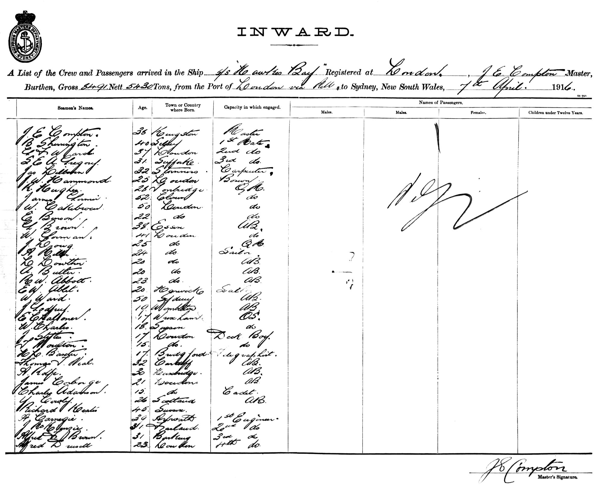 HAWKES BAYOF LONDON, J. E. COMPTON, MASTER, BURTHEN 8491/5430 TONS FROM THE PORT OF LONDON VIA MELBOURNE TO SYDNEY, NEW SOUTH WALES, 7TH APRIL 1916 |