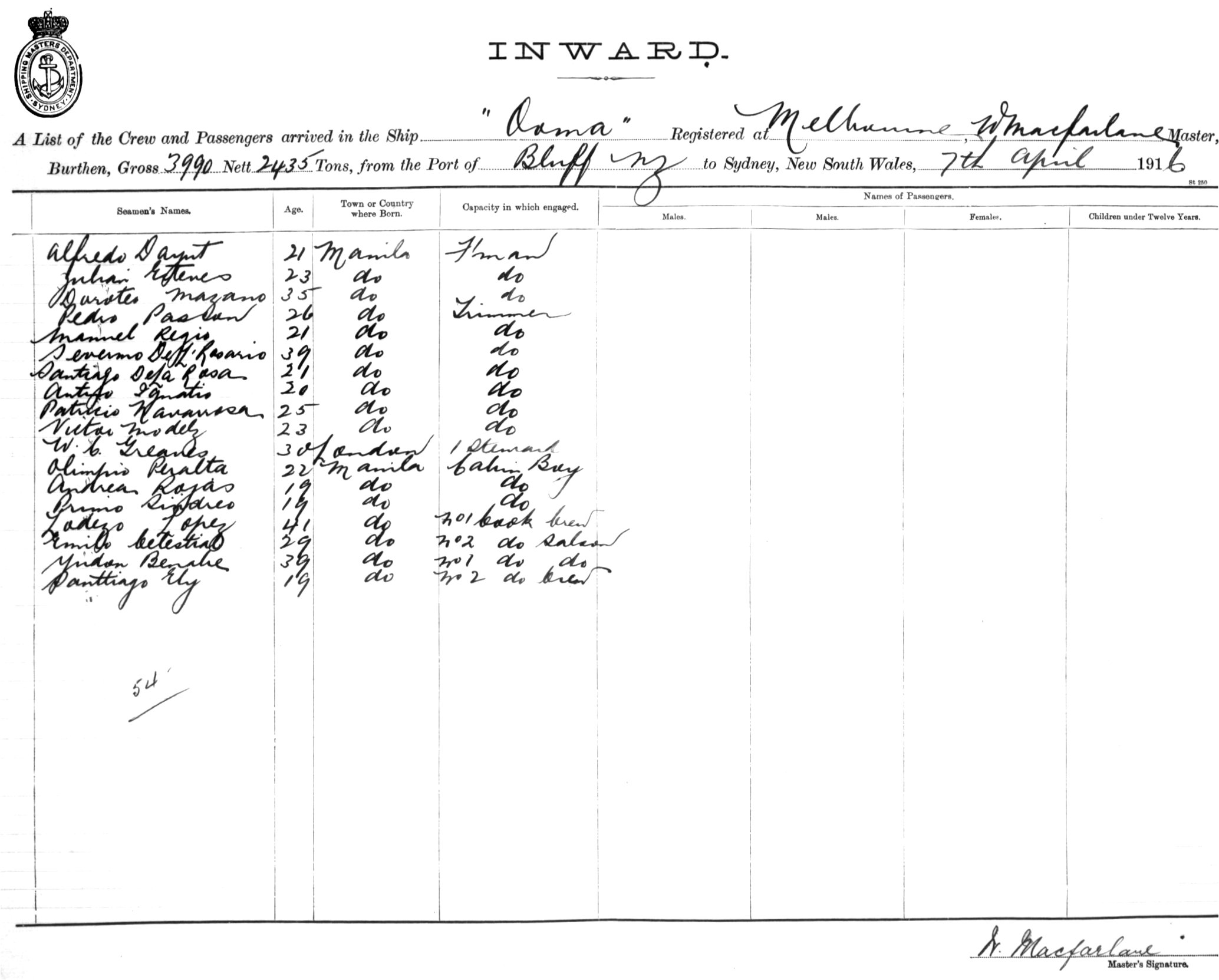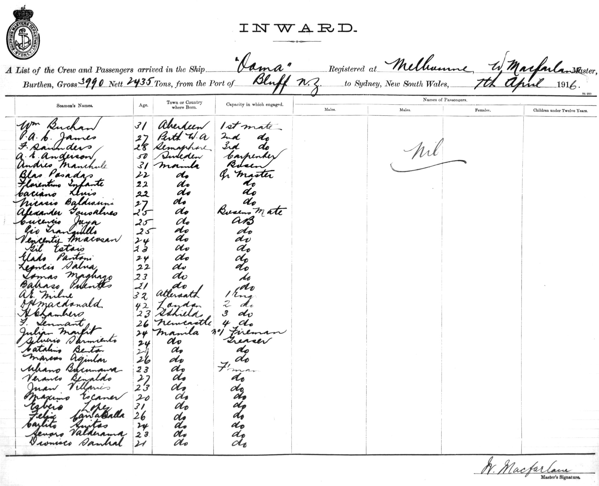 OOMAOF MELBOURNE, W. MACFARLANE, MASTER, BURTHEN 3990/2435 TONS FROM THE PORT OF BLUFF, N.Z. TO SYDNEY, NEW SOUTH WALES, 7TH APRIL 1916 |