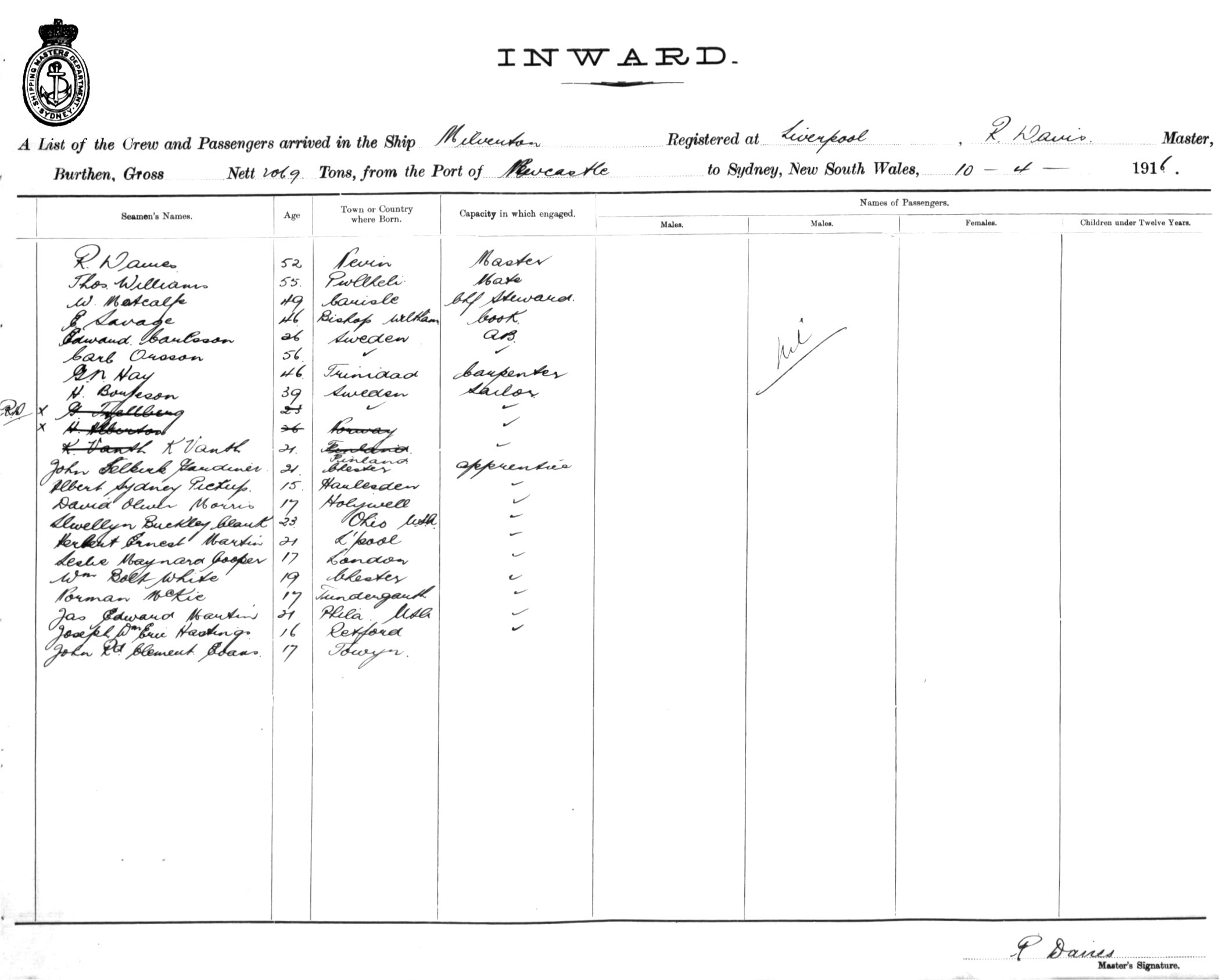 Mariners and ships in Australian Waters | MILVERTONOF LIVERPOOL, R. DAVIES, MASTER, BURTHEN 2069 TONS FROM THE PORT OF NEWCASTLE TO SYDNEY, NEW SOUTH WALES, 10TH APRIL 1916 |
