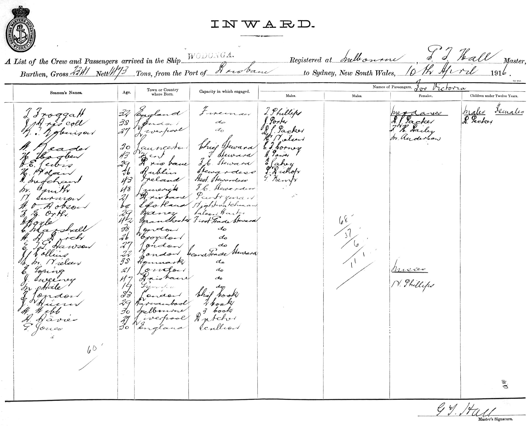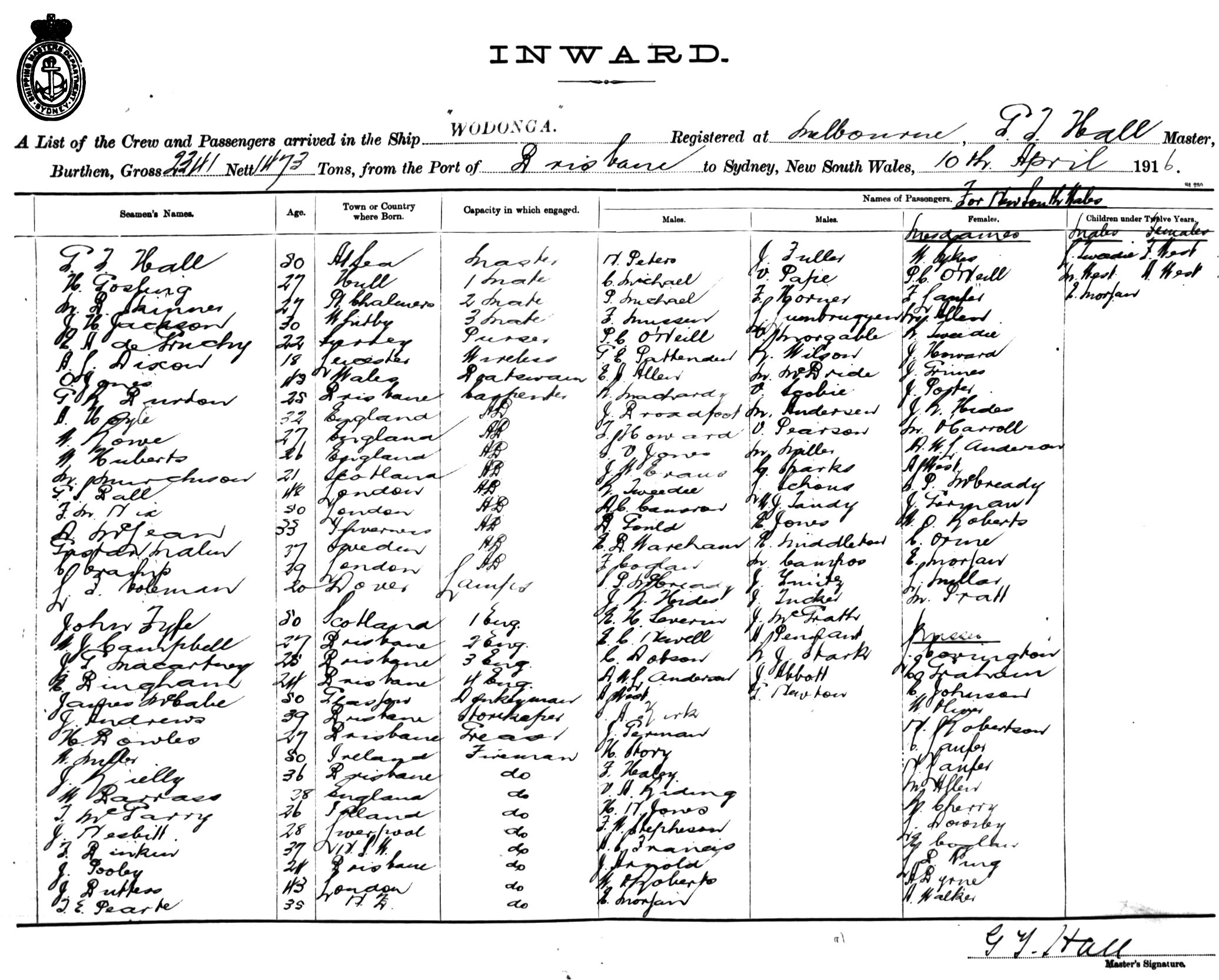 WODONGAOF MELBOURNE, G. T. HALL, MASTER, BURTHEN 2341/1473 TONS FROM THE PORT OF BRISBANE TO SYDNEY, NEW SOUTH WALES, 10TH APRIL 1916 |