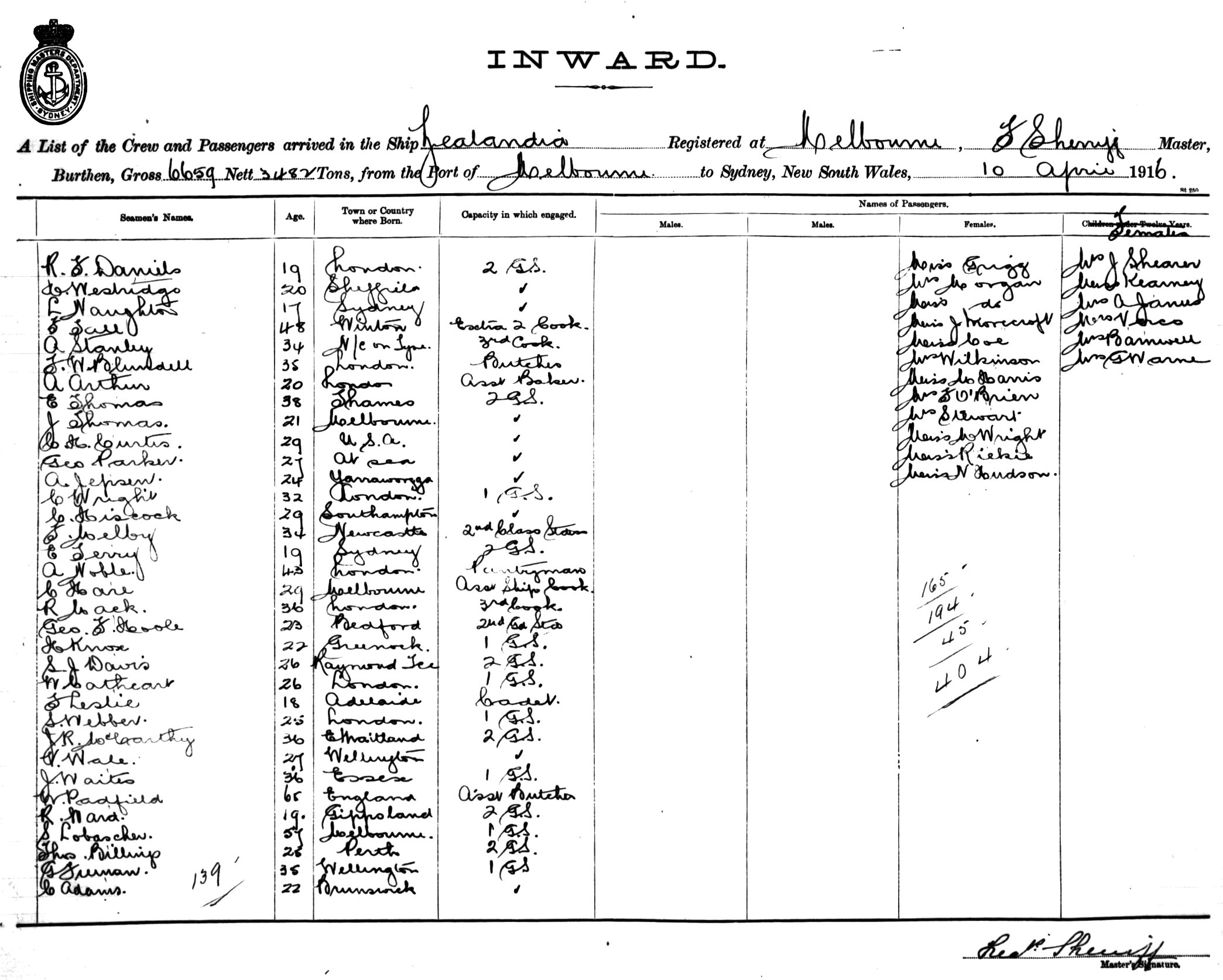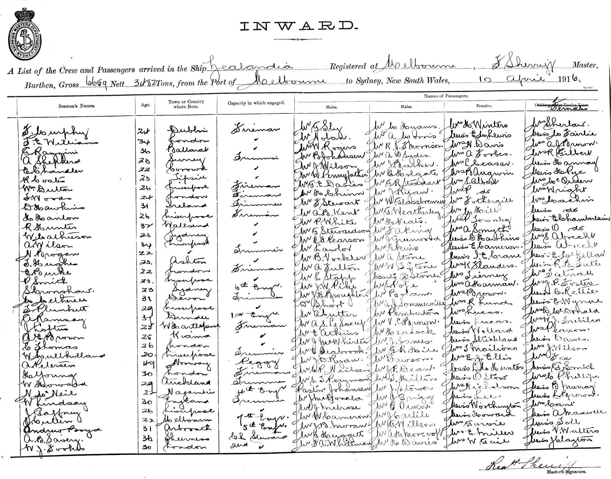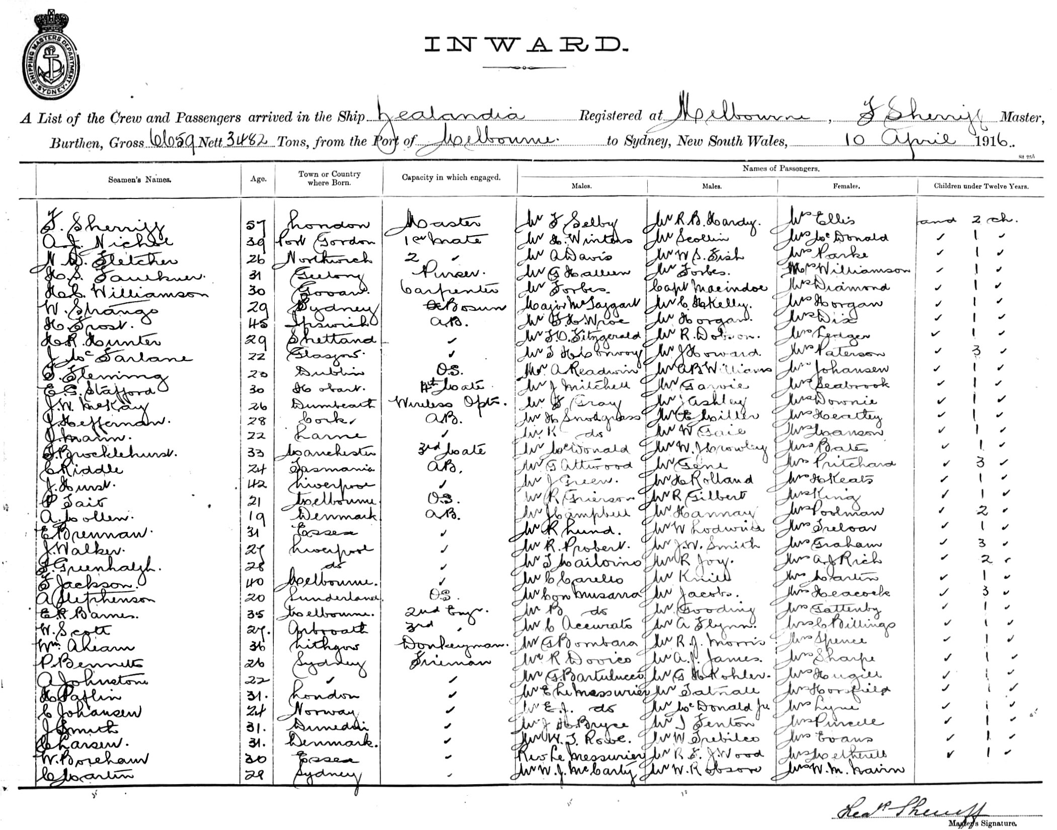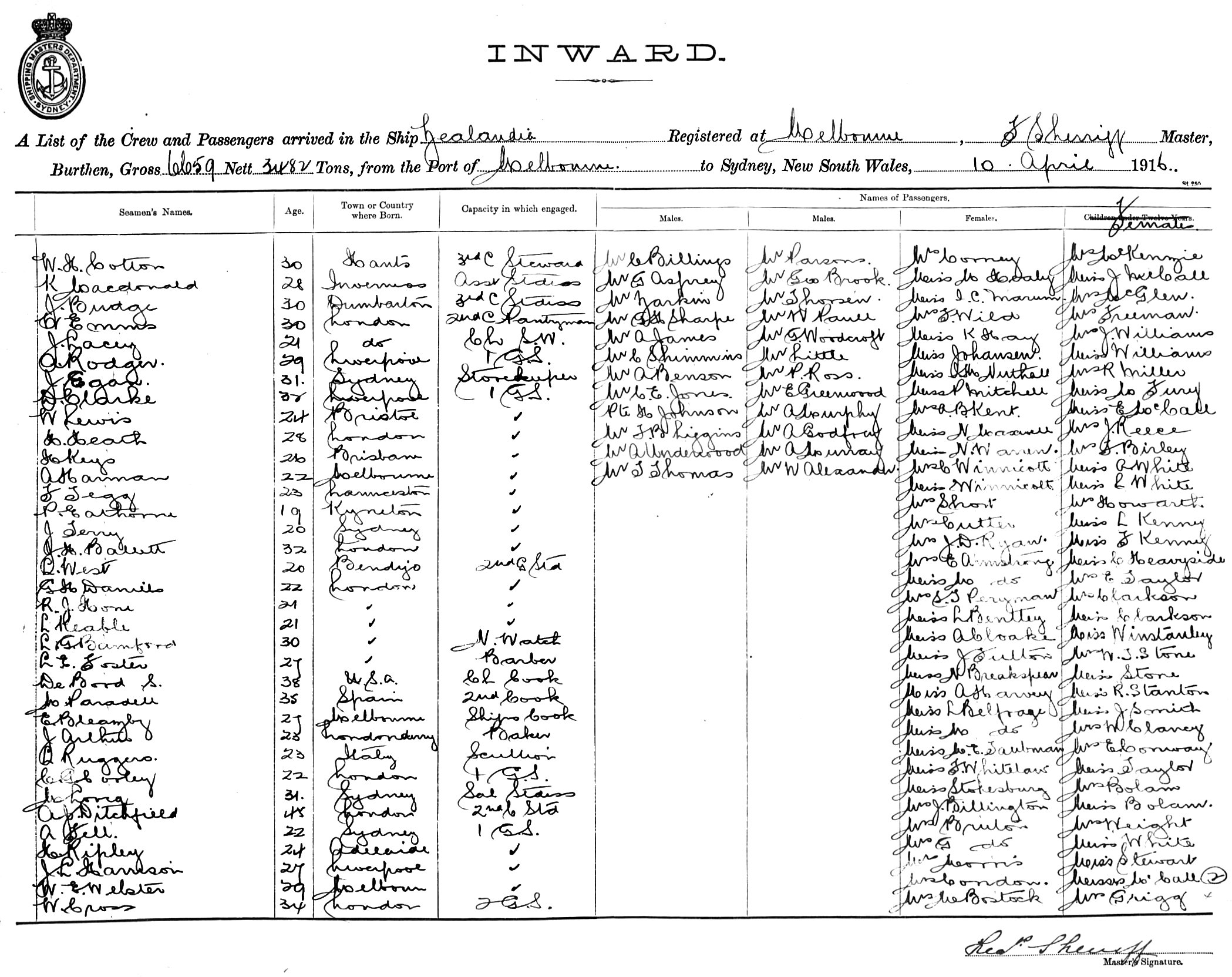 ZEALANDIAOF MELBOURNE, F. SHERRIFF, MASTER, BURTHEN 6659/3482 TONS FROM THE PORT OF MELBOURNE TO SYDNEY, NEW SOUTH WALES, 10TH APRIL 1916 |