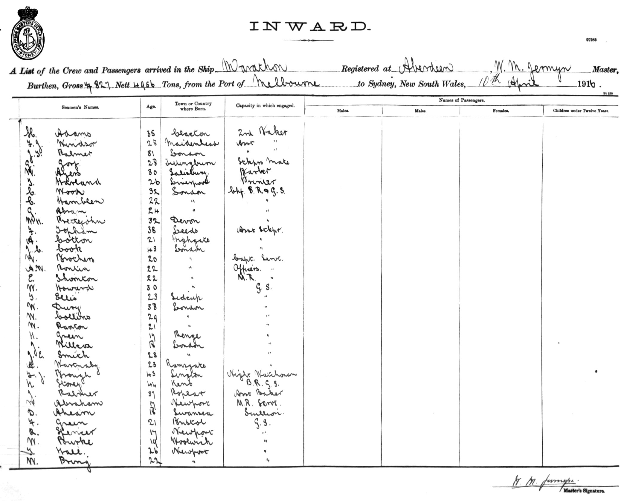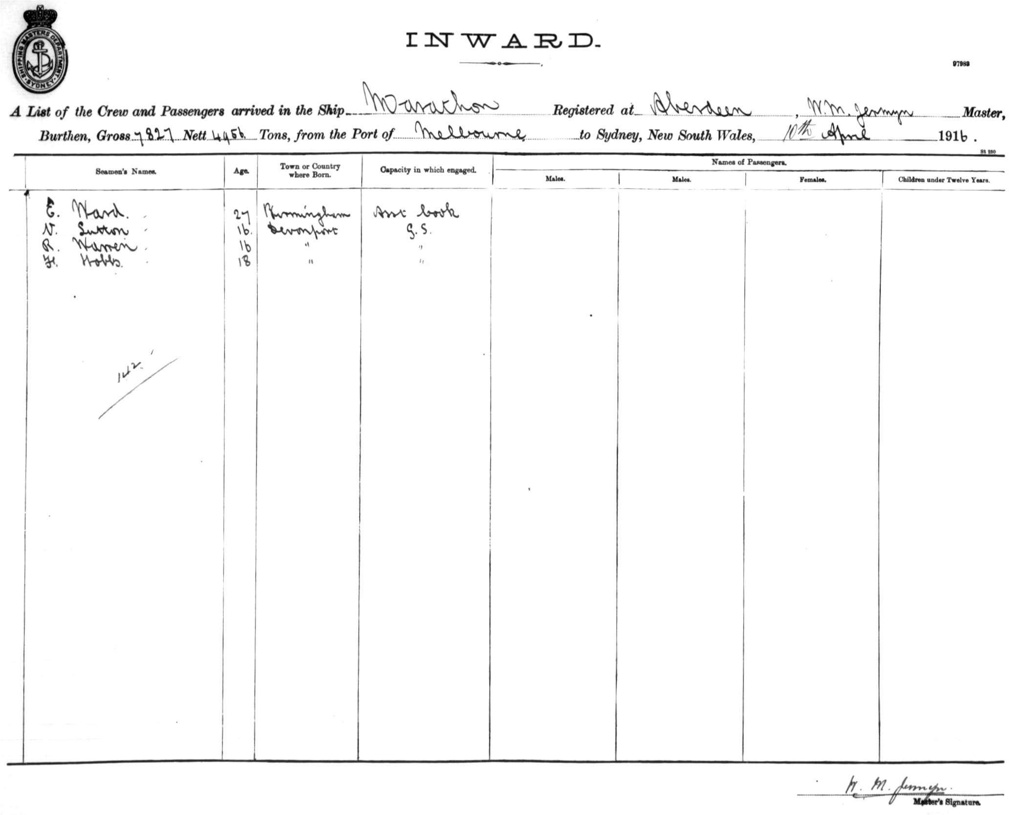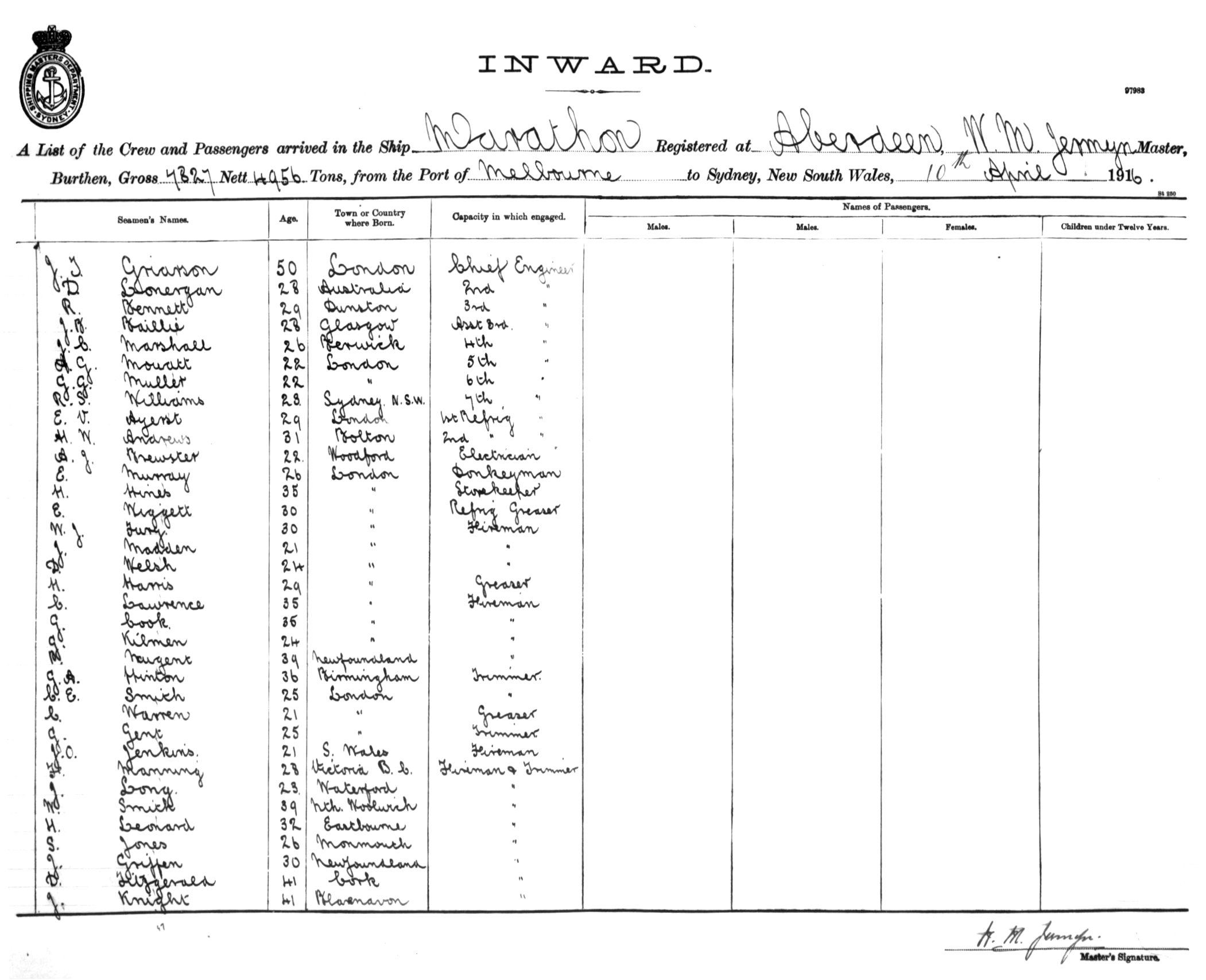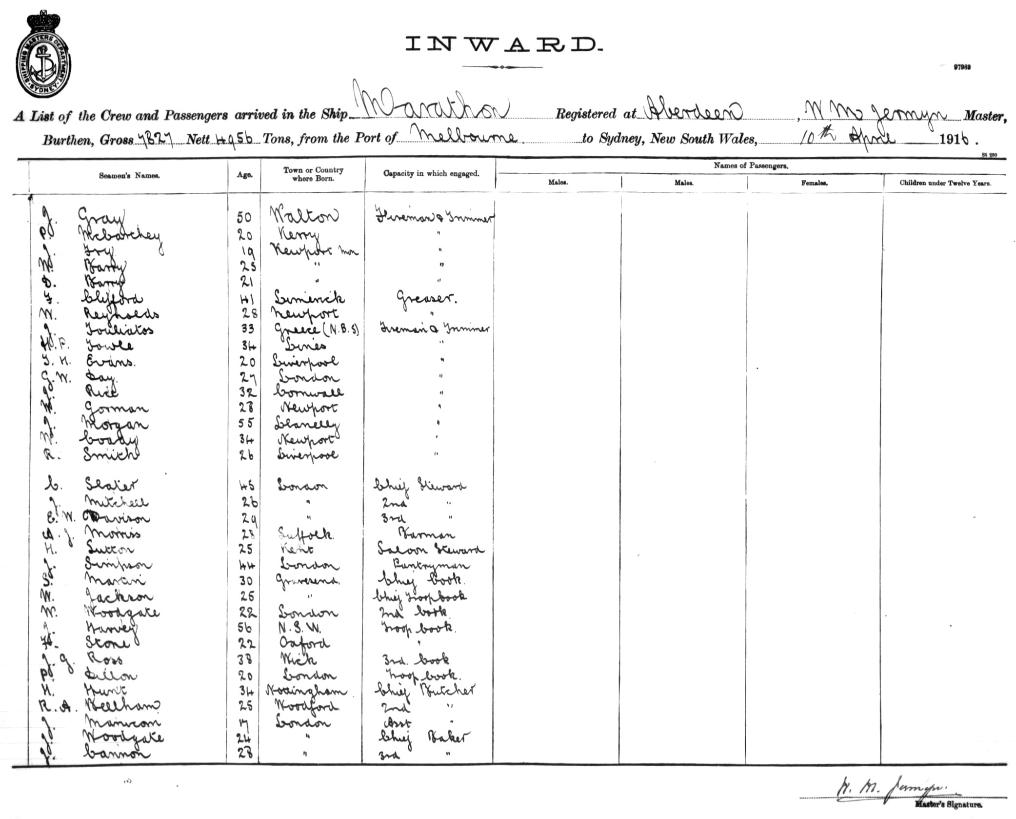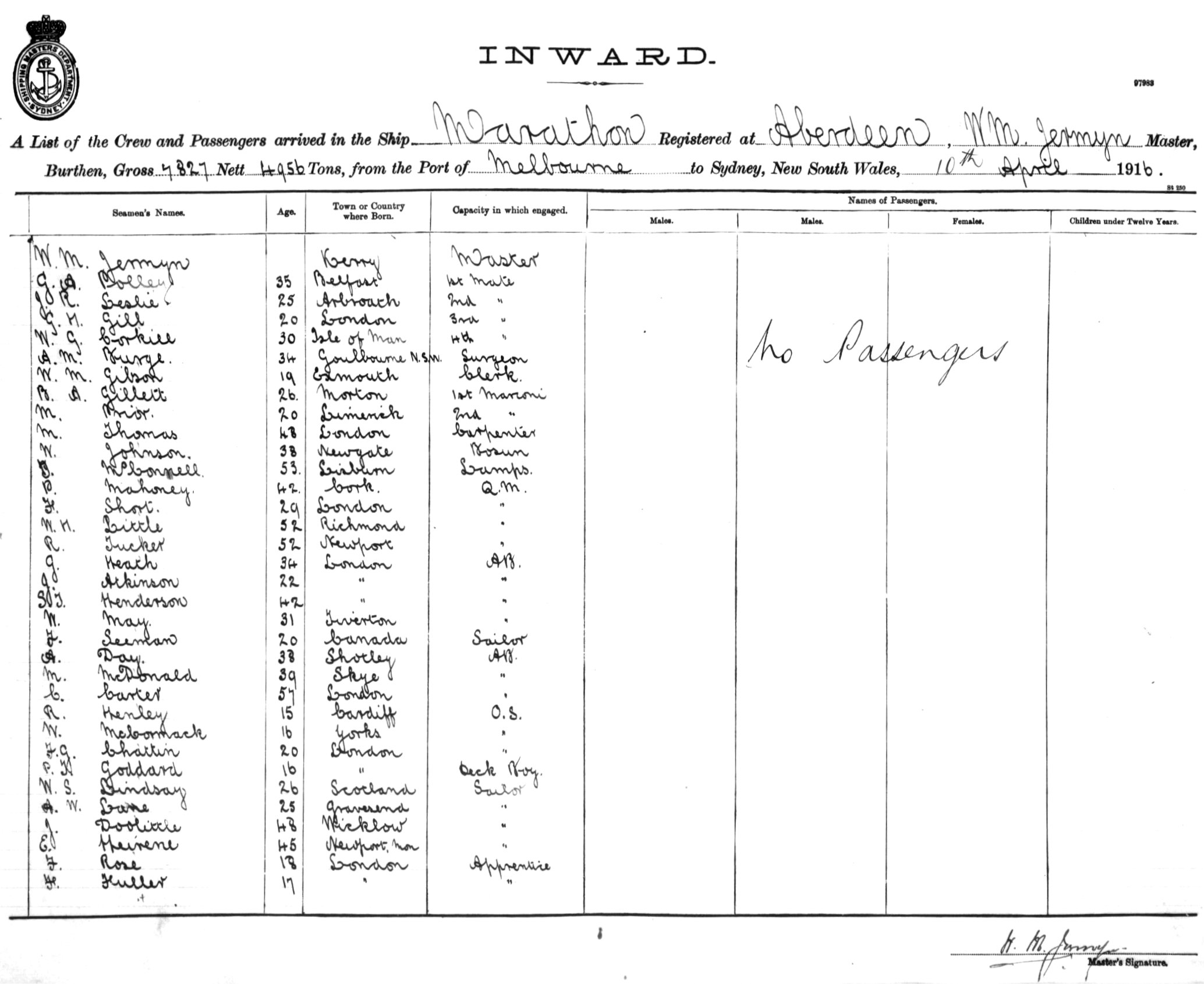 MARATHONOF ABERDEEN, W. M. JERMYN, MASTER, BURTHEN 7827/4956 TONS FROM THE PORT OF MELBOURNE TO SYDNEY, NEW SOUTH WALES, 10TH APRIL 1916 |