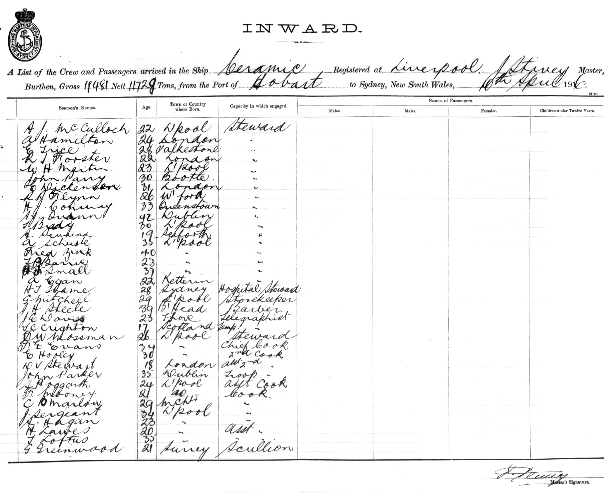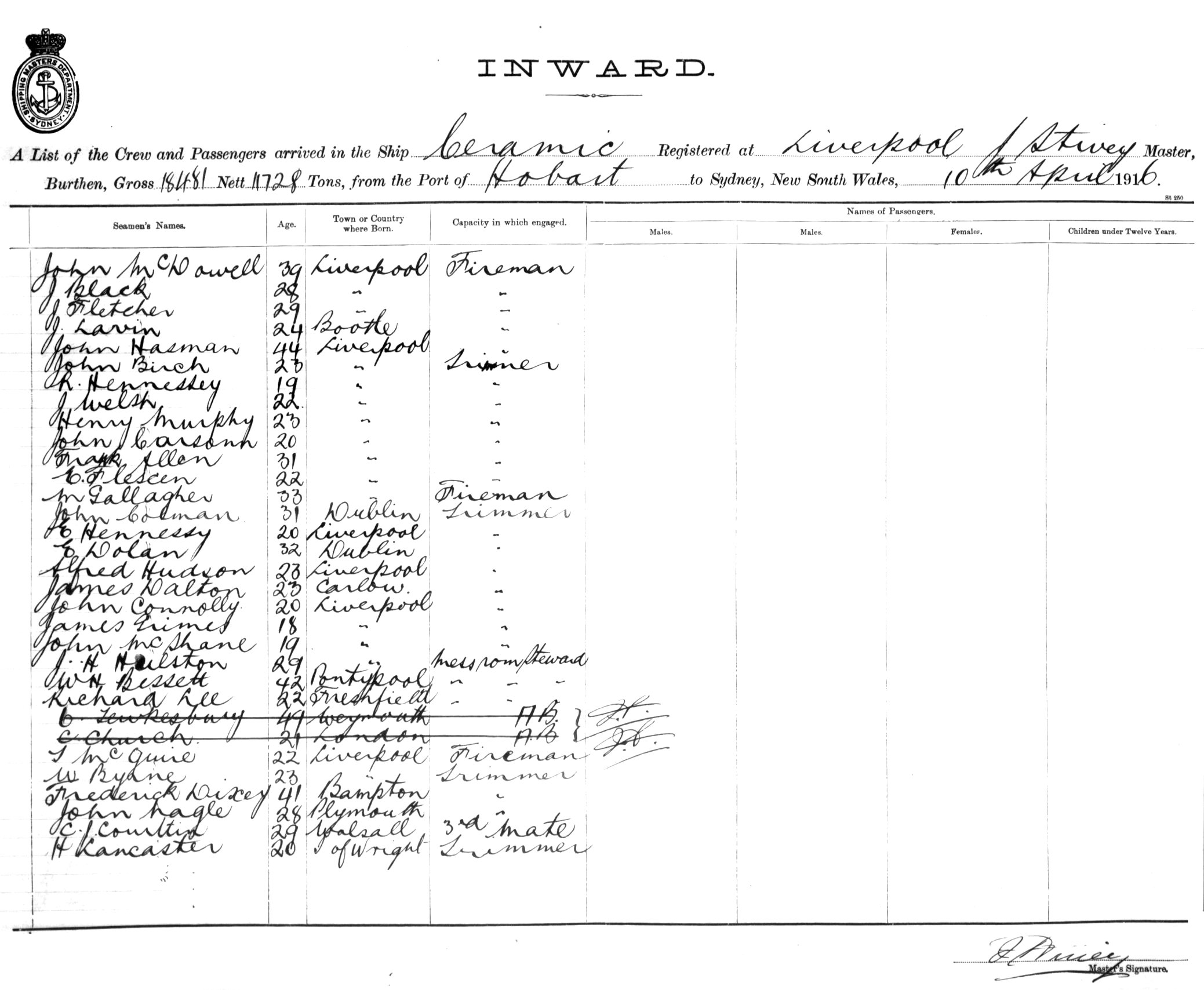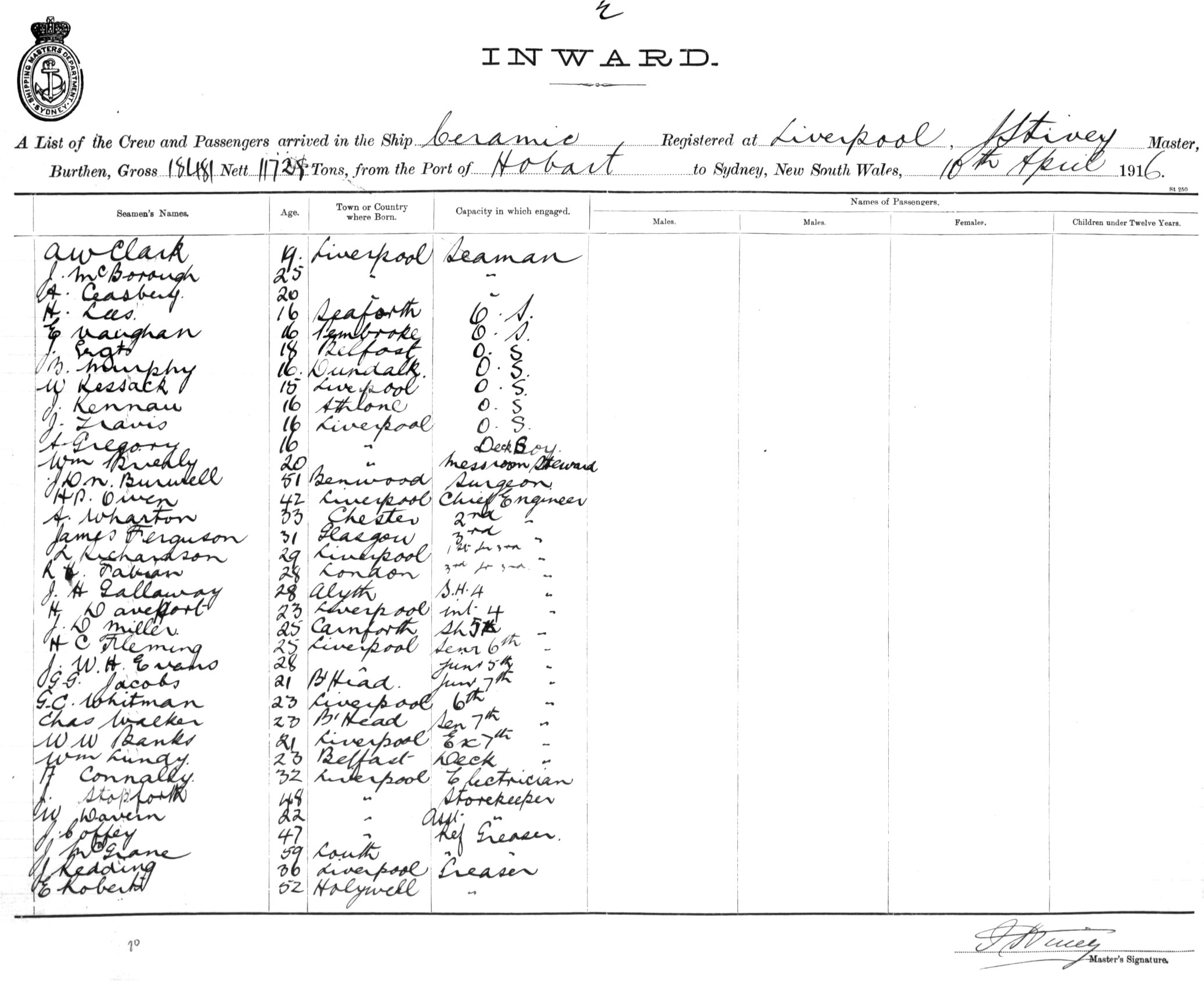 Mariners and ships in Australian Waters | CERAMICOF LIVERPOOL, J. STIVEY, MASTER, BURTHEN 18,481/11,728 TONS FROM THE PORT OF HOBART TO SYDNEY, NEW SOUTH WALES, 10TH APRIL 1916 |