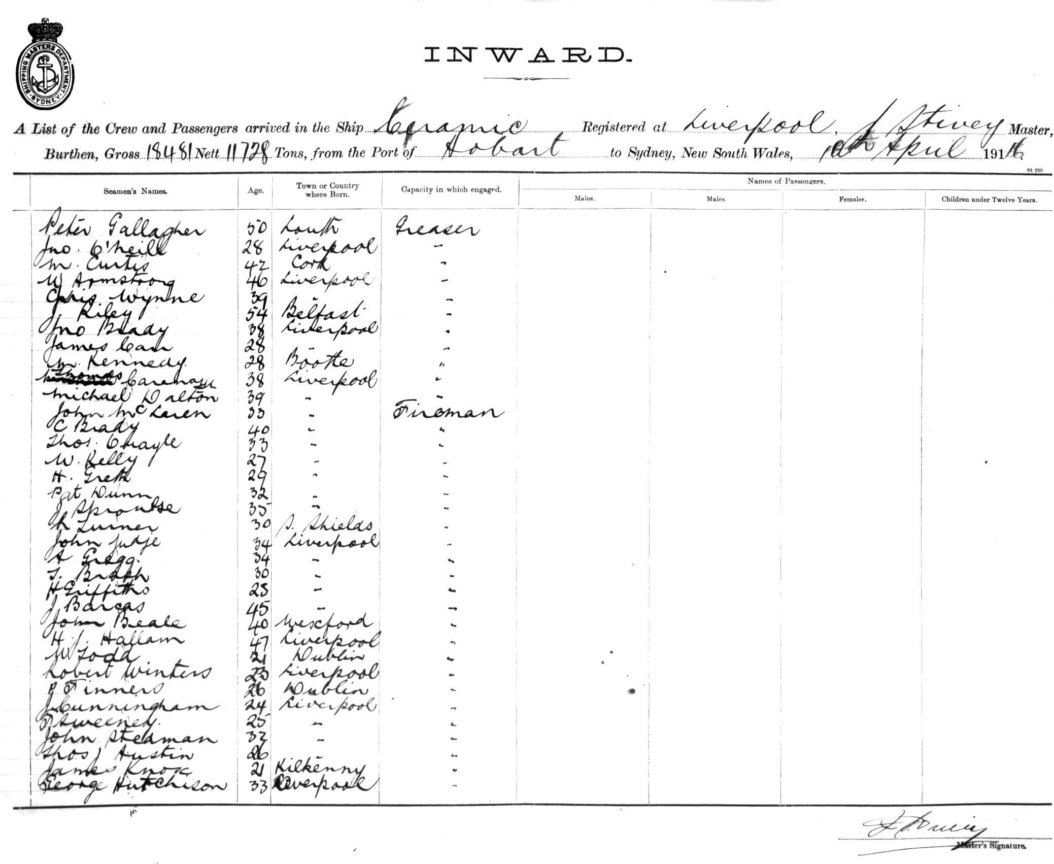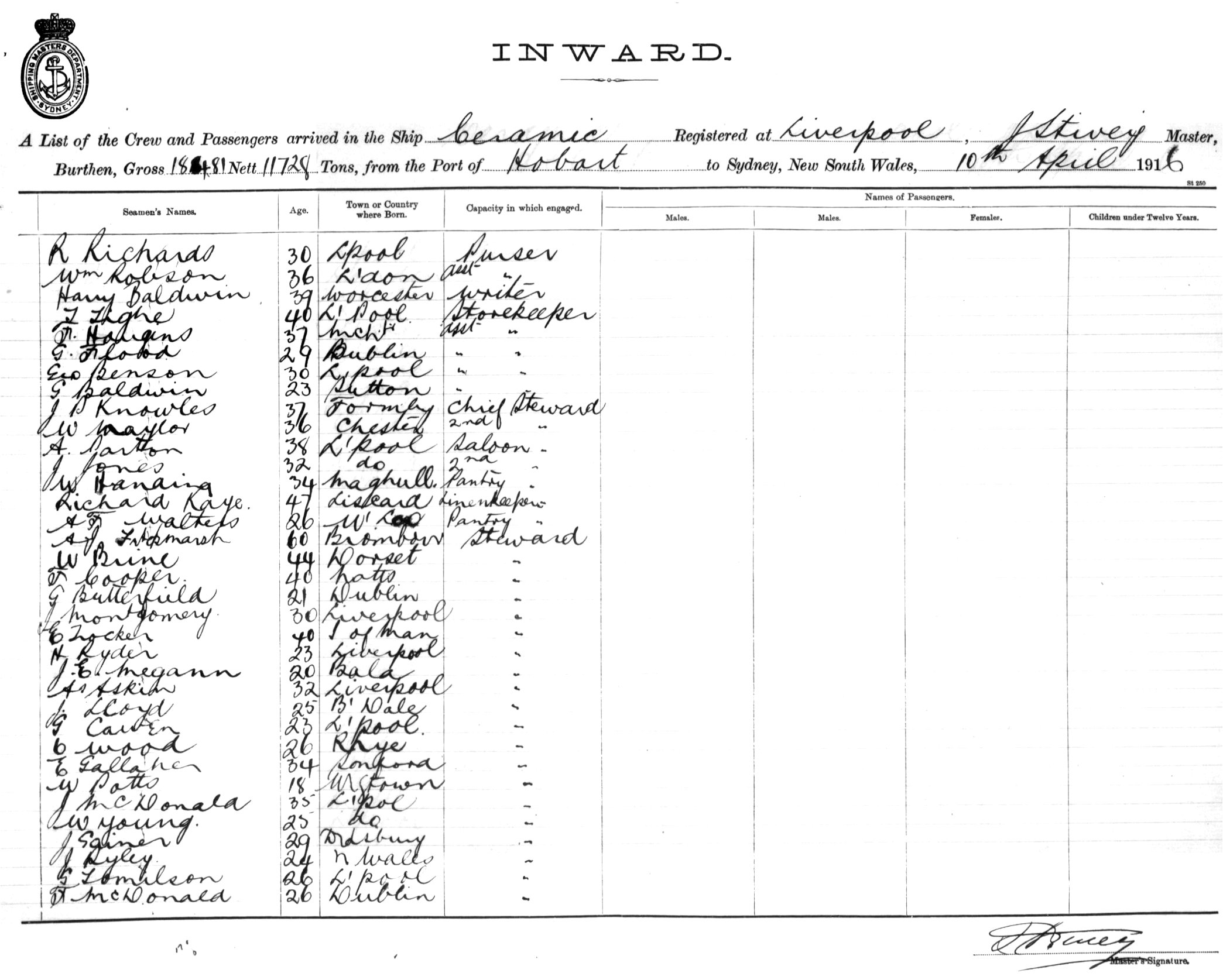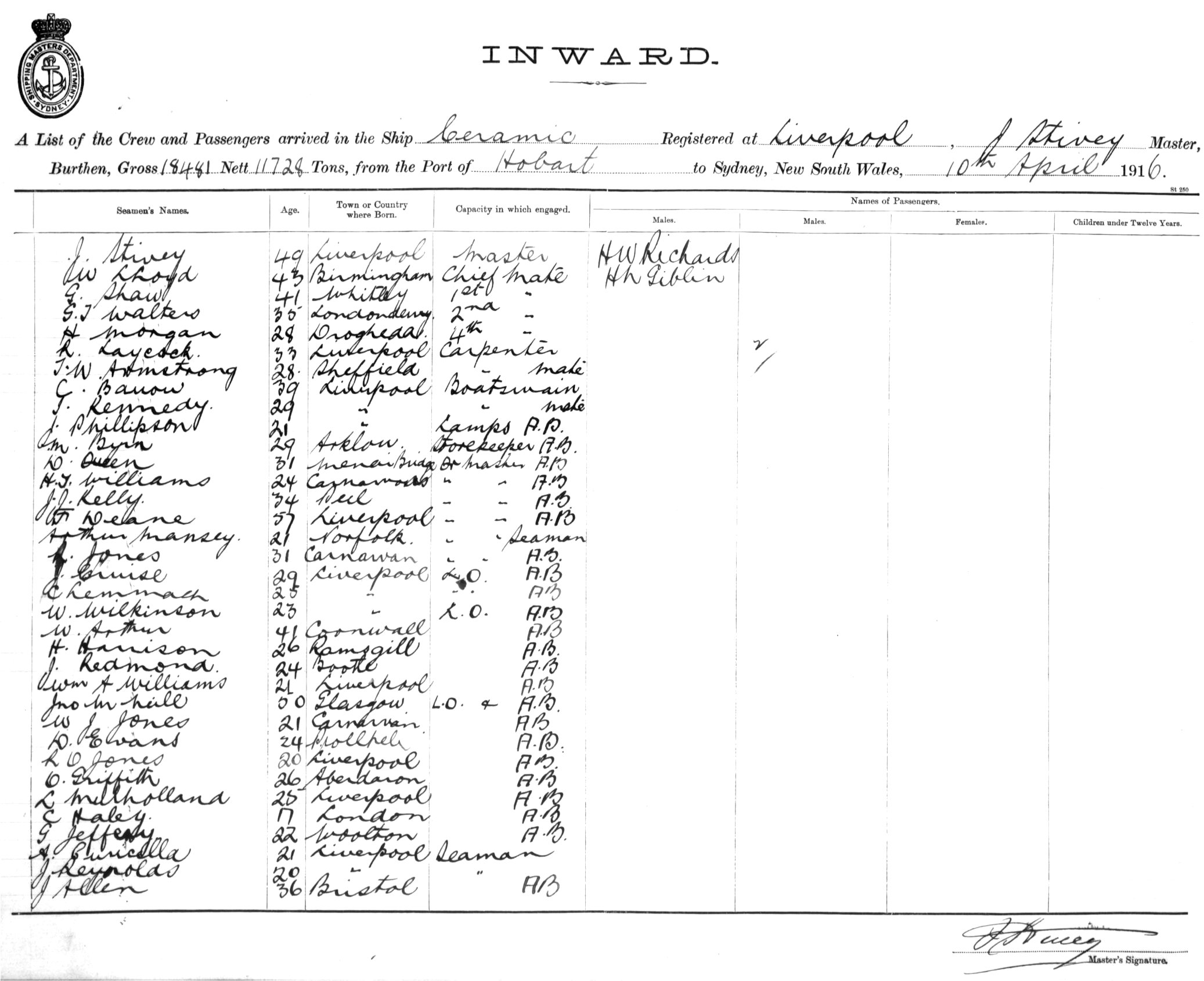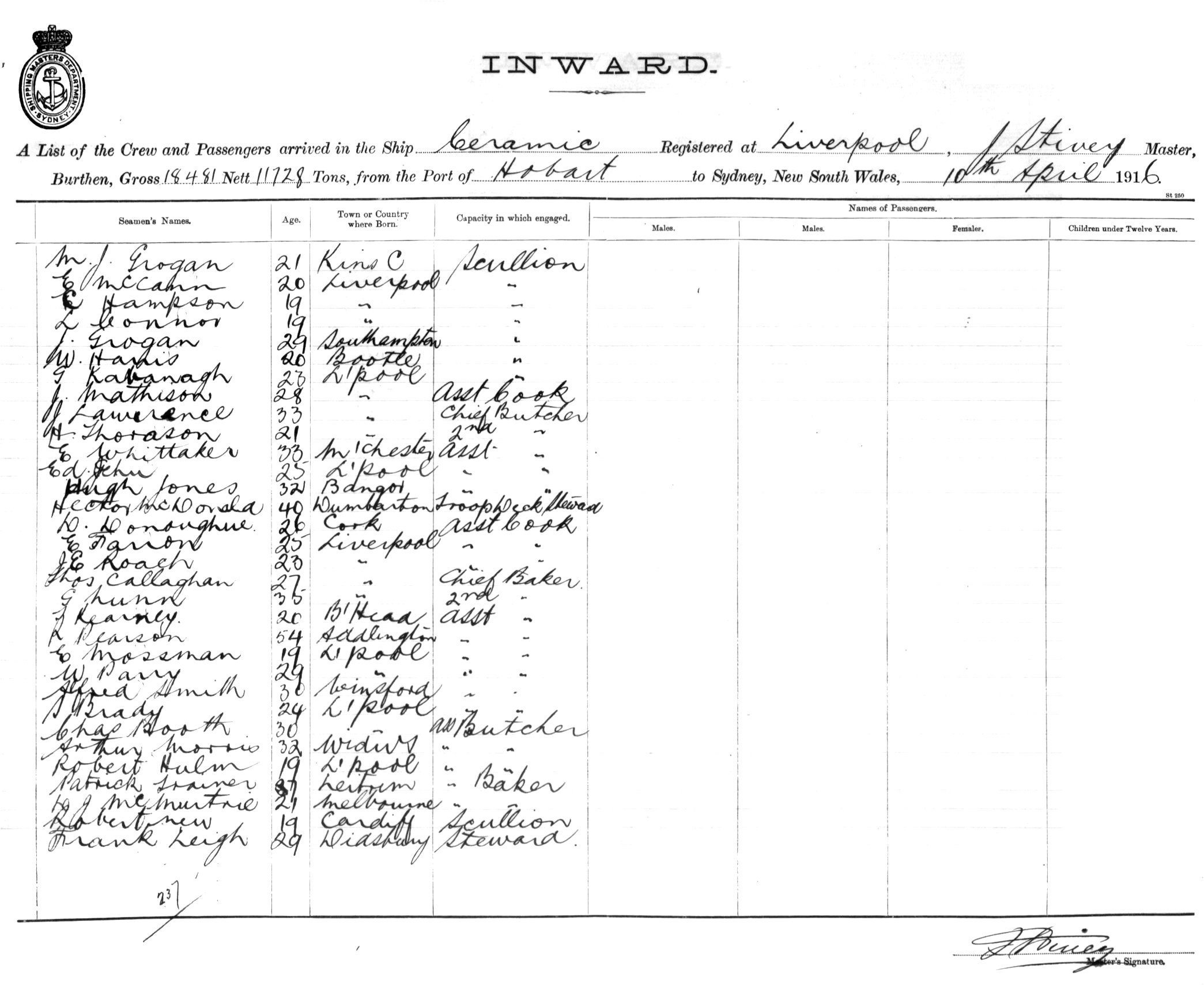 Mariners and ships in Australian Waters | CERAMICOF LIVERPOOL, J. STIVEY, MASTER, BURTHEN 18,481/11,728 TONS FROM THE PORT OF HOBART TO SYDNEY, NEW SOUTH WALES, 10TH APRIL 1916 |