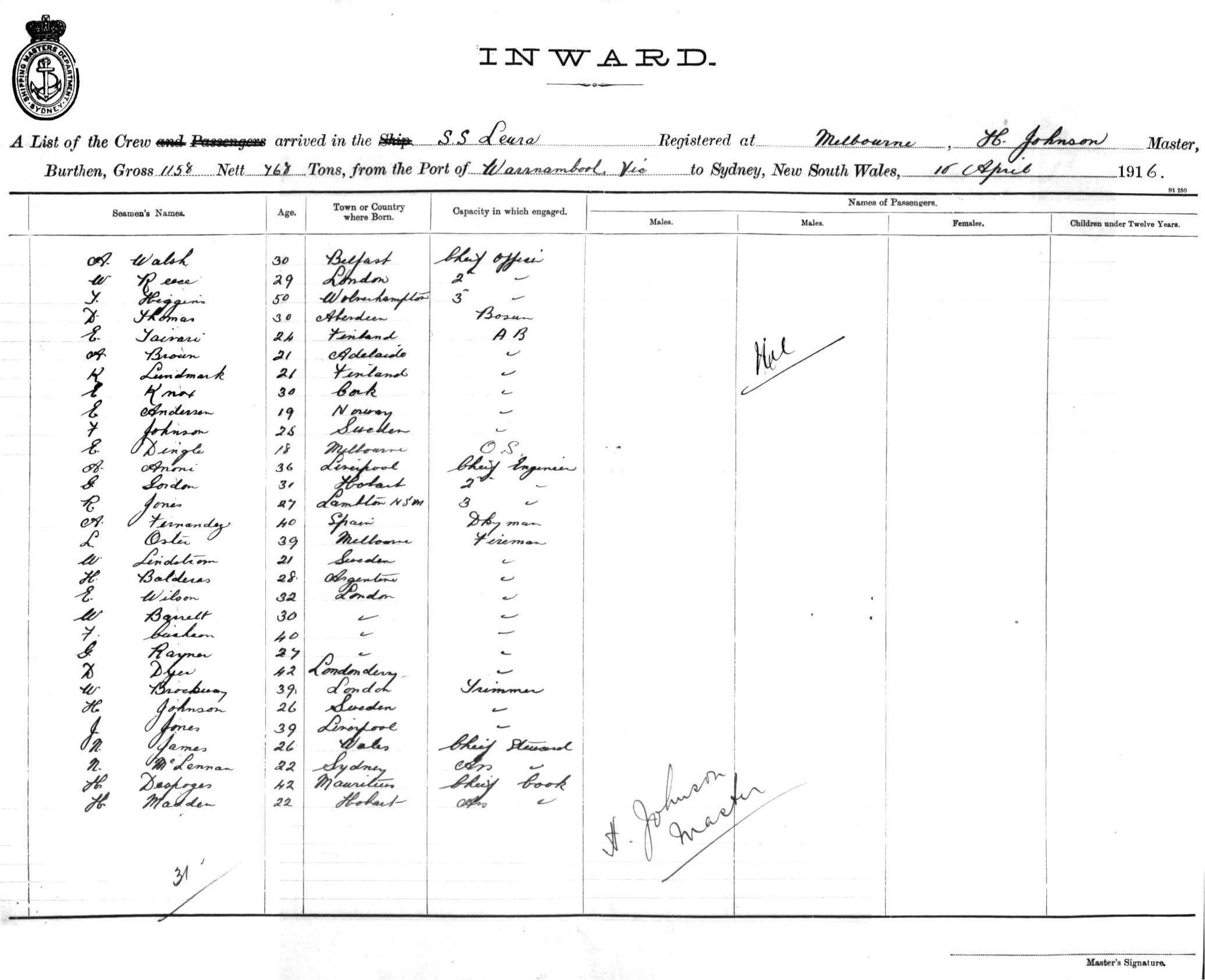 LEURAOF MELBOURNE, H. JOHNSON, MASTER, BURTHEN 1158/768 TONS FROM THE PORT OF WARRNAMBOOL, VIC. TO SYDNEY, NEW SOUTH WALES, 10TH APRIL 1916 |