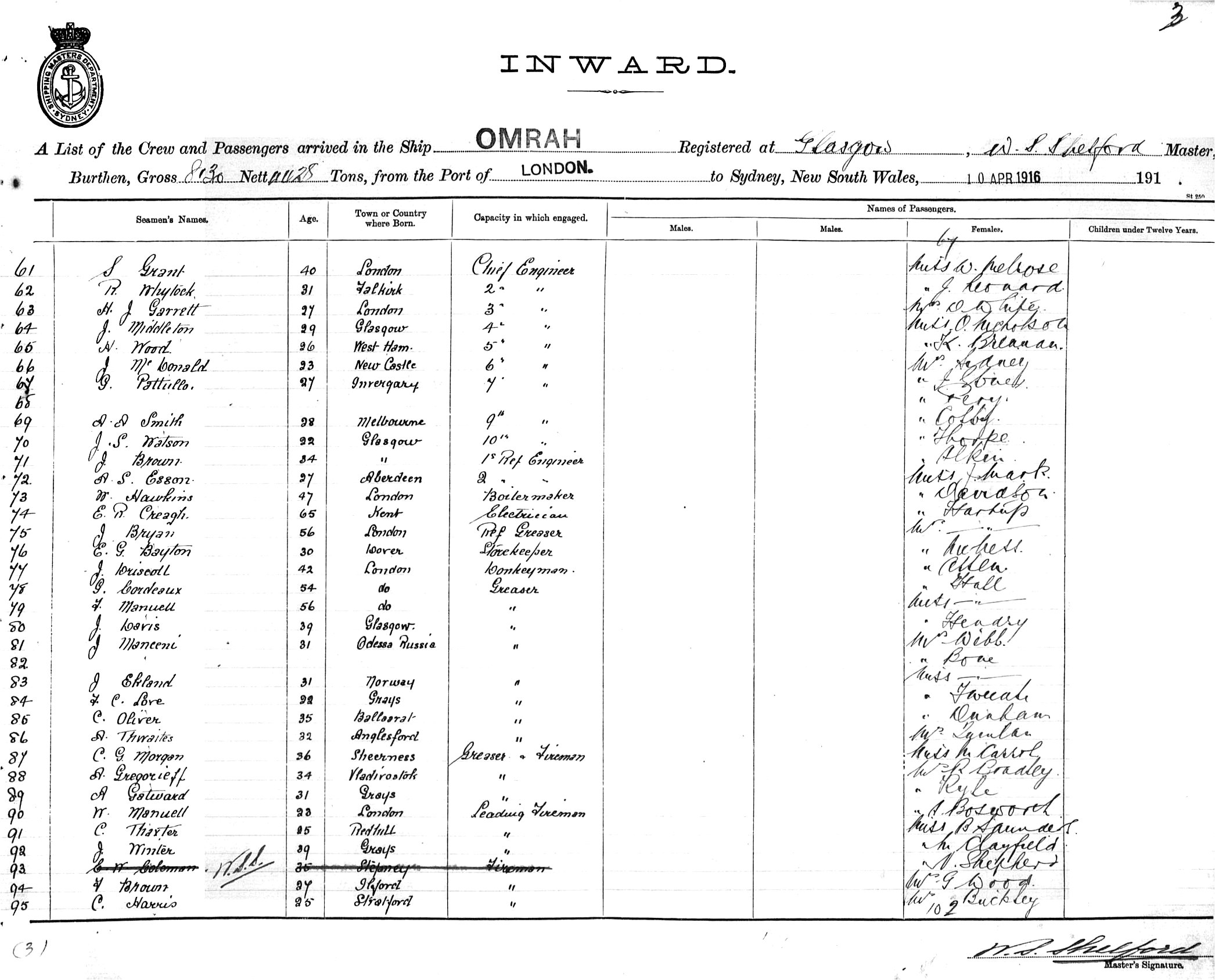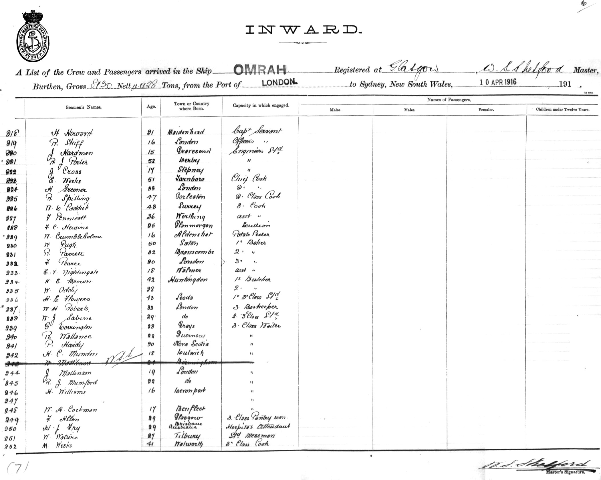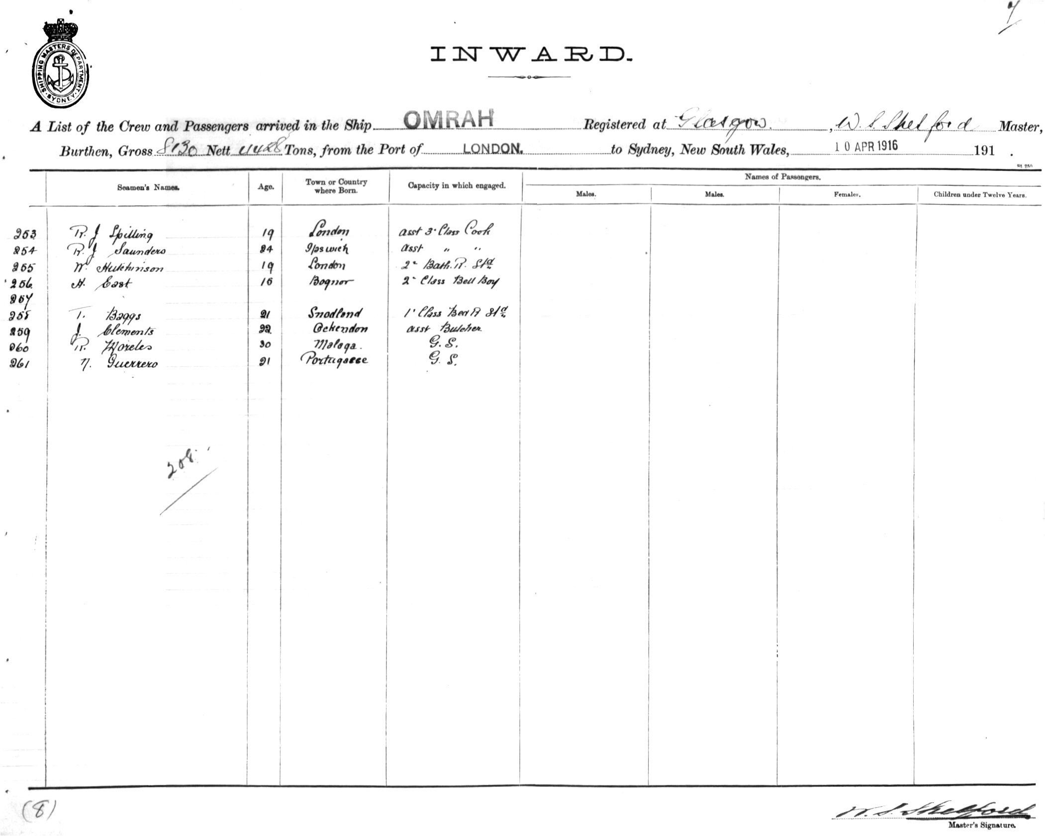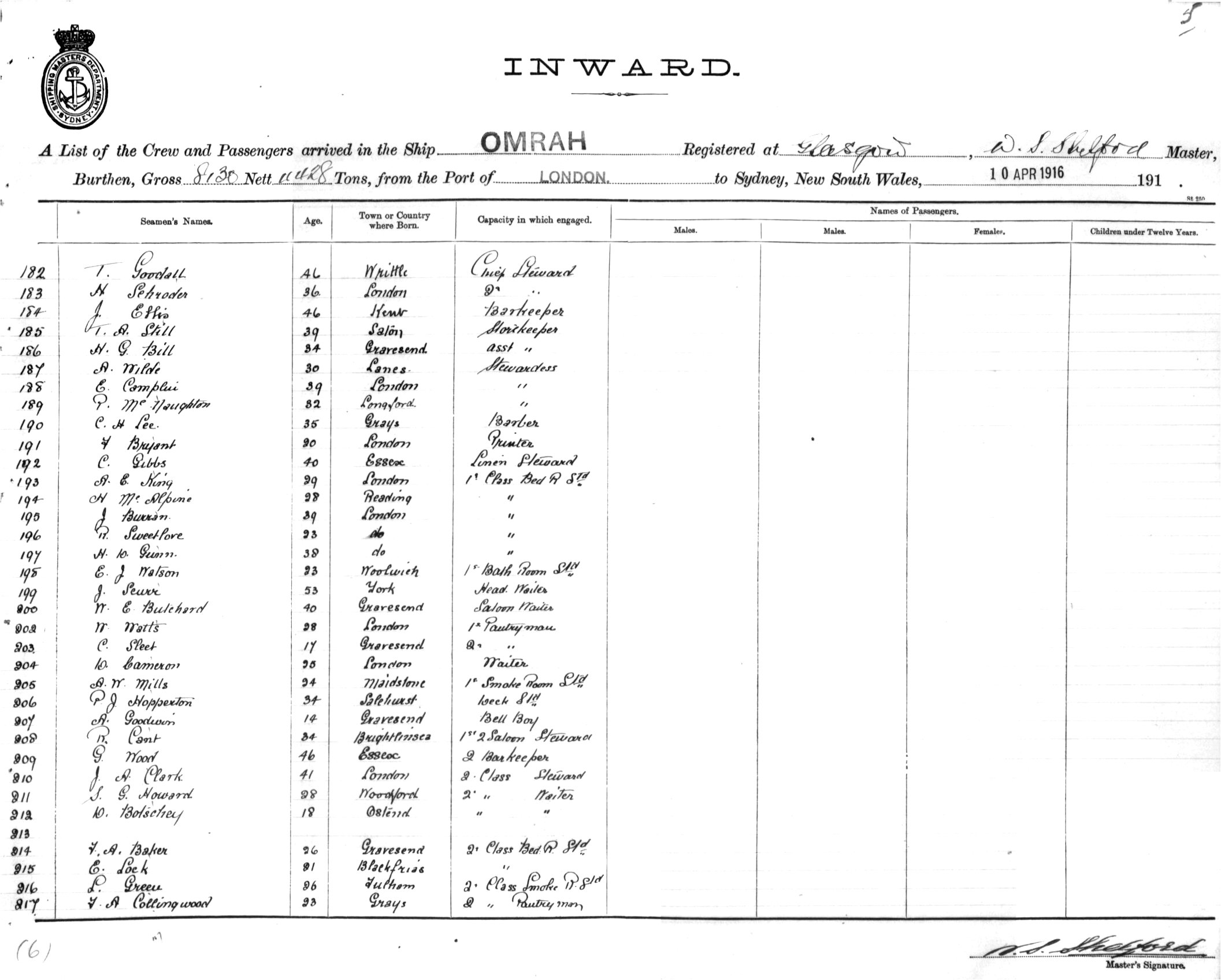 OMRAHOF GLASGOW, W. S. SHELFORD, MASTER, BURTHEN 8130/4428TONS FROM THE PORT OF LONDON TO SYDNEY, NEW SOUTH WALES, 10TH APRIL 1916 |