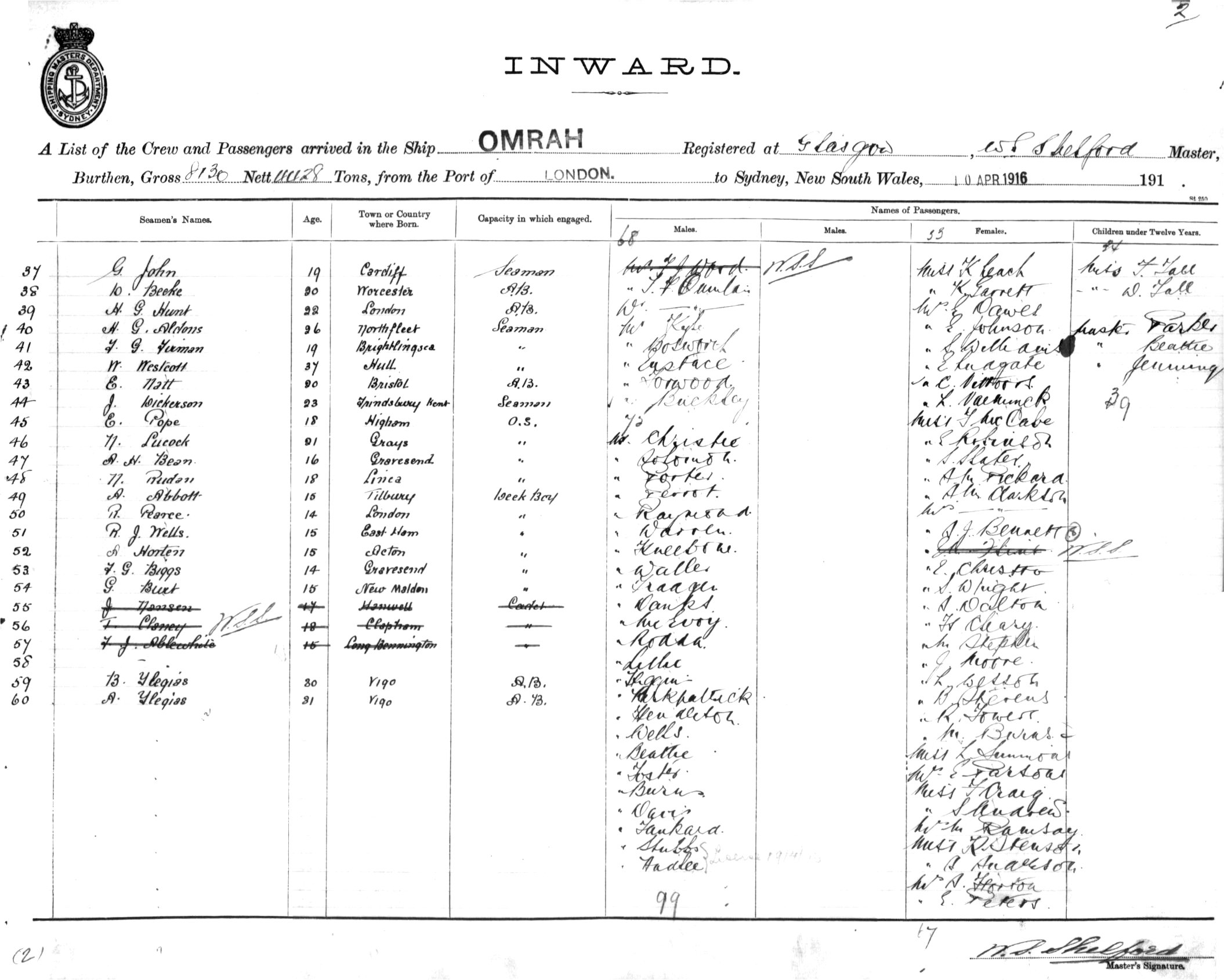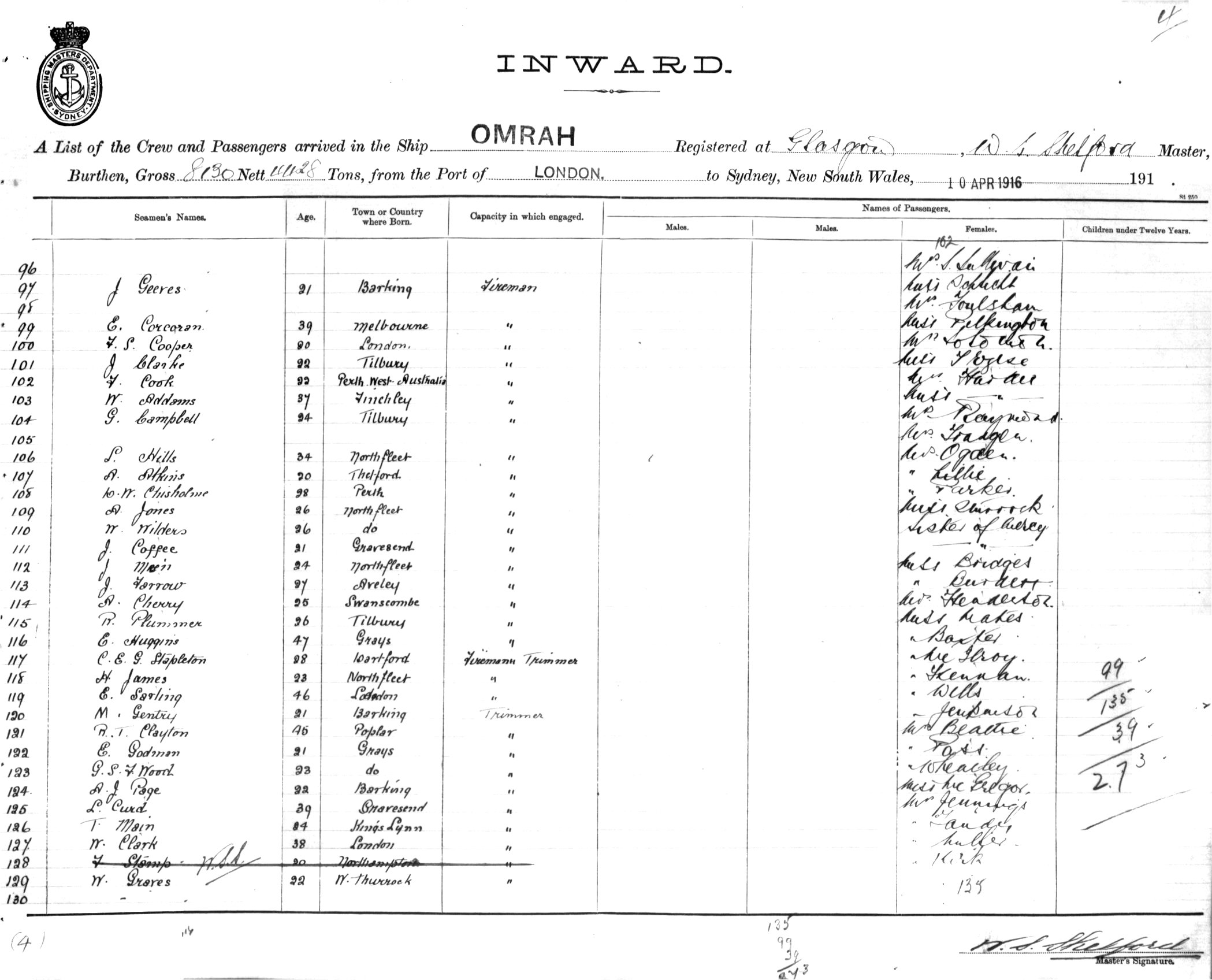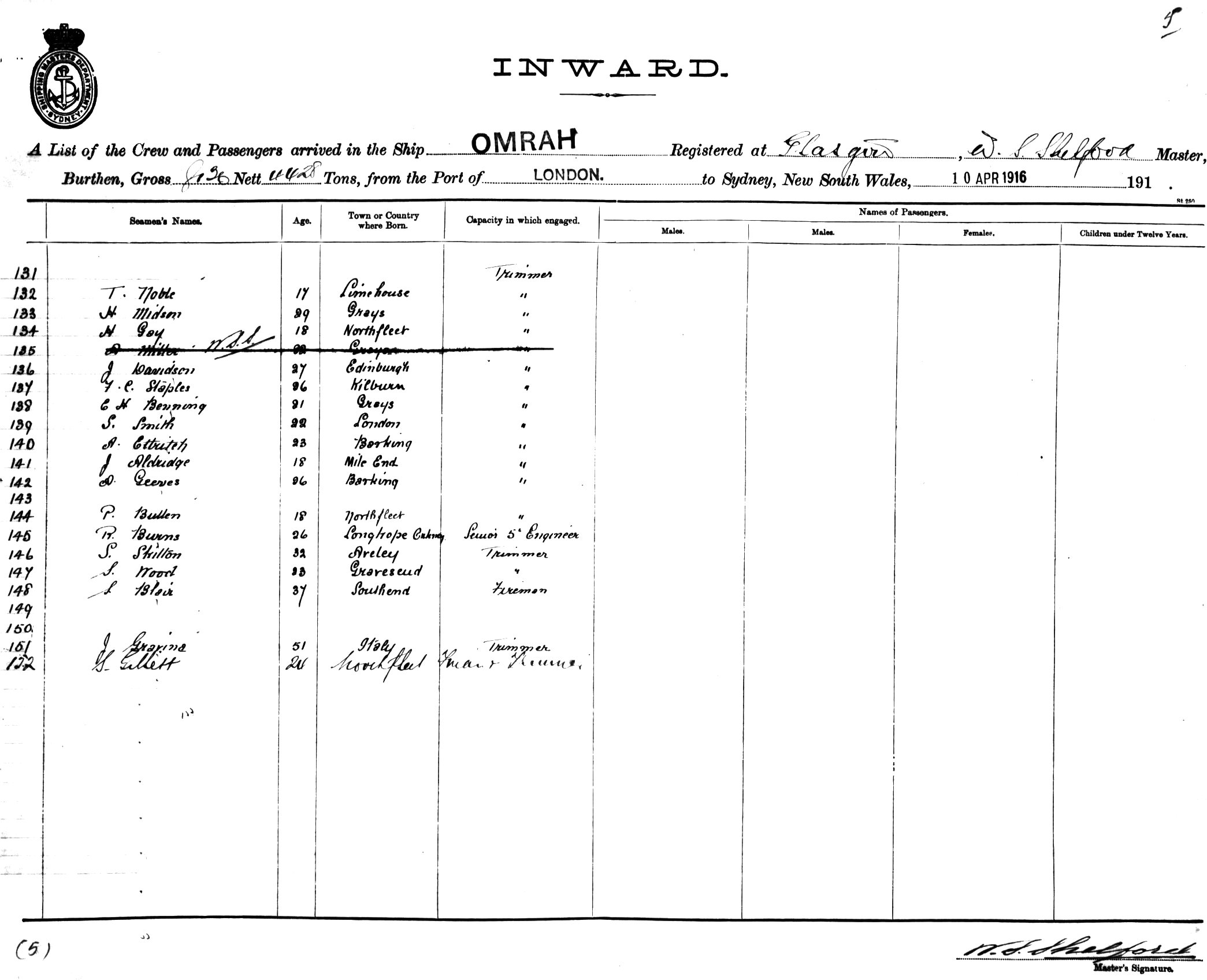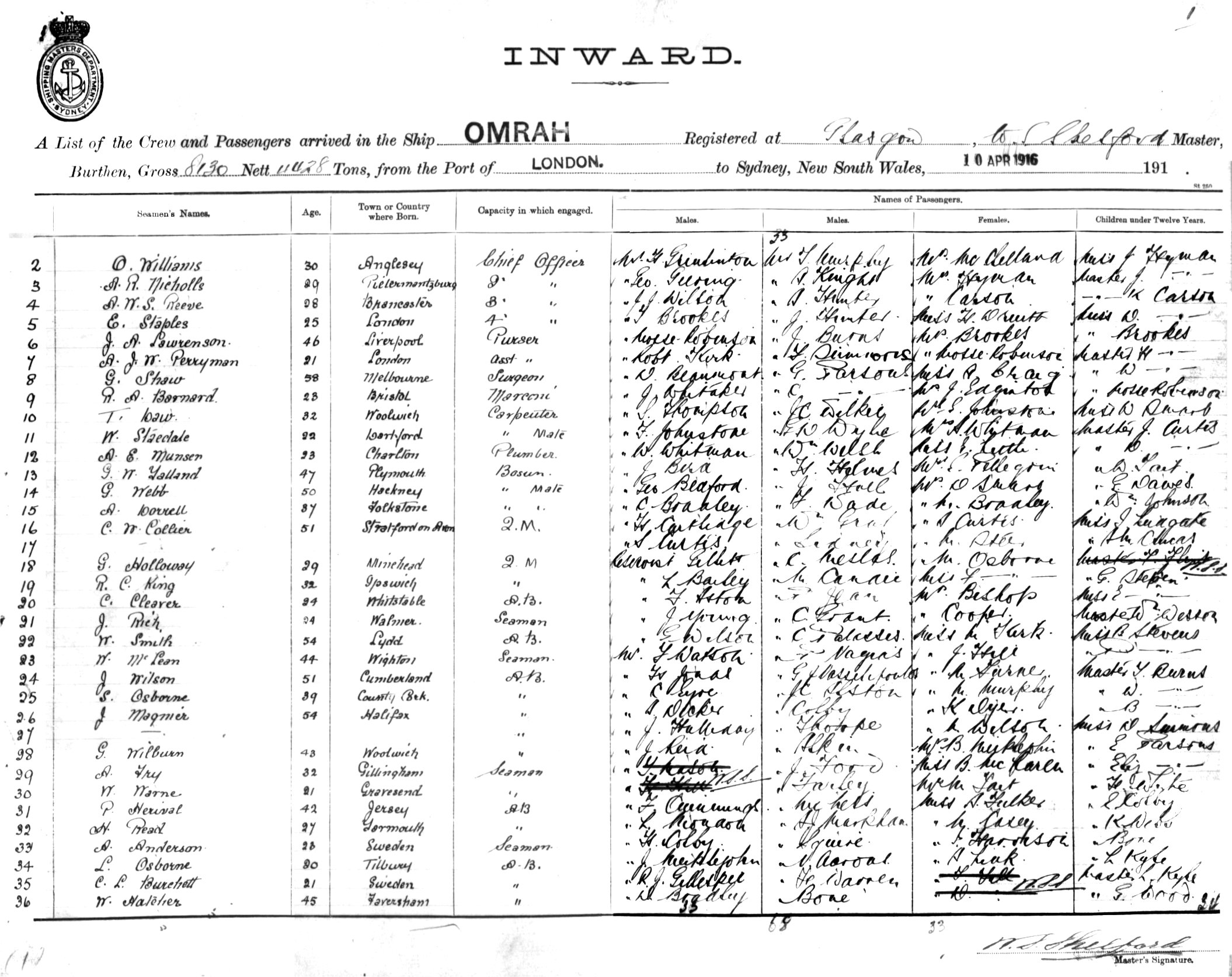 OMRAHOF GLASGOW, W. S. SHELFORD, MASTER, BURTHEN 8130/4428TONS FROM THE PORT OF LONDON TO SYDNEY, NEW SOUTH WALES, 10TH APRIL 1916 |