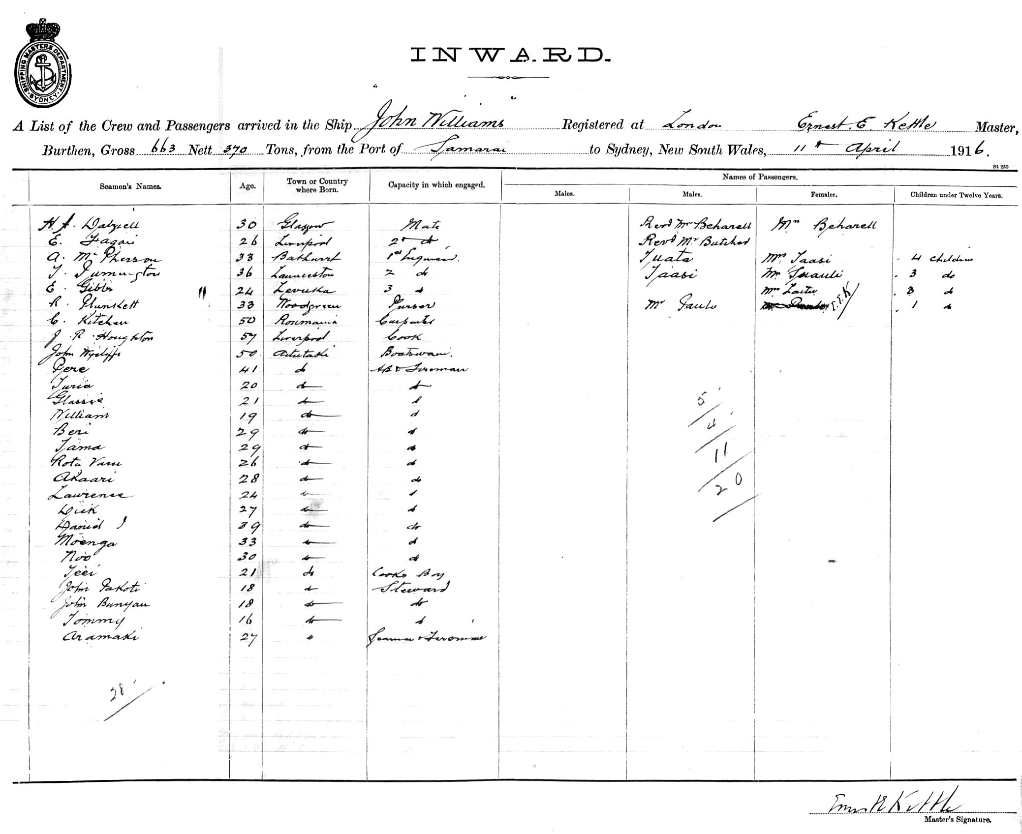 JOHN WILLIAMSOF LONDON, ERNEST E. KETTLE, MASTER, BURTHEN 663/370 TONS FROM THE PORT OF SAMARAI TO SYDNEY, NEW SOUTH WALES, 11TH APRIL 1916 |