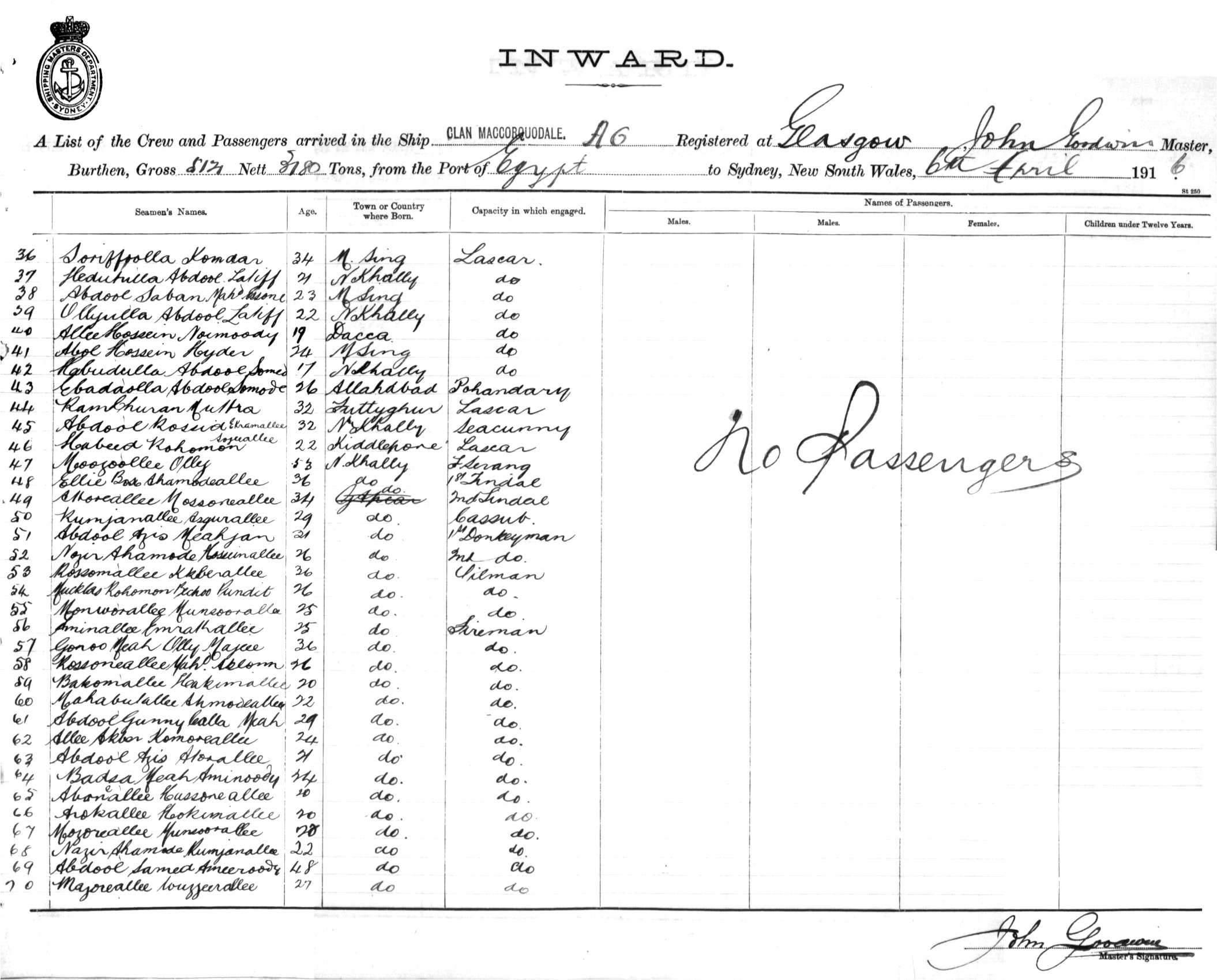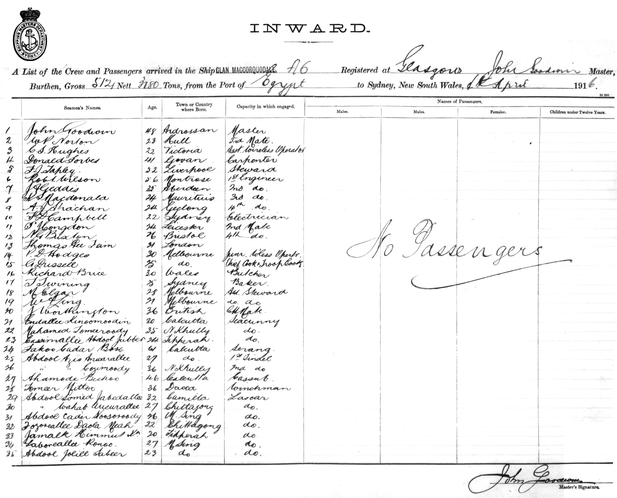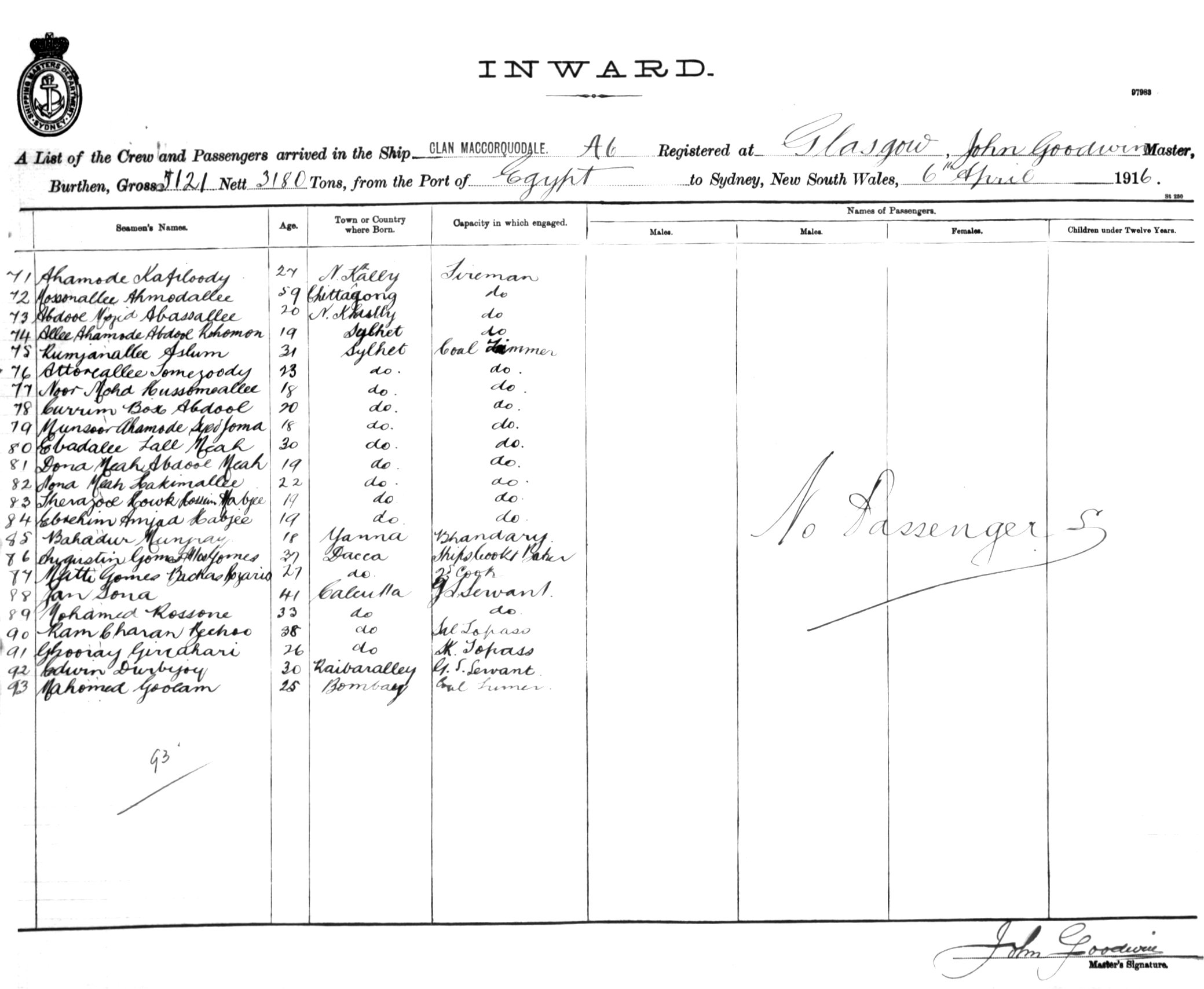 CLAN MACCORQUODALEOF GLASGOW, JOHN GOODWIN, MASTER, BURTHEN 5121/3180 TONS FROM THE PORT OF EGYPT TO SYDNEY, NEW SOUTH WALES, 6TH APRIL 1916 |