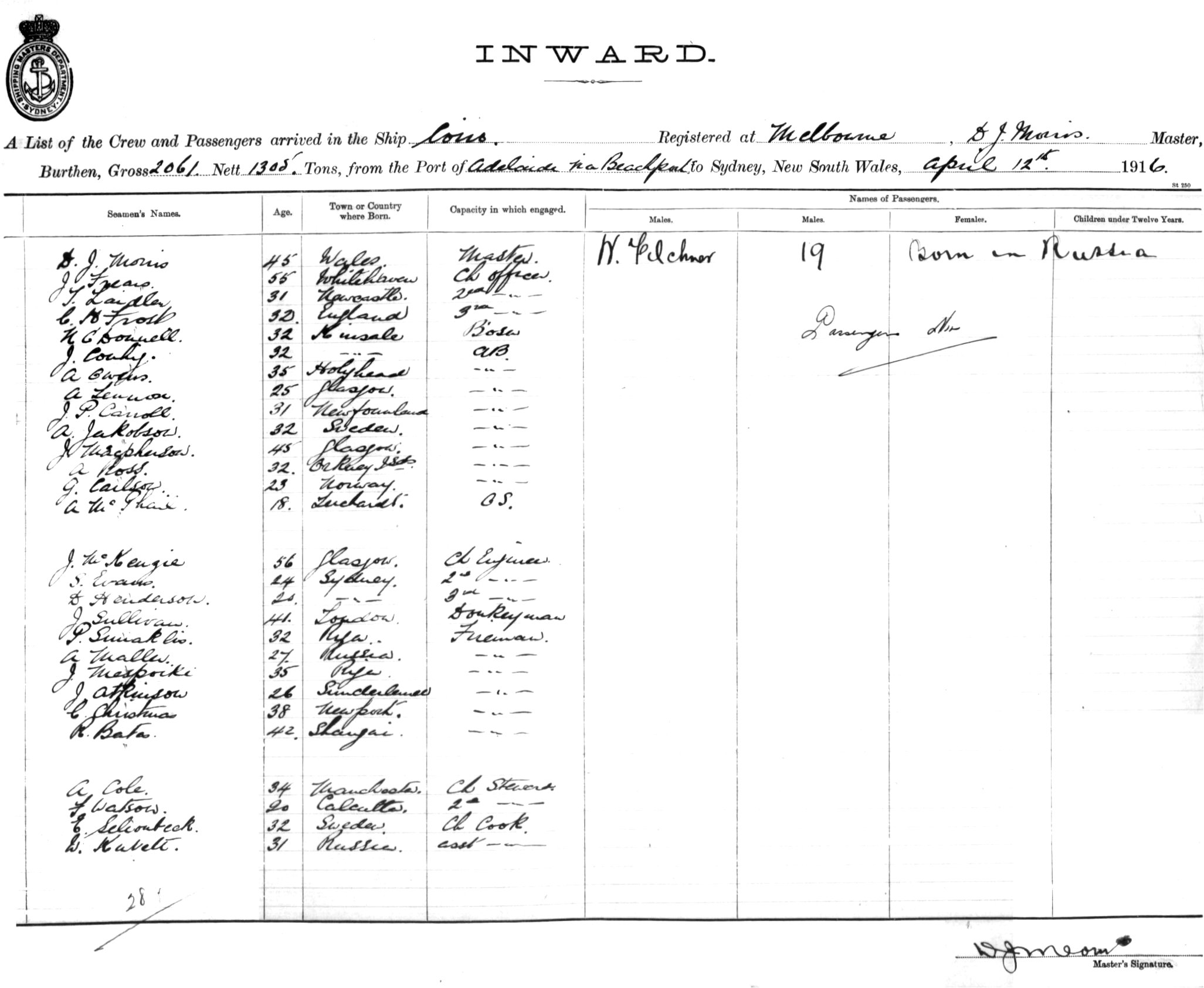 CORIOOF MELBOURNE, D. J. MORRIS, MASTER, BURTHEN 2061/1305 TONS FROM THE PORT OF ADELAIDE via BEACHPORT TO SYDNEY, NEW SOUTH WALES, 12TH APRIL 1916 |