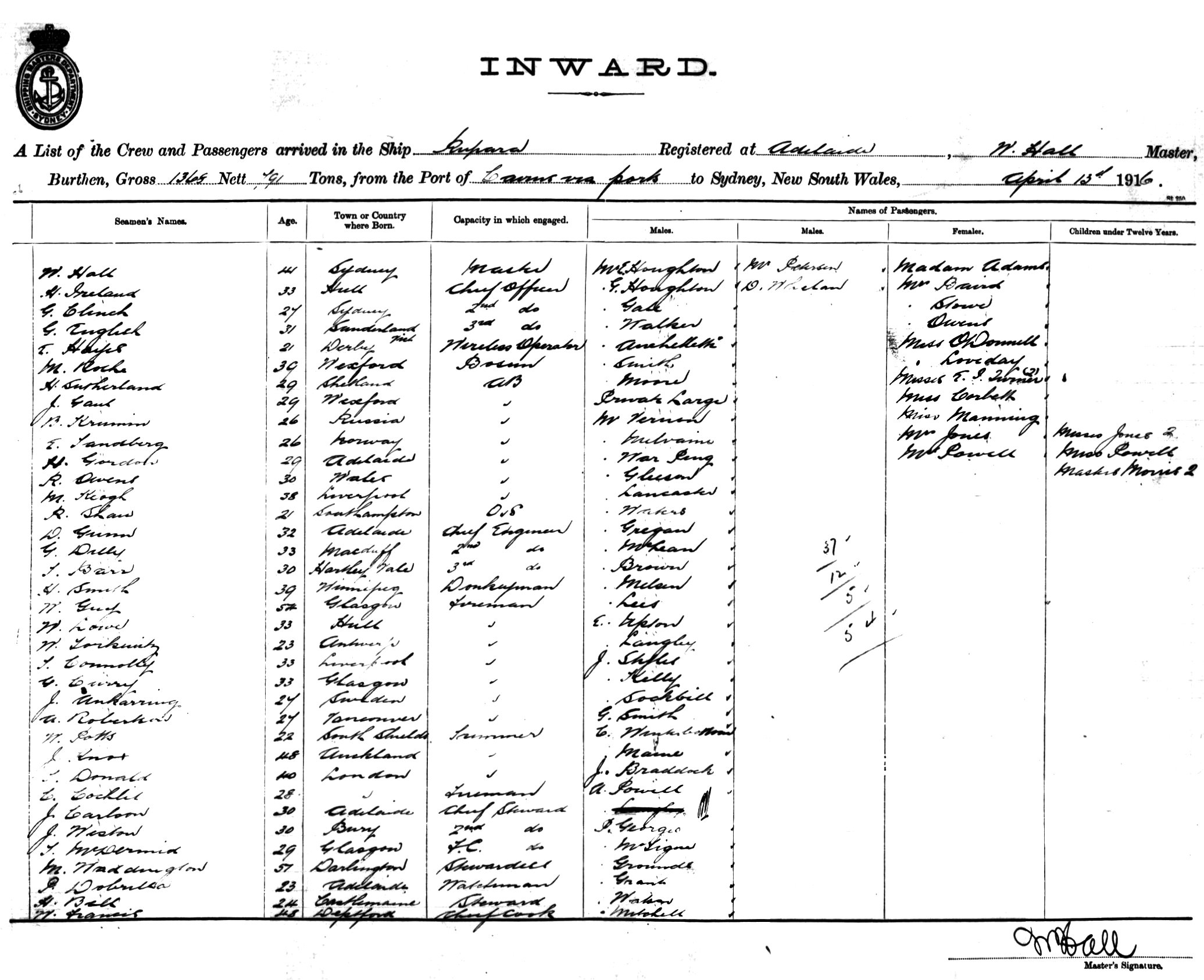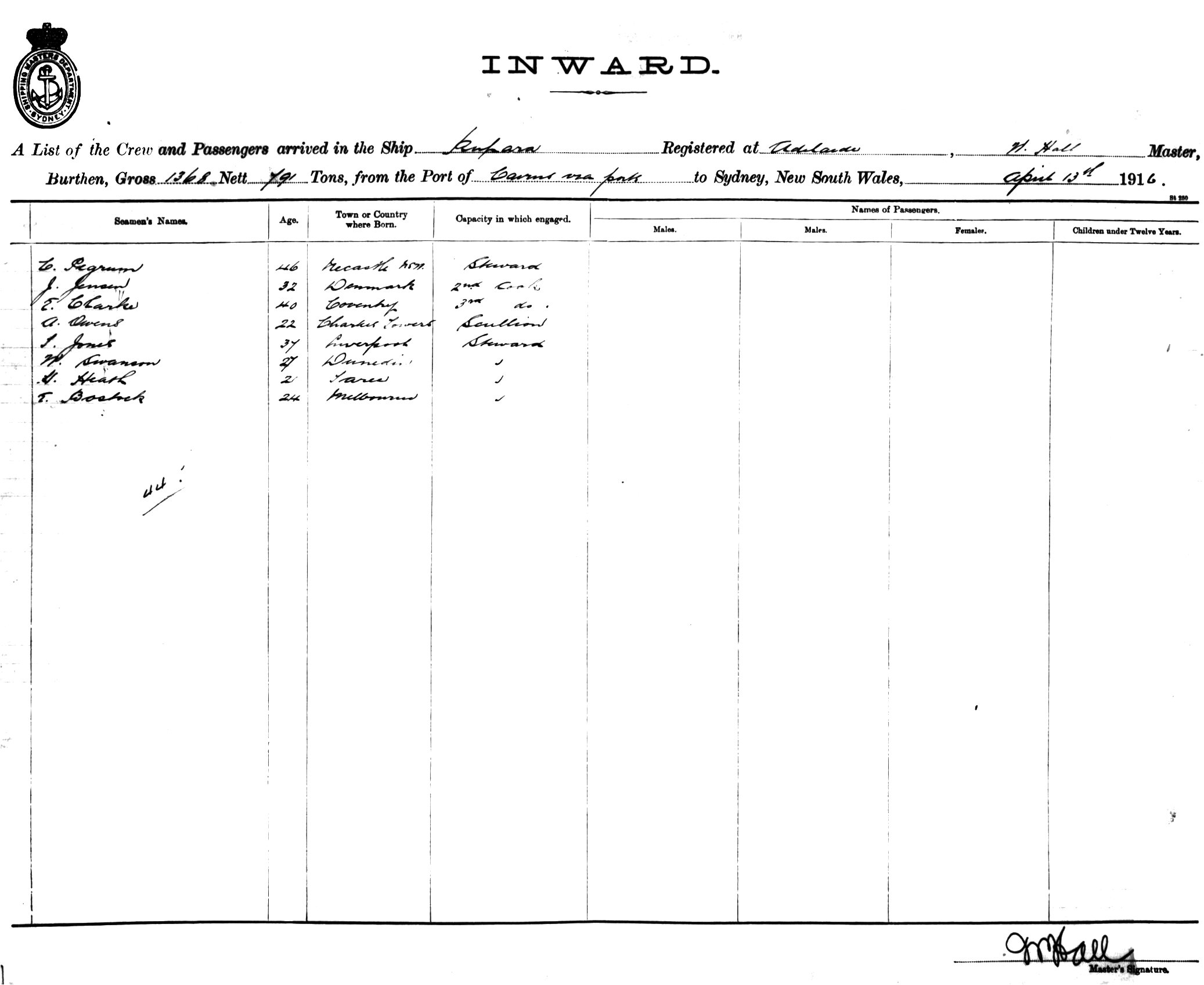 RUPARAOF ADELAIDE, W. HALL, MASTER, BURTHEN 1368/791 TONS FROM THE PORT OF CAIRNS via PORTS TO SYDNEY, NEW SOUTH WALES, 13TH APRIL 1916 |