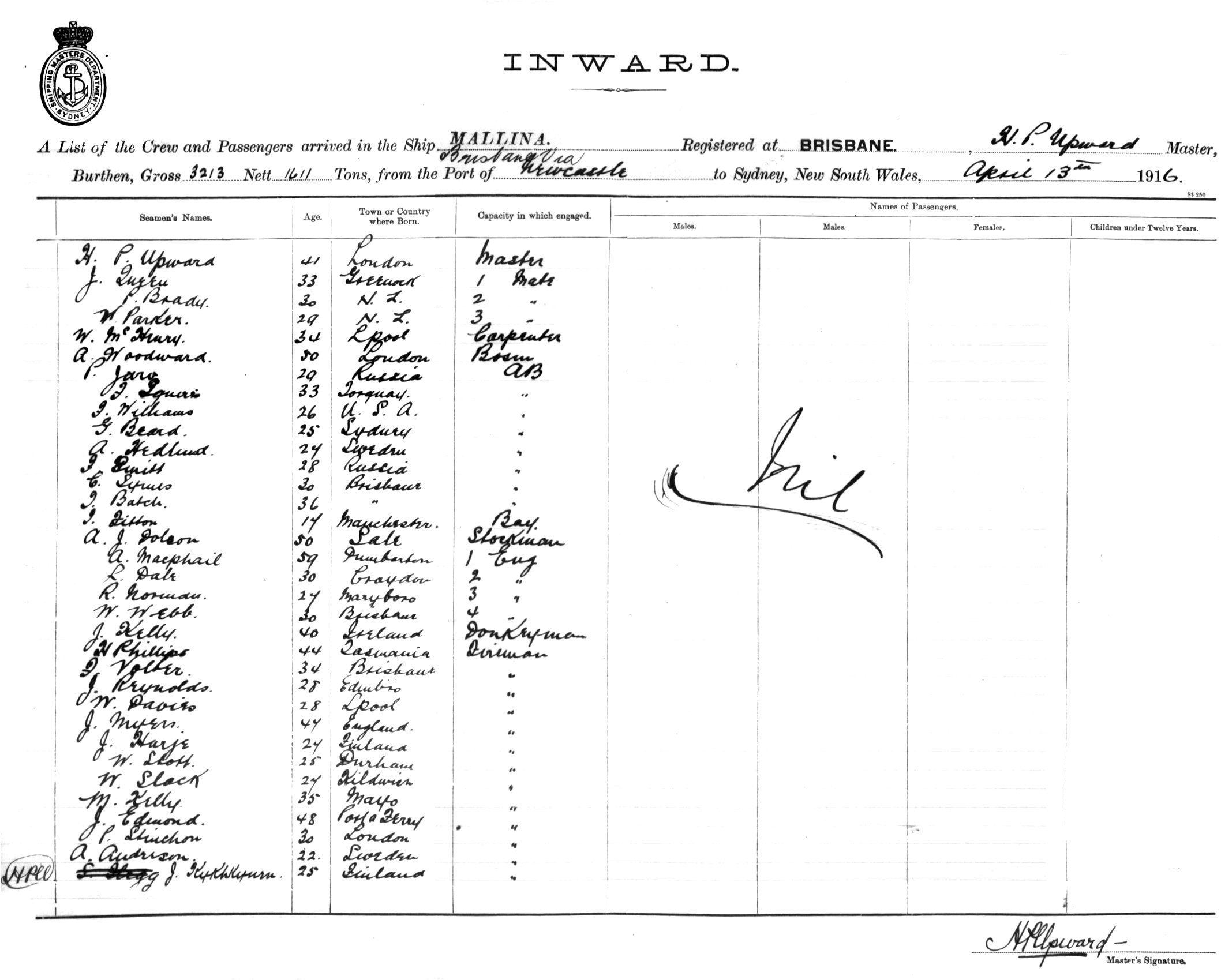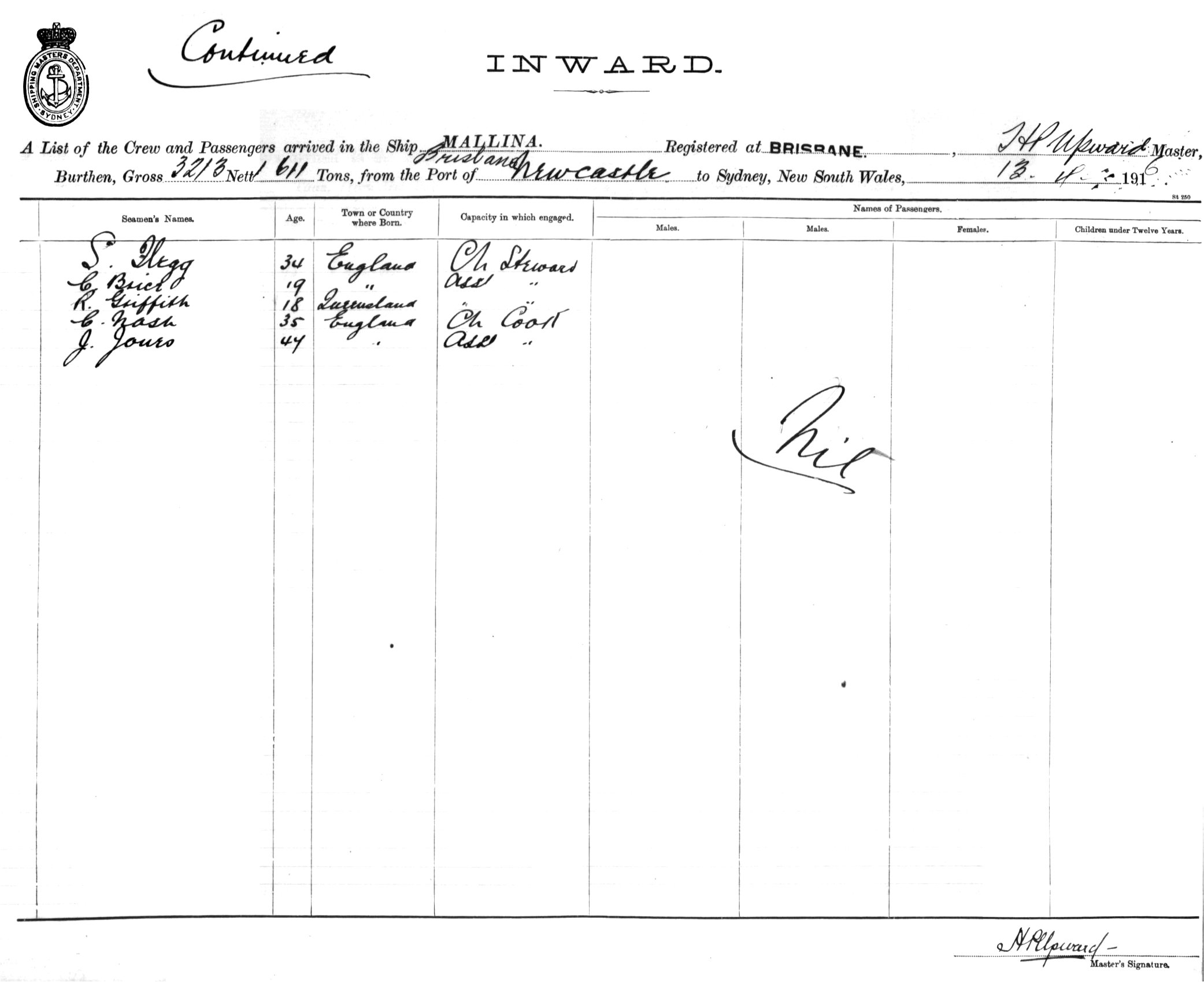MALLINAOF BRISBANE, H. P. UPWARD, MASTER, BURTHEN 3213/1611 TONS FROM THE PORT OF BRISBANE via NEWCASTLE TO SYDNEY, NEW SOUTH WALES, 13TH APRIL 1916 |