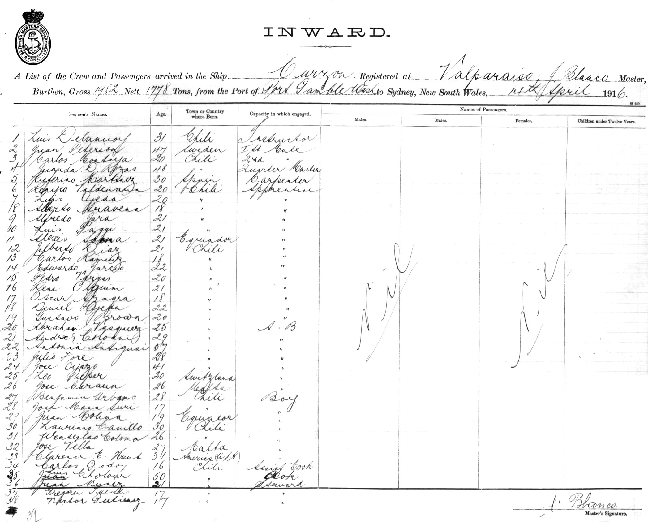 Mariners and ships in Australian Waters | CURZONOF VALPARAISO, CHILE, J. BLANCO, MASTER, BURTHEN 1982/1778 TONS FROM THE PORT OF PORT GAMBLE, WASHINGTON, U.S.A. TO SYDNEY, NEW SOUTH WALES, 14TH APRIL 1916 |