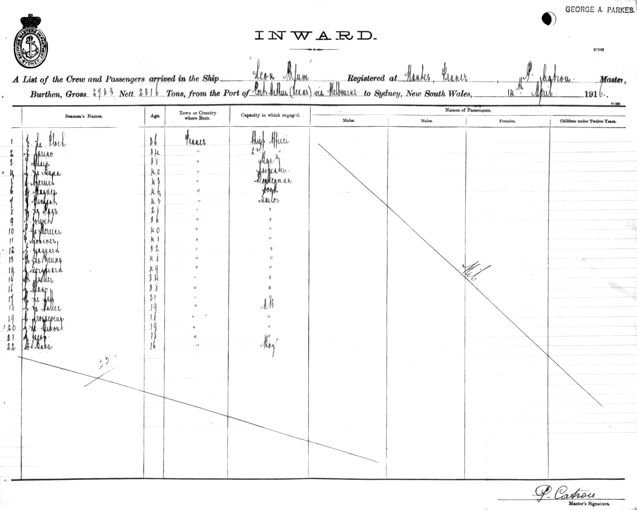 LEON BLUMOF NANTES, FRANCE , P. CATROU, MASTER, BURTHEN 2733/2316 TONS FROM THE PORT OF PORT ARTHUR, TEXAS via MELBOURNE TO SYDNEY, NEW SOUTH WALES, 14TH APRIL 1916 |