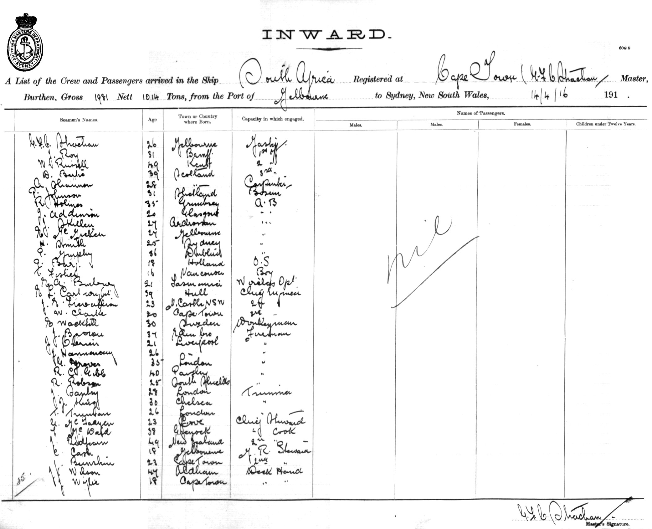 SOUTH AFRICAOF CAPE TOWN, G. F. C. STRACHAN, MASTER, BURTHEN 1981/1014 TONS FROM THE PORT OF MELBOURNE TO SYDNEY, NEW SOUTH WALES, 14TH APRIL 1916 |
