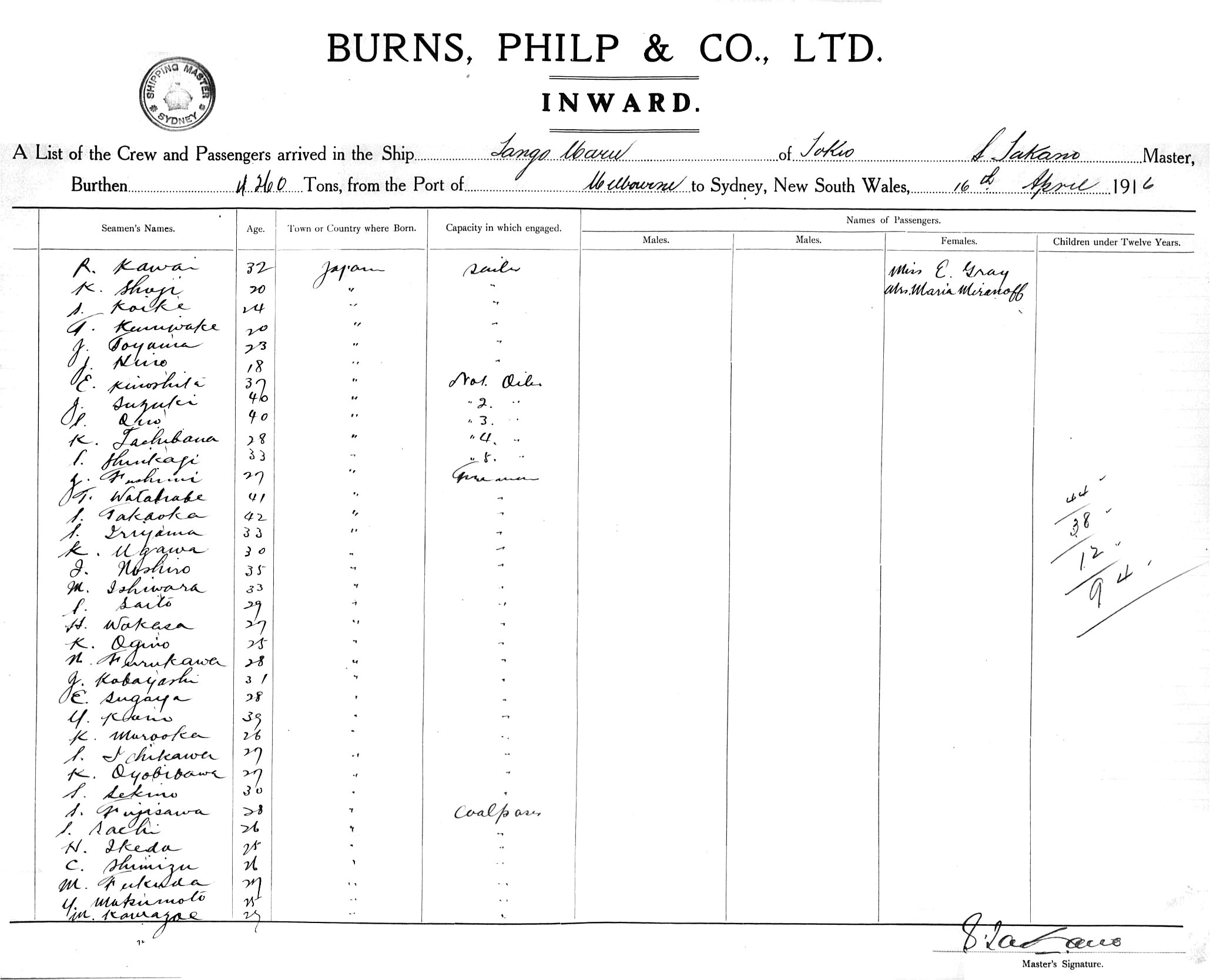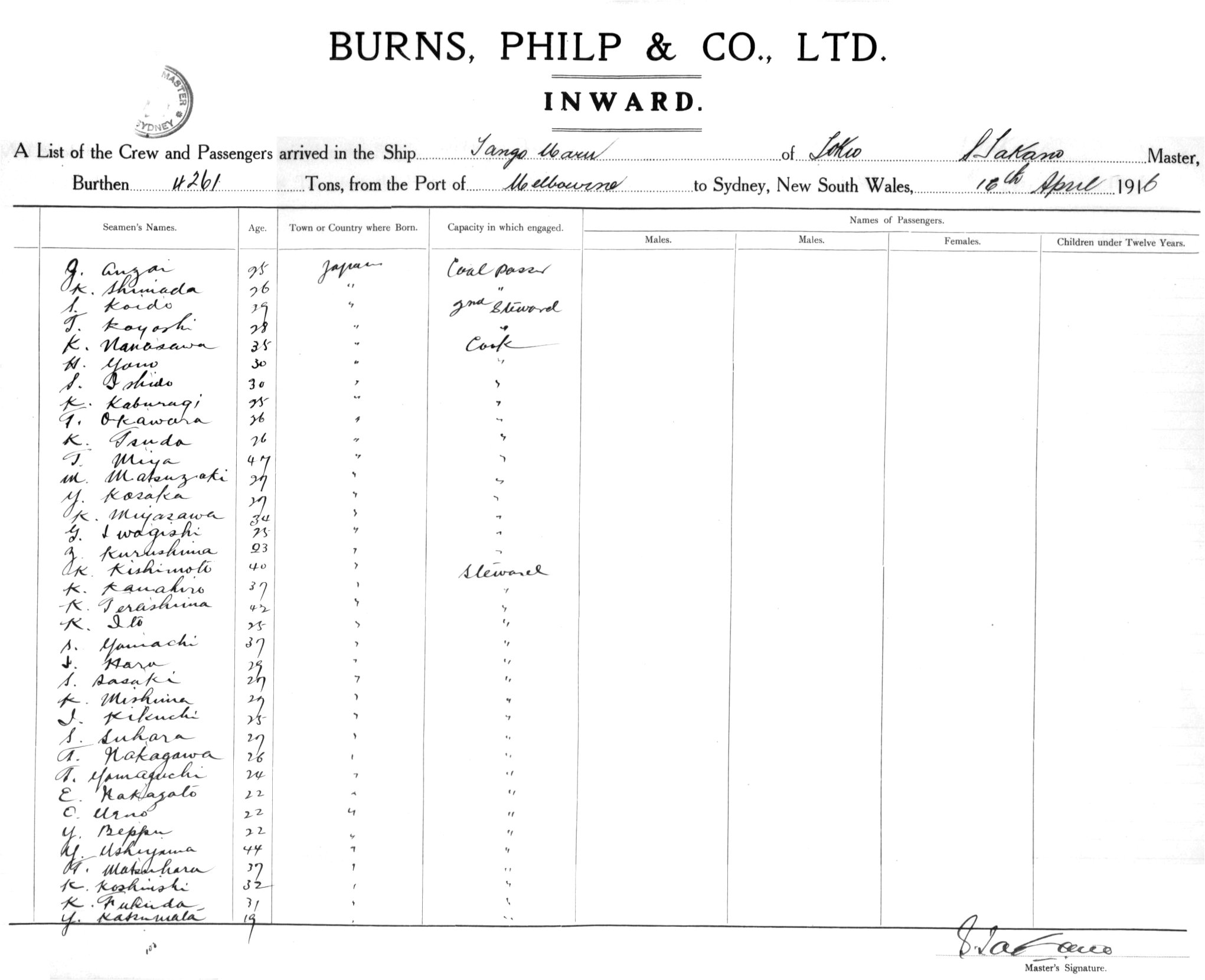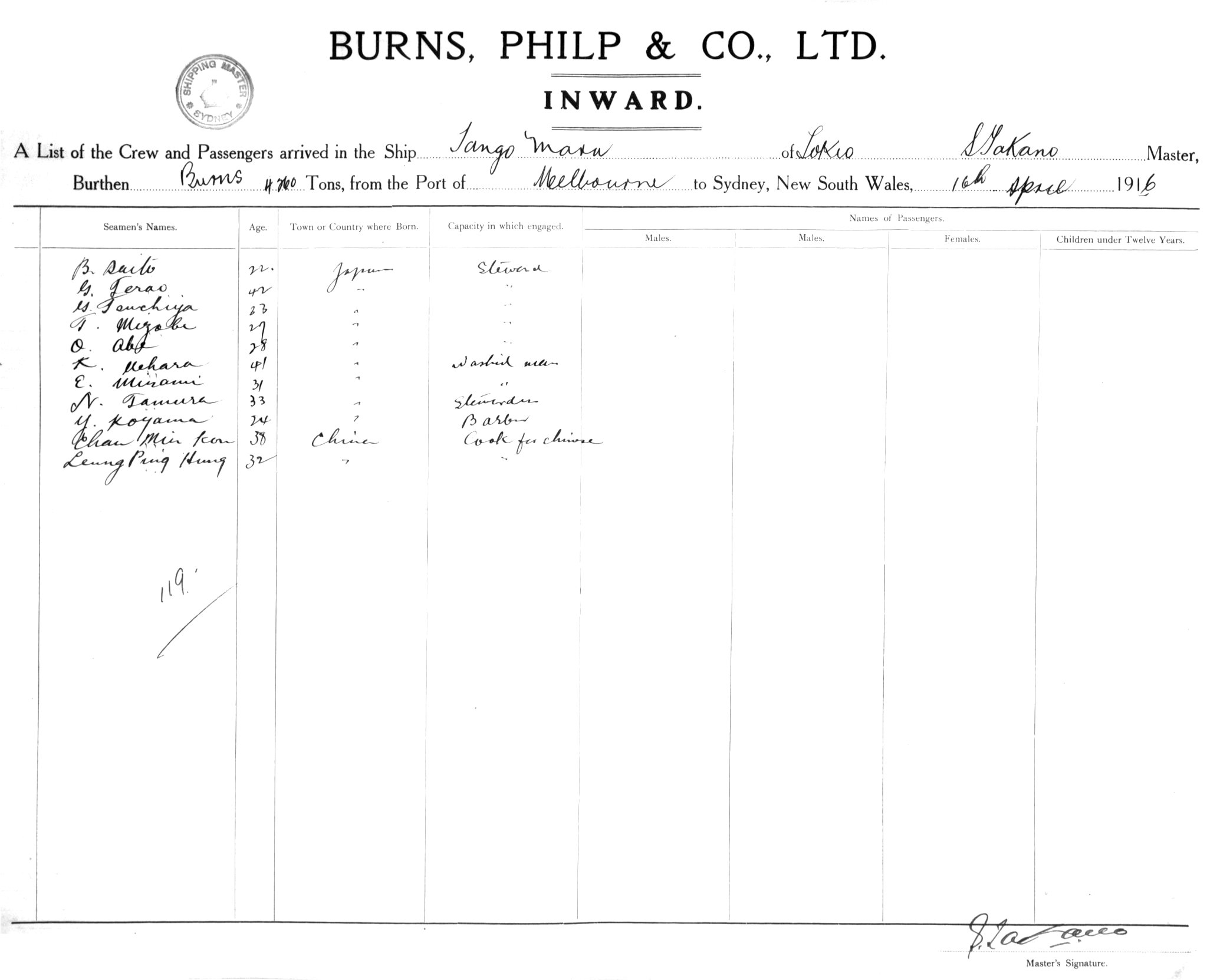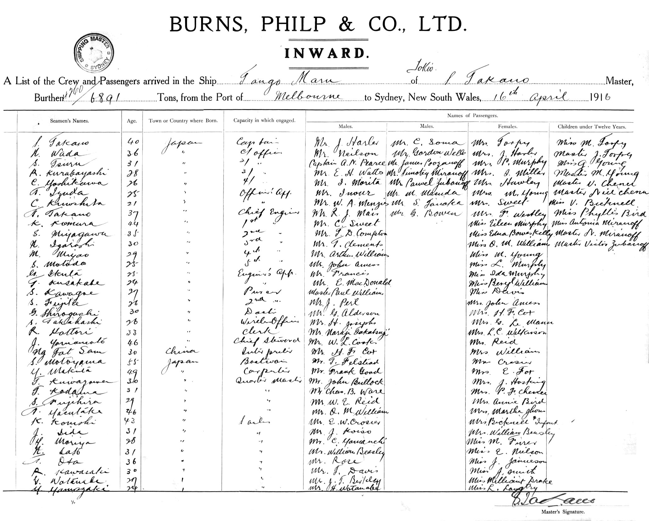 TANGO MARUOF TOKYO, S. TAKANO, MASTER, BURTHEN 4260/6891 TONS FROM THE PORT OF MELBOURNE TO SYDNEY, NEW SOUTH WALES, 16TH APRIL 1916 |