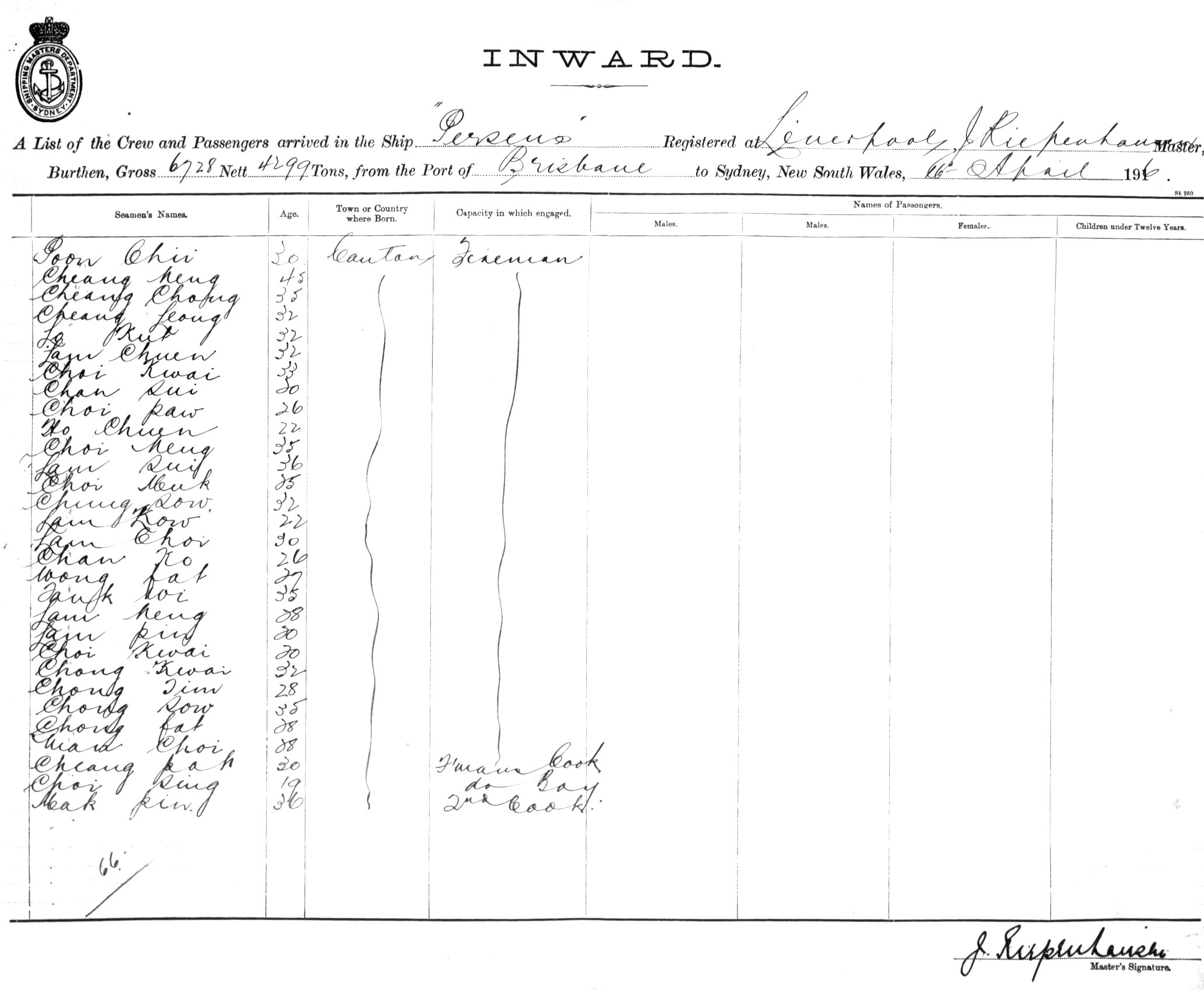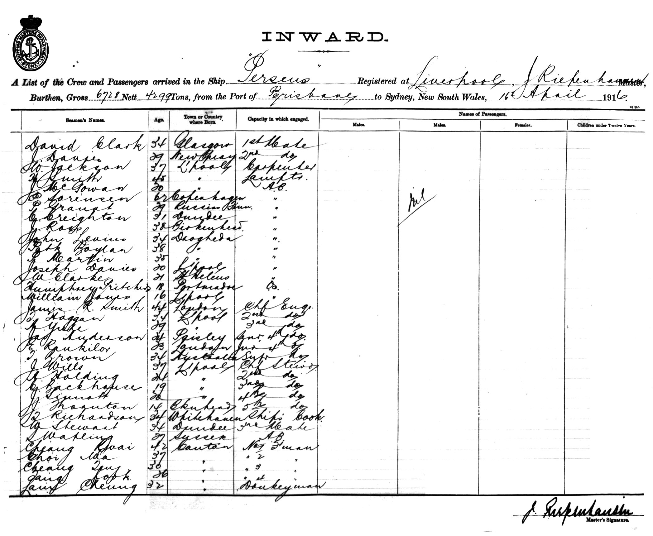 PERSEUSOF LIVERPOOL, J. RIEPENHAUSEN, MASTER, BURTHEN 6728/4299 TONS FROM THE PORT OF BRISBANE TO SYDNEY, NEW SOUTH WALES, 16TH APRIL 1916 |