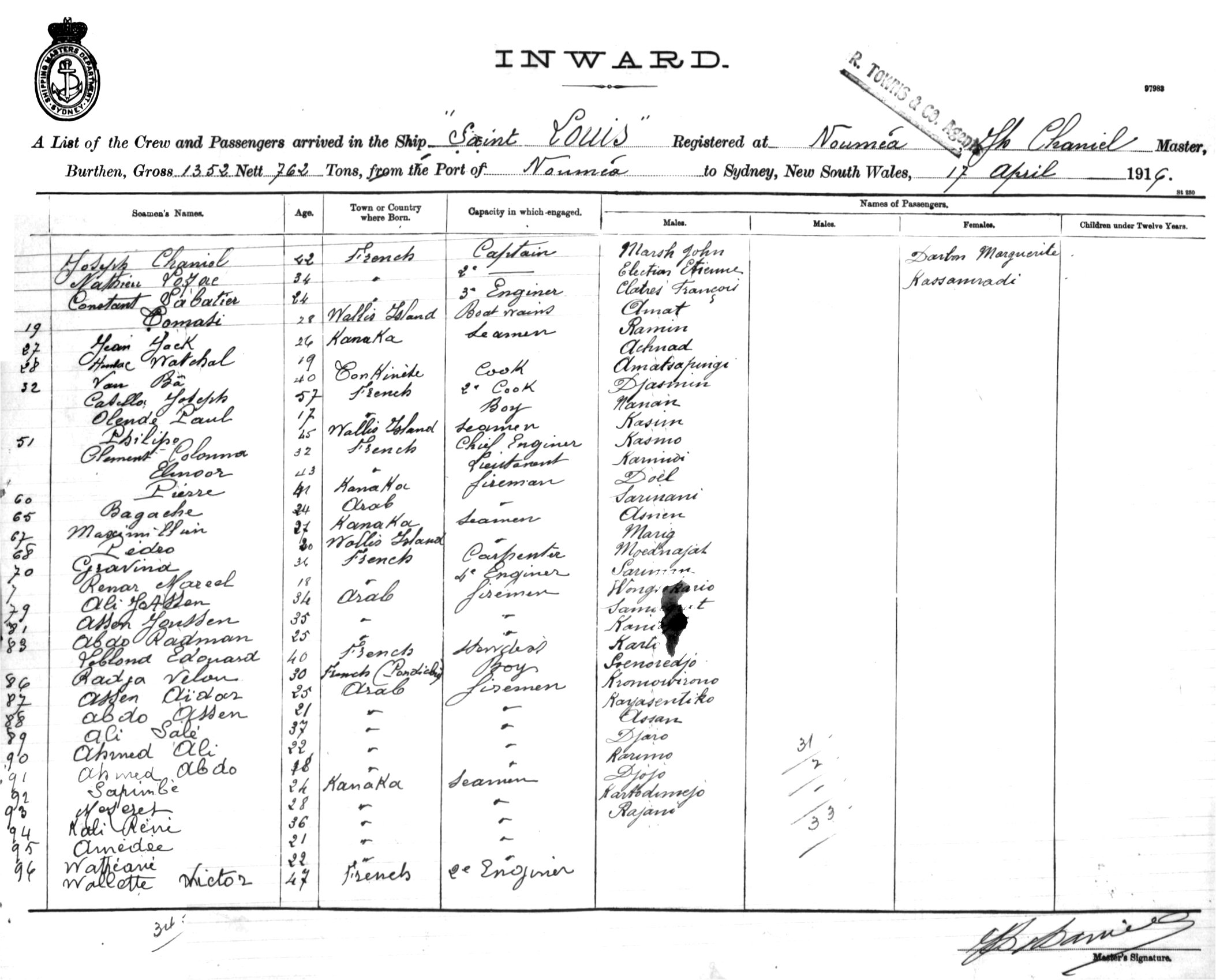 SAINT LOUISOF NOUMEA, JOSEPH CHANIEL, MASTER, BURTHEN 1352/762 TONS FROM THE PORT OF NOUMEA TO SYDNEY, NEW SOUTH WALES, 17TH APRIL 1916 |