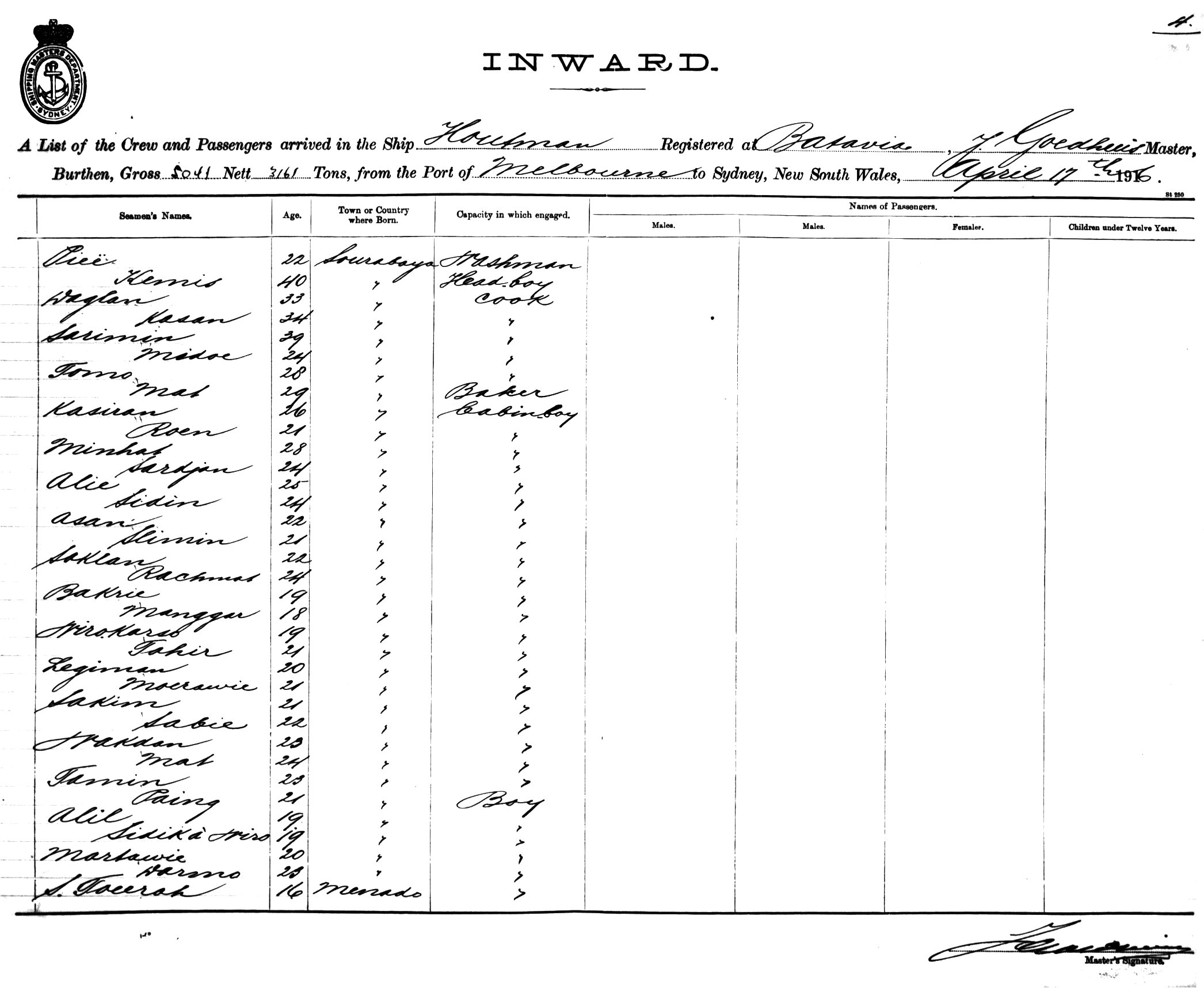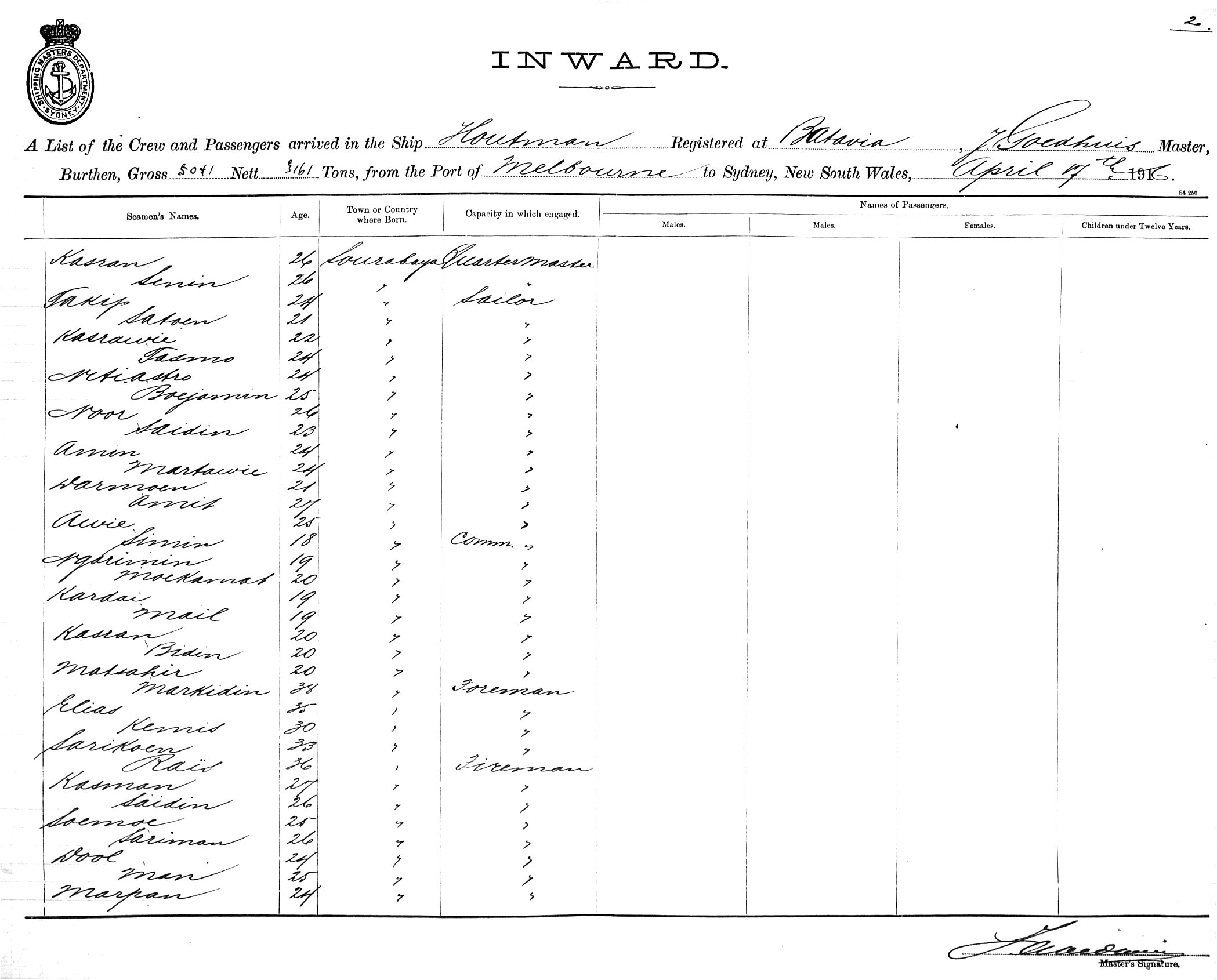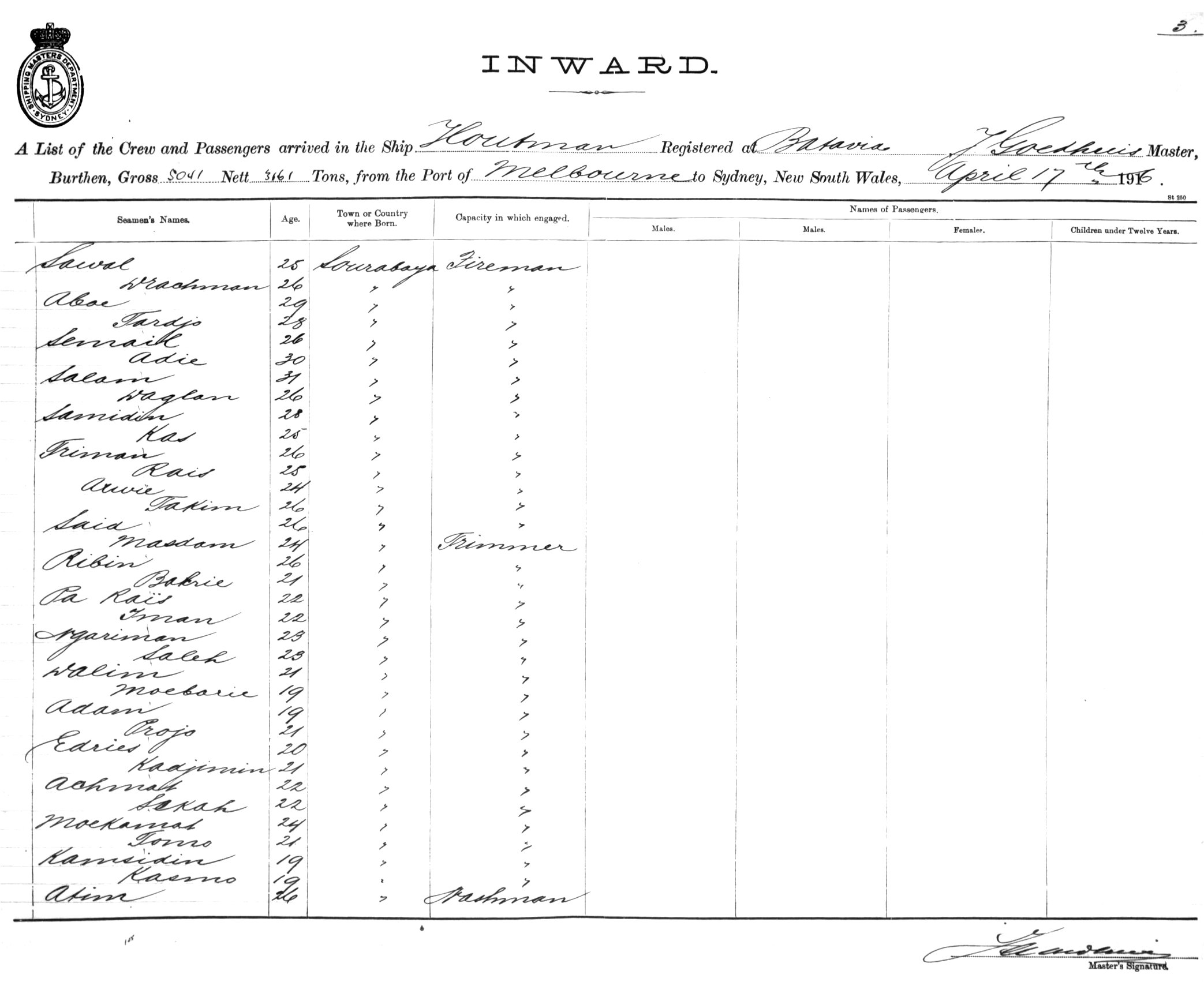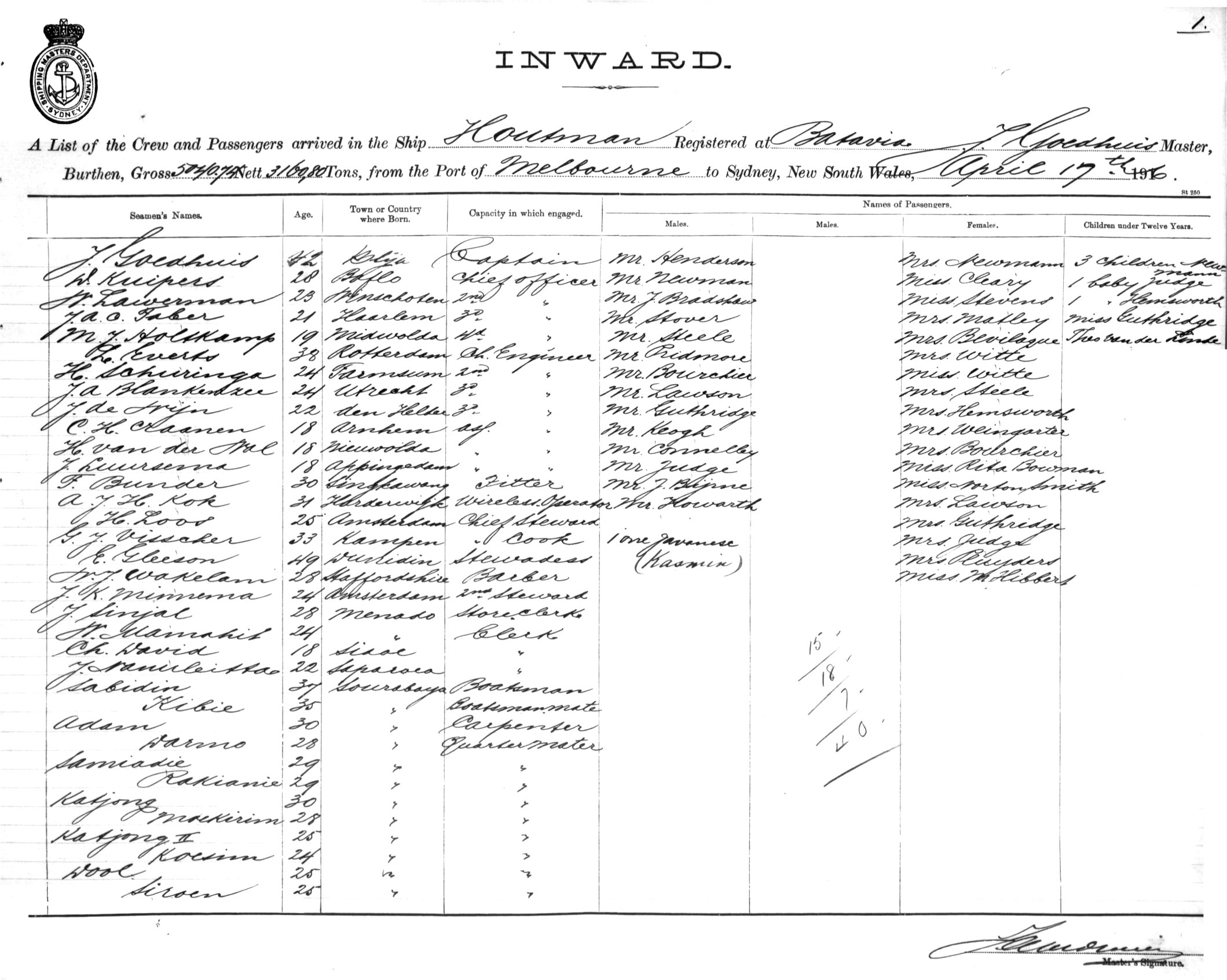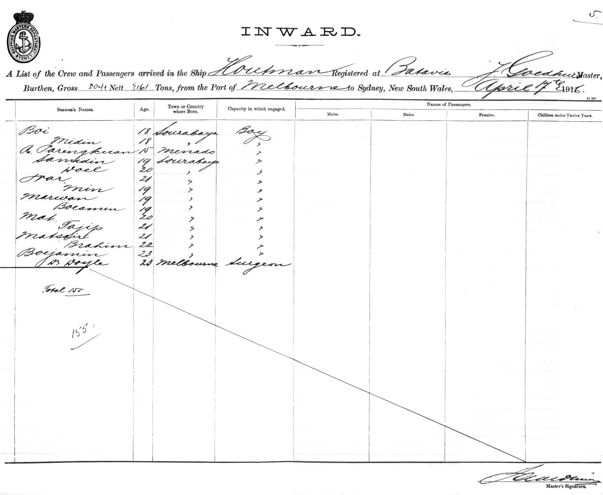 HOUTMANOF BATAVIA, J. GOEDHUIS, MASTER, BURTHEN 5040/3160 TONS FROM THE PORT OF MELBOURNE TO SYDNEY, NEW SOUTH WALES, 17TH APRIL 1916 |