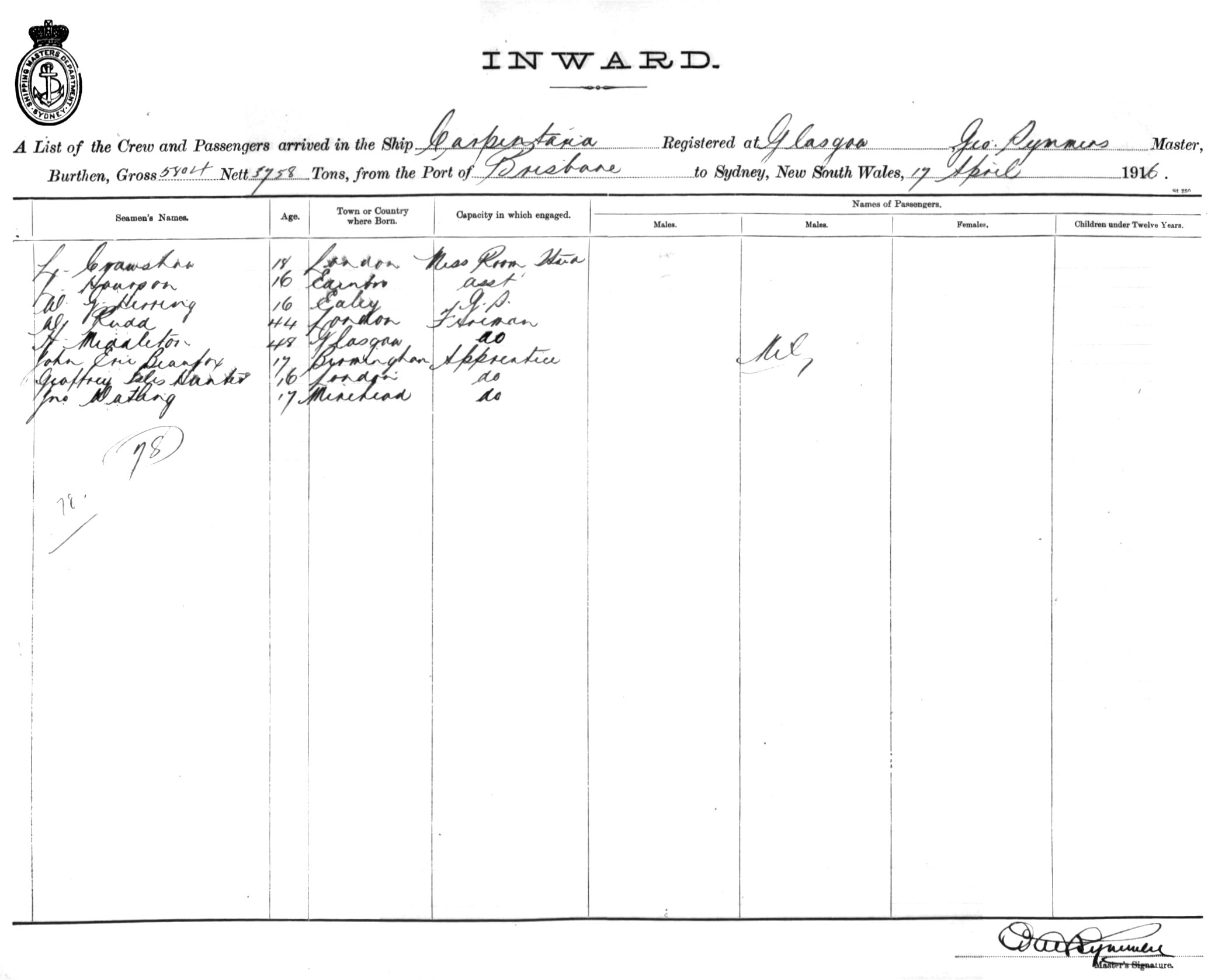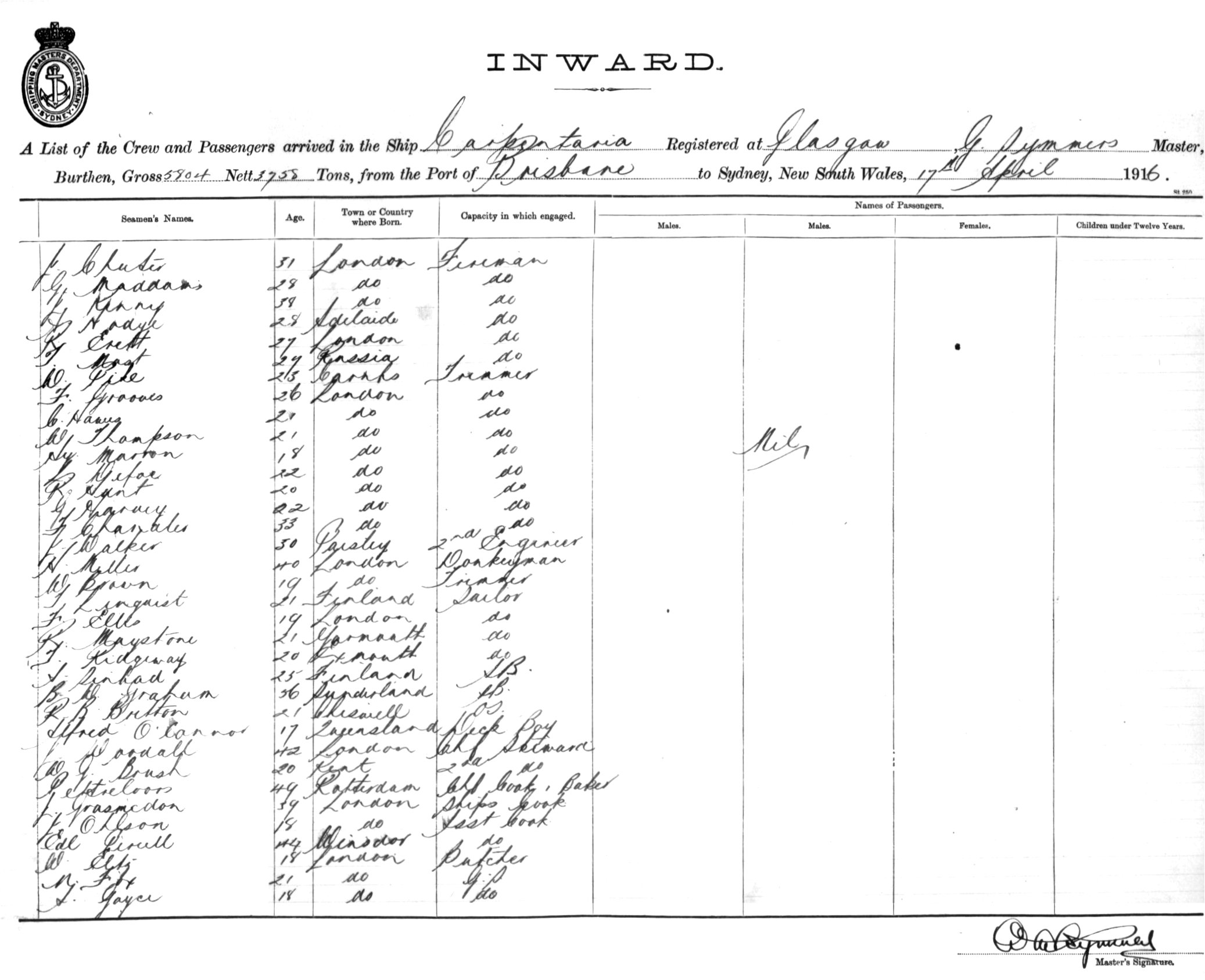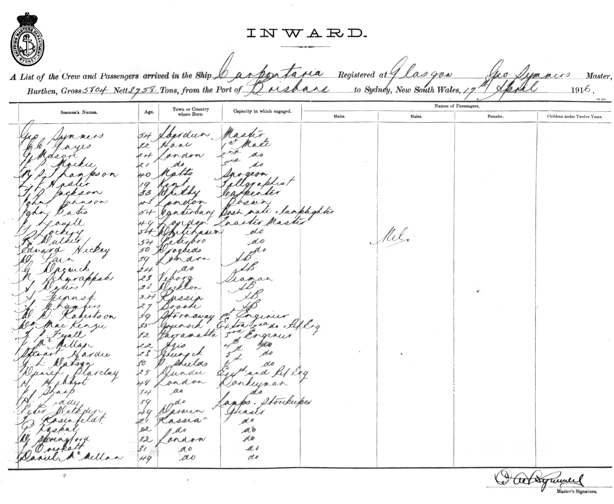CARPENTARIAOF GLASGOW, GEO. SYMMERS, MASTER, BURTHEN 5804/3758 TONS FROM THE PORT OF BRISBANE TO SYDNEY, NEW SOUTH WALES, 17TH APRIL 1916 |